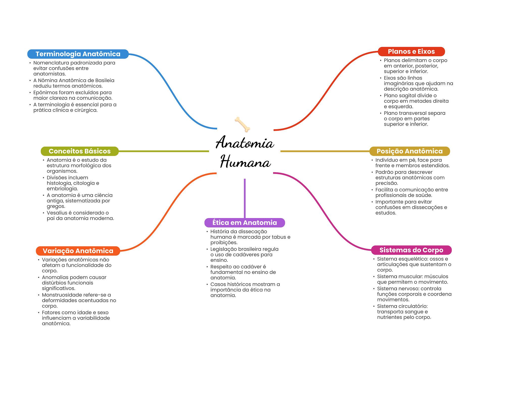 Terminologia Anatômica Planos e Eixos Nomenclatura padronizada para Planos delimitam corpo evitar confusões entre em anterior, posterior, anatomistas. superior e inferior. Eixos são linhas A Nômina Anatômica de Basileia reduziu termos anatômicos. imaginárias que ajudam na descrição anatômica. Epônimos foram excluídos para maior clareza na comunicação. Plano sagital divide o corpo em metades direita A terminologia é essencial para a e esquerda. prática clínica e cirúrgica. Plano transversal separa corpo em partes superior e inferior. Anatomia Conceitos Básicos Posição Anatômica Anatomia é estudo da Humana Indivíduo em pé, face para estrutura morfológica dos frente e membros estendidos. organismos. Padrão para descrever Divisões incluem estruturas anatômicas com histologia, citologia e precisão. embriologia. Facilita a comunicação entre A anatomia é uma ciência profissionais de saúde. antiga, sistematizada por Importante para evitar gregos. confusões em dissecações e Vesalius é considerado estudos. pai da anatomia moderna. Ética em Anatomia História da dissecação humana é marcada por tabus e proibições. Variação Anatômica Legislação brasileira regula Sistemas do Corpo uso de cadáveres para Variações anatômicas não ensino. Sistema esquelético: e afetam a funcionalidade do Respeito ao cadáver é articulações que sustentam corpo. fundamental no ensino de corpo. Anomalias podem causar anatomia. Sistema muscular: músculos distúrbios funcionais Casos históricos mostram a que permitem movimento. significativos. importância da ética na Sistema nervoso: controla Monstruosidade refere-se a anatomia. funções corporais e coordena deformidades acentuadas no movimentos. corpo. Sistema circulatório: Fatores como idade e sexo transporta sangue e influenciam a variabilidade nutrientes pelo corpo. anatômica.