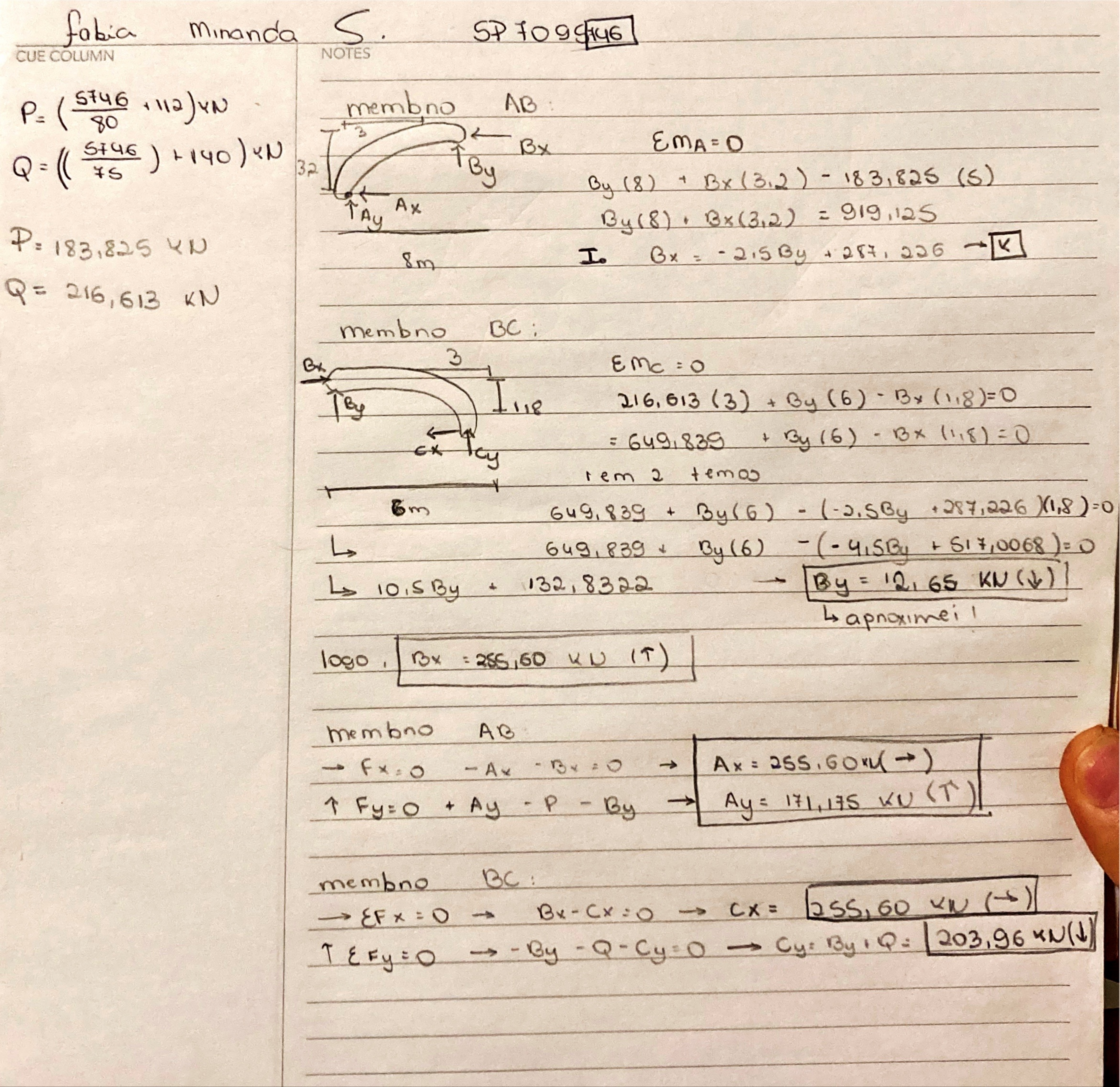 fabia Minanda S. CUE COLUMN NOTES P= ( 5746 80 membno wt Bx EMA = 0 Q = 5746 75 ) 32 By By (8) + Bx (3.2) - 183,825 Ay Ax = 919,125 183,825 8m Bx - y Q= = 216,613 KN membno Bx 3 By 216,613 (3) + By (6) - (1,8)=0 649,839 + By (6) - CX 2 6m 3 649,839 + By(6) - +287,226 )(1,8) 649,839 + By (6) - = 10,5By + 132,8322 By = KN apnoximei logo , Bx KN (T) membno AB Ax ) Fy=0 + Ay - P - By Ay= 171,175 KU (T) membno EF X = CX= = 255,60 - -Q-Cy=0 Cy: By 203,96