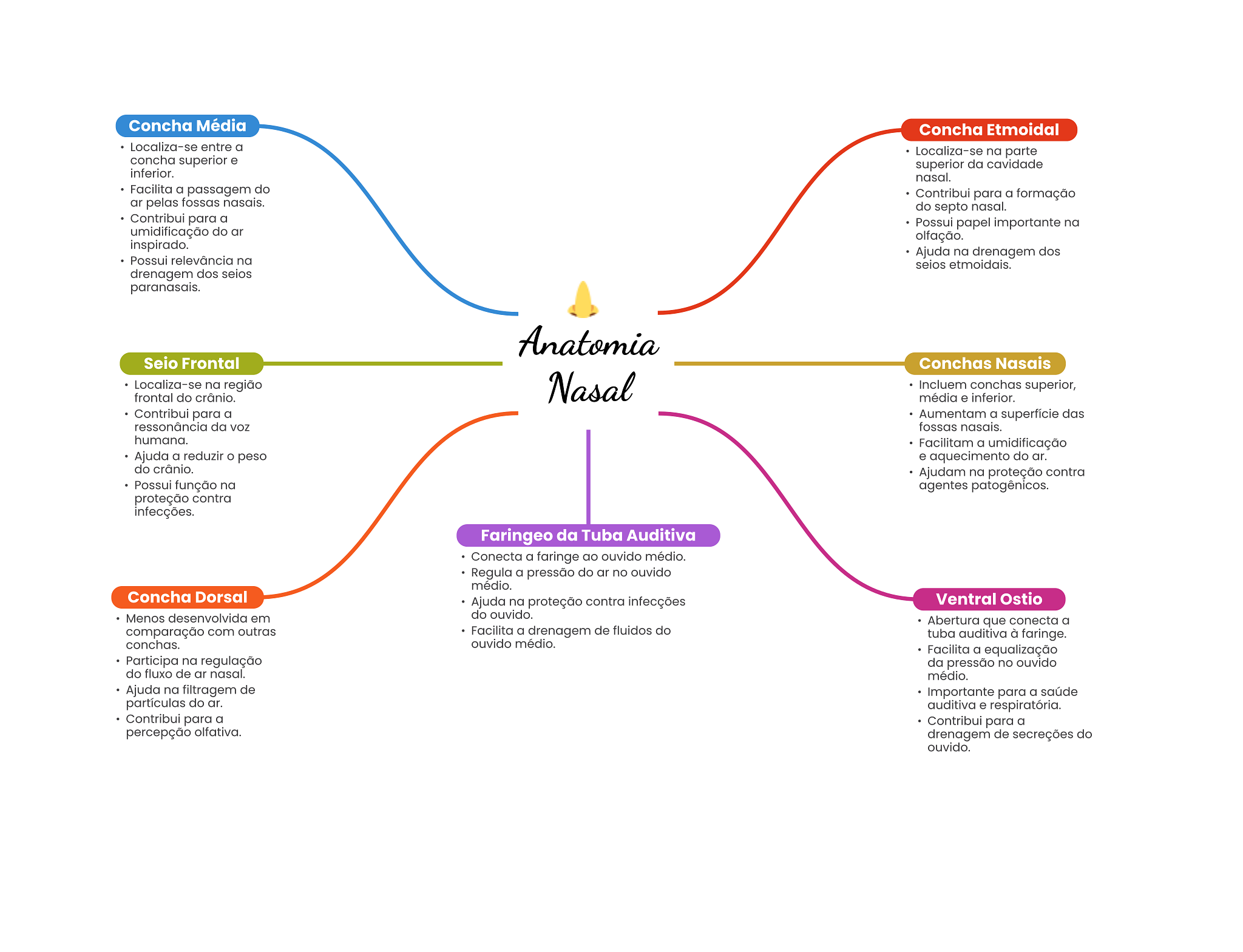 Concha Média Concha Etmoidal Localiza-se entre a Localiza-se na parte concha superior e superior da cavidade inferior. nasal. Facilita a passagem do Contribui para a formação ar pelas fossas nasais. do septo nasal. Contribui para a Possui papel importante na umidificação do ar olfação. inspirado. Ajuda na drenagem dos Possui relevância na seios etmoidais. drenagem dos seios paranasais. Anatomia Seio Frontal Conchas Nasais Localiza-se na região Nasal Incluem conchas superior, frontal do crânio. média e inferior. Contribui para a Aumentam a superfície das ressonância da voz fossas nasais. humana. Facilitam a umidificação Ajuda a reduzir peso e aquecimento do ar. do crânio. Ajudam na proteção contra Possui função na agentes patogênicos. proteção contra infecções. Faringeo da Tuba Auditiva Conecta a faringe ao ouvido médio. Regula a pressão do ar no ouvido médio. Concha Dorsal Ajuda na proteção contra infecções Ventral Ostio Menos desenvolvida em do ouvido. Abertura que conecta a comparação com outras Facilita a drenagem de fluidos do tuba auditiva à faringe. conchas. ouvido médio. Facilita a equalização Participa na regulação da pressão no ouvido do fluxo de ar nasal. médio. Ajuda na filtragem de Importante para a saúde partículas do ar. auditiva e respiratória. Contribui para a Contribui para a percepção olfativa. drenagem de secreções do ouvido.