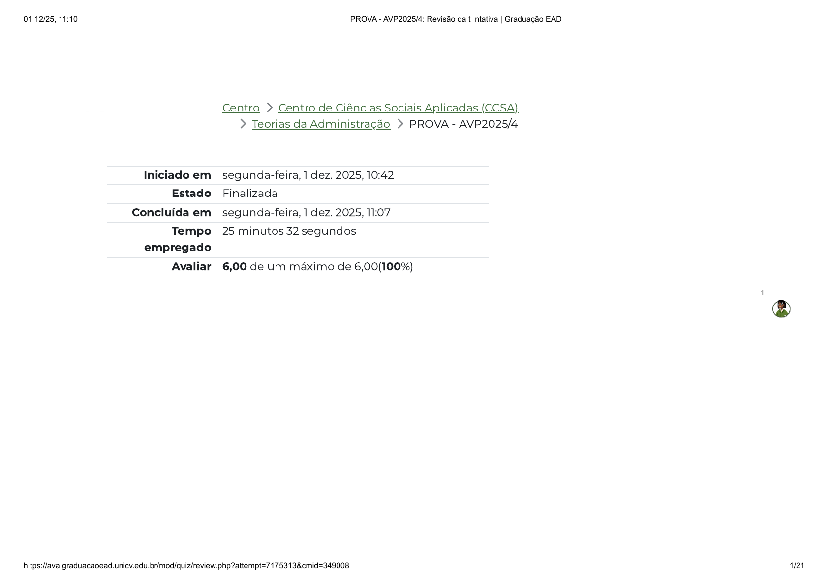 Centro 〉 Centro de Ciências Sociais Aplicadas (CCSA) 〉 Teorias da Administração 〉 PROVA - AVP2025/4 Iniciado em segunda-feira, 1 dez. 2025, 10:42 Estado Finalizada Concluída em segunda-feira, 1 dez. 2025, 11:07 Tempo empregado 25 minutos 32 segundos Avaliar 6,00 de um máximo de 6,00(100%) 1 01/12/25, 11:10 PROVA - AVP2025/4: Revisão da tentativa | Graduação EAD https://ava.graduacaoead.unicv.edu.br/mod/quiz/review.php?attempt=7175313&cmid=349008 1/21 https://ava.graduacaoead.unicv.edu.br/course/index.php?categoryid=267 https://ava.graduacaoead.unicv.edu.br/course/index.php?categoryid=266 https://ava.graduacaoead.unicv.edu.br/course/view.php?id=13200#section-11 Questão 1 Correto Atingiu 0,40 de 0,40 A administração sistêmica é decorrência da Teoria Geral dos Sistemas, elaborada por Ludwig Von Bertalanffy. Sua teoria apresenta uma abordagem interdisciplinar com o objetivo de “[...] transcender os problemas exclusivos de cada ciência e proporcionar princípios gerais e modelos gerais para todas as ciências envolvidas" (CHIAVENATO, 2003, p. 410). Tendo com base a abordagem sistêmica, julgue as afirmações abaixo: I. Homeostase - é a tendência do sistema manter seu estado de equilíbrio. II. Morfogênese - mudança realizada pelo sistema para ajustar aos padrões apresentados pelo ambiente. III. Adaptabilidade - capacidade de alterar a estrutura da organização. São corretas as afirmações: Escolha uma opção: a. Apenas a I ✓ b. I e III c. Apenas a III d. Apenas a II 1 01/12/25, 11:10 PROVA - AVP2025/4: Revisão da tentativa | Graduação EAD https://ava.graduacaoead.unicv.edu.br/mod/quiz/review.php?attempt=7175313&cmid=349008 2/21 e. I e II 1 01/12/25, 11:10 PROVA - AVP2025/4: Revisão da tentativa | Graduação EAD https://ava.graduacaoead.unicv.edu.br/mod/quiz/review.php?attempt=7175313&cmid=349008 3/21 Questão 2 Correto Atingiu 0,40 de 0,40 O psicólogo americano Abraham Maslow (1908-1970) é um expoente da chamada Psicologia Humanista e se notabilizou por seus estudos sobre a motivação. Maslow descreveu a motivação em termos de uma divisão hierárquica das necessidades humanas, que ele nomeou Hierarquia das Necessidades. De acordo com a teoria de Maslow, analise as afirmativas a seguir: I. As necessidades vitais dos seres humanos são chamadas de necessidades de segurança, como alimentação e sono; II. As necessidades sociais são de associação, participação, aceitação, ou seja, a necessidade de relacionamento com membros de determinado grupo, de afeto; III. O autor sugere que o indivíduo avança para a próxima necessidade apenas quando satisfez a anterior. São afirmações verdadeiras: Escolha uma opção: a. I e III b. Apenas a I c. II e III ✓ d. Apenas a II 1 01/12/25, 11:10 PROVA - AVP2025/4: Revisão da tentativa | Graduação EAD https://ava.graduacaoead.unicv.edu.br/mod/quiz/review.php?attempt=7175313&cmid=349008 4/21 Questão 3 Correto Atingiu 0,40 de 0,40 e. Todas as afirmações A atividade descrita por Lacombe e Heilborn (2015, p. 171), como: “acompanhar ou medir alguma coisa, comparar resultados obtidos com previstos e tomar medidas corretivas cabíveis”, refere-se a: Escolha uma opção: a. Organização b. Checagem c. Planejamento d. Direção e. Controle ✓ 1 01/12/25, 11:10 PROVA - AVP2025/4: Revisão da tentativa | Graduação EAD https://ava.graduacaoead.unicv.edu.br/mod/quiz/review.php?attempt=7175313&cmid=349008 5/21 Questão 4 Correto Atingiu 0,40 de 0,40 A atividade de organização é muito importante para o desempenho das atividades organizacionais. A mesma consiste em preparar a estrutura para o desempenho das ações, desde mão-de-obra até matéria-prima e equipamentos. Neste momento, temos uma ferramenta fundamental para a programação de datas e prazos, e acompanhamento das etapas e ações. Essa ferramenta é conhecida como: Escolha uma opção: a. Kanban b. Organograma c. Cronograma ✓ d. Mapa Mental e. SWOT 1 01/12/25, 11:10 PROVA - AVP2025/4: Revisão da tentativa | Graduação EAD https://ava.graduacaoead.unicv.edu.br/mod/quiz/review.php?attempt=7175313&cmid=349008 6/21 Questão 5 Correto Atingiu 0,40 de 0,40 Os estudos das teorias se debruçaram a compreender também formas de incentivar os colaboradores a aumentarem a produtividade. Sobre esta questão é correto afirmar: Escolha uma opção: a. A teoria da burocracia destaca a motivação por meio de incentivos sociais, entendendo cada colaboradora como único na empresa e dependente de um tratamento personalizado b. A abordagem clássica ressalta que os colaboradores não precisam de incentivo para aumento de produtividade, visto que funcionam como máquinas então apresentam produção constante c. A teoria das relações humanas entende que mesmo que os colaboradores valorizem as relações humanas nas organizações, são os fatores econômicos que os motivam quanto ao aumento da produtividade d. A abordagem estruturalista entende que estes colaboradores podem ser incentivados de diferentes maneiras, tanto econômicas como sociais. ✓ 1 01/12/25, 11:10 PROVA - AVP2025/4: Revisão da tentativa | Graduação EAD https://ava.graduacaoead.unicv.edu.br/mod/quiz/review.php?attempt=7175313&cmid=349008 7/21 e. A abordagem científica da administração, proposta por Henri Fayol, ressalta que os colaboradores são motivados por aspectos econômicos 1 01/12/25, 11:10 PROVA - AVP2025/4: Revisão da tentativa | Graduação EAD https://ava.graduacaoead.unicv.edu.br/mod/quiz/review.php?attempt=7175313&cmid=349008 8/21 Questão 6 Correto Atingiu 0,40 de 0,40 De acordo com Lacombe e Heilborn (2015, p. 171) a atividade de controle refere-se a “acompanhar ou medir alguma coisa, comparar resultados obtidos com previstos e tomar medidas corretivas cabíveis”. Diante deste contexto, avalie as proposições abaixo: I. Os indicadores de gestão podem ser considerados uma ferramenta de controle. PORQUE II. Permitem a mensuração dos resultados da ação. 