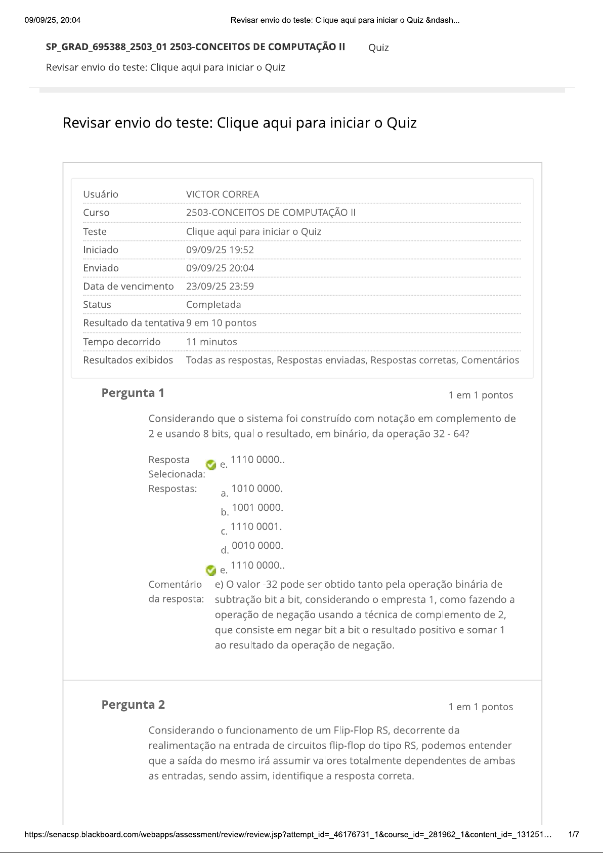 09/09/25, 20:04 Revisar envio do teste: Clique aqui para iniciar Quiz &ndash... SP_GRAD_695388_2503_01 2503-CONCEITOSDE COMPUTAÇÃO II Quiz Revisar envio do teste: Clique aqui para iniciar Quiz Revisar envio do teste: Clique aqui para iniciar Quiz Usuário VICTOR CORREA Curso 2503-CONCEITOS DE COMPUTAÇÃO Teste Clique aqui para iniciar Quiz Iniciado 09/09/25 19:52 Enviado 09/09/25 20:04 Data de vencimento 23/09/25 23:59 Status Completada Resultado da tentativa 9 em 10 pontos Tempo decorrido 11 minutos Resultados exibidos Todas as respostas, Respostas enviadas, Respostas corretas, Comentários Pergunta 1 1 em 1 pontos Considerando que sistema foi construído com notação em complemento de 2 e usando 8 bits, qual resultado, em binário, da operação 32 64? Resposta e. Selecionada: Respostas: 1010 0000. a. b. 1001 0000. C. 0010 0000. d. e. Comentário e) valor -32 pode ser obtido tanto pela operação binária de da resposta: subtração bit a bit, considerando empresta 1, como fazendo a operação de negação usando a técnica de complemento de 2, que consiste em negar bit a bit resultado positivo e somar 1 ao resultado da operação de negação. Pergunta 2 1 em 1 pontos Considerando funcionamento de um Flip-Flop RS, decorrente da realimentação na entrada de circuitos flip-flop do tipo RS, podemos entender que a saída do mesmo irá assumir valores totalmente dependentes de ambas as entradas, sendo assim, identifique a resposta correta. 1/709/09/25, 20:04 Revisar envio do teste: Clique aqui para iniciar Quiz &ndash... Resposta Num flip-flop do tipo RS a combinação e R= 1 Selecionada: não é permitida e estado do flip-flop fica instável. a. Respostas: Num flip-flop do tipo RS a combinação e R 1 não é permitida e estado do flip-flop fica instável. a. Num flip-flop do tipo RS, se colocarmos S=1eR=0a b. saída Q será igual a 0. Num flip-flop do tipo RS, se colocarmos S=0eR=1a C. saída Q será igual a 1. Num flip-flop do tipo RS, se colocarmos S=0eR=0a d. saída Q será invertida. Se com R = 0 e S = 0 valor de Q está em 1, e em seguida Ré modificado para R = 1, valor de Q continua em Q = 1. e. Comentário da a) Em um flip-flop RS é S = 1 e R = proibido pois resposta: circuito fica instável. Pergunta 3 1 em 1 pontos Em uma ULA de 8 bits, se a função selecionada for de operação XOR, e os valores nas entradas forem respectivamente A = 00110001 e = 01101101, qual será a saída? Resposta 01011100. Selecionada: Respostas: 00100001. a. b. 01111101. 01011100. C. d. 00110001. 11001110. e. Comentário da c) A tabela verdade da operação XOR define que se os bits de resposta: entrada são iguais, a saída é 0, e se são diferentes, a saída é 1, a operação é feita bit a bit e apresenta resultado da alternativa Pergunta 4 1 em 1 pontos Considerando um flip-flop JK com clock sensível na subida, assinale a alternativa correta. Resposta Se valor de Q está em 1, e aplicamos J Selecionada: será modificado para 0 na transição do clock de 0 para 1. e. Respostas: Num flip-flop do tipo JK a combinação J = 1 e K proibida e a saída fica instável na transição do clock de 0 para 1. a. 2/709/09/25, 20:04 Revisar envio do teste: Clique aqui para iniciar Quiz &ndash... Num flip-flop do tipo JK, se colocarmos J b. saída Q será igual a 1 na transição do clock de 1 para 0. Num flip-flop do tipo JK, se colocarmos C. saída Q será igual a 0 na transição do clock de 1 para 0. Num flip-flop do tipo JK, se colocarmos J saída Q será invertida na transição do clock de 0 para d. 1. Se valor de Q está em 1, e aplicamos J = 0 e = 1, Q será modificado para 0 na transição do clock de 0 para 1. e. Comentário da e) O flip-flop JK com clock sensível na subida vai alterar a resposta: saída na transição de 0 para 1 do clock, que corresponde à borda de subida. Pergunta 5 1 em 1 pontos resultado da subtração binária do valor A = 0010 por = 0100, em um sistema que usa a notação de complemento de 2, é igual a: Resposta 1110. Selecionada: Respostas: a. 1010. b. 1001. 1110. d. 0010. 1100. e. Comentário da c) Em decimal, a operação proposta é igual a 2 menos 4, que resposta: dá valor -2. O valor de menos 2 em binário é 1110 em um sistema de 4 bits. Pergunta 6 1 em 1 pontos Assinale a afirmação verdadeira sobre uma Unidade Lógico Aritmética. Resposta d. Não registra valor da entrada na subida do clock. Selecionada: Respostas: Não pode ser usada para fazer operações matemáticas. a. b. Não pode ser usada para fazer operações lógicas. Não pode ser usada para fazer a operação XOR entre dois números. C. d. Não registra valor da entrada na subida do clock. Não pode ser usada para fazer uma soma. e. Comentário da d) Uma Unidade lógico aritmética é um circuito resposta: combinacional, não armazena valores. 3/709/09/25, 20:04 Revisar envio do teste: Clique aqui para iniciar Quiz &ndash... Pergunta 7 1 em 1 pontos Em uma ULA de 8 bits, se a função selecionada for de operação AND, e os valores nas entradas forem respectivamente 00110001 e = 01101101, qual será a saída? Resposta 00100001. a. Selecionada: Respostas: 00100001. a. b. 01111101. 10011100. d. 00110001. 00010001. e. Comentário da a) A operação lógica AND bit a bit faz com que apenas se os resposta: respectivos bits em A e estiverem em 1, isso ocorre em apenas dois dos bits. Pergunta 8 1 em 1 pontos Qual é a expressão lógica do circuito a seguir? A S Resposta a. Selecionada: Respostas: a. b. S=A+B+C d. e. Comentário da a) O circuito da figura que corresponde à expressão S é igual resposta: a um AND de com 0 resultado de uma OR entre A e B. Pergunta 9 0 em 1 pontos A partir da universalidade das portas NAND, identifique circuito equivalente a: 4/709/09/25, 20:04 Revisar envio do teste: Clique aqui para iniciar o Quiz &ndash... A S D Contextualizando as respostas a seguir: Todas as portas lógicas dos circuitos das respostas são portas NAND, algumas estão com as portas em curto-circui