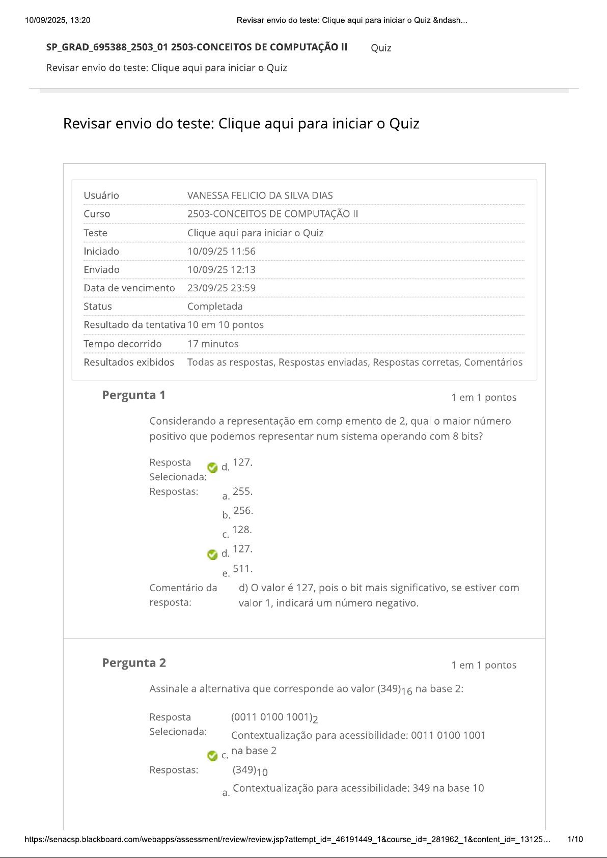 10/09/2025, 13:20 Revisar envio do teste: Clique aqui para iniciar Quiz &ndash... COMPUTAÇÃO II Quiz Revisar envio do teste: Clique aqui para iniciar Quiz Revisar envio do teste: Clique aqui para iniciar Quiz Usuário VANESSA FELICIO DA SILVA DIAS Curso 2503-CONCEITOS DE COMPUTAÇÃO Teste Clique aqui para iniciar Quiz Iniciado 10/09/25 11:56 Enviado 10/09/25 12:13 Data de vencimento 23/09/25 23:59 Status Completada Resultado da tentativa 10 em 10 pontos Tempo decorrido 17 minutos Resultados exibidos Todas as respostas, Respostas enviadas, Respostas corretas, Comentários Pergunta 1 1 em 1 pontos Considerando a representação em complemento de 2, qual maior número positivo que podemos representar num sistema operando com 8 bits? Resposta d. 127. Selecionada: Respostas: 255. a. b. 256. 128. C. d. 127. e. 511. Comentário da d) valor é 127, pois bit mais significativo, se estiver com resposta: valor 1, indicará um número negativo. Pergunta 2 1 em 1 pontos Assinale a alternativa que corresponde ao valor (349)16 na base 2: Resposta (0011 0100 1001)₂ Selecionada: Contextualização para acessibilidade: 0011 0100 1001 na base 2 Respostas: a. Contextualização para acessibilidade: 349 na base 10 1/1010/09/2025, 13:20 Revisar envio do teste: Clique aqui para iniciar o Quiz &ndash... (AF5)16 Contextualização para acessibilidade: AF5 na base b. hexadecimal (0011 0100 Contextualização para acessibilidade: 0011 0100 1001 na base 2 C. (840)10 d. Contextualização para acessibilidade: 840 na base 10 (1010 0100 Contextualização para acessibilidade: 1010 0100 1001 e. na base 2 Comentário da C) valor 349 na base hexadecimal corresponde ao valor resposta: 0011 0100 1001 na base 2. Pergunta 3 1 em 1 pontos Analise a tabela verdade a seguir e indique a alternativa com circuito que a implementa. A B D S 0 0 0 0 0 0 0 0 1 0 0 0 1 0 0 0 0 1 1 0 0 1 0 0 0 0 1 0 1 0 0 1 1 0 0 0 1 1 1 0 1 0 0 0 0 1 0 0 1 0 1 0 1 0 0 1 0 1 1 0 1 1 0 0 1 1 1 0 1 0 1 1 1 0 0 1 1 1 1 0 2/1010/09/2025, 13:20 Revisar envio do teste: Clique aqui para iniciar o Quiz &ndash... A) A S D B) A S D C) A S D 3/1010/09/2025, 13:20 Revisar envio do teste: Clique aqui para iniciar o Quiz &ndash... D) A S D E) A S D Resposta Imagem C) C. Selecionada: Respostas: a. Imagem A) b. Imagem B) Imagem C) C. d. Imagem D) Imagem E) e. Comentário da c) aluno pode simplificar a alternativa para a expressão resposta: A.B.C.D que é a mesma expressão que ele pode obter diretamente da tabela verdade. Pergunta 4 1 em 1 pontos A partir da universalidade das portas NAND, identifique circuito equivalente a: A S D 4/1010/09/2025, 13:20 Revisar envio do teste: Clique aqui para iniciar Quiz &ndash... Contextualizando as respostas a seguir: Todas as portas lógicas dos circuitos das respostas são portas NAND, algumas estão com as portas em curto-circuito, e outras não. As portas NAND com as entradas em curto são descritas como NOT ou negação, as demais portas, vamos numerar, para que seja possível a compreensão. A) A B S D B) A S D C) A S D 5/1010/09/2025, 13:20 Revisar envio do teste: Clique aqui para iniciar Quiz &ndash... D) A S D E) A S D Resposta Imagem A) a. Selecionada: Respostas: a. Imagem A) b. Imagem B) Imagem C) C. d. Imagem D) e. Imagem E) Comentário da a) Fazendo as transformações decorrentes da universalidade resposta: da porta NAND, podemos transformar circuito do enunciado diretamente no circuito da alternativa Pergunta 5 1 em 1 pontos Para se fazer um somador para somar duas entradas de 8 bits, qual o maior valor que é possível ser apresentado na saída desse somador? Resposta d. 510 Selecionada: Respostas: 255 a. b. 512 511 C. 510 d. 256 e. 6/1010/09/2025, 13:20 Revisar envio do teste: Clique aqui para iniciar Quiz &ndash... Comentário da d) maior valor que podemos colocar nas entradas é 255 resposta: em decimal, que somando dá valor de 510 em decimal. Pergunta 6 1 em 1 pontos Em uma ULA de 8 bits, se a função selecionada for de operação OR, e os valores nas entradas forem respectivamente A = 00110001 e = 01101101, qual será a saída? Resposta b. 01111101. Selecionada: Respostas: 00100001. a. b. 01111101. 10011100. C. d. 00110001. 00010001. e. Comentário da b) A operação lógica OR bit a bit faz com que quaisquer bits resposta: em nível 1 na entrada A ou B gere um bit 1 na saída, e apenas quando ambos os bits estão em 0 a saída seja Pergunta 7 1 em 1 pontos O circuito que implementa a equação S = (A+B) + (C+D) D é: Contextualização para acessibilidade: S é igual à operação OR entre a expressão A barrado OR que também foi barrada, e a expressão barrado OR D que foi barrada, e faz um AND com D barrado. A) A S D 7/1010/09/2025, 13:20 Revisar envio do teste: Clique aqui para iniciar Quiz &ndash... B) A S D C) A S B D D) A S B D 8/1010/09/2025, 13:20 Revisar envio do teste: Clique aqui para iniciar Quiz &ndash... E) A S D Resposta e. Imagem E) Selecionada: Respostas: a. Imagem A) b. Imagem B) Imagem C) d. Imagem D) e. Imagem E) Comentário e) circuito da figura da alternativa E corresponde à equação da resposta: apresentada. Se analisar a expressão, notará que ela é uma operação OR entre duas expressões. Uma delas é uma NOR com as entradas A barrada e e a outra expressão é uma AND com uma das entradas ligadas a D através de uma porta NOT, e a outra entrada dessa AND está ligada em uma NOR que tem uma das entradas ligadas a D e a outra ligada a através de uma porta NOT. Pergunta 8 1 em 1 pontos Em um meio subtrator, se for feita a operação 01, qual valor da saída do meio subtrator e valor do empresta 1 desse meio subtrator? Resposta b. Saída = 1, empresta 1 = 1. Selecionada: Respostas: Saída = 0, empresta 1 = 0. a. b. Saída = 1, empresta 1 = 1. C. Saída = 1, empresta 1 = 0. d. Saída = 0, empresta 1 = 1. Estado indefinido. e. Comentário b) empresta 1 tem valor 1 para indicar que é necessário da resposta: sinalizar ao bit mais significativo que resultado do próximo bit tem 