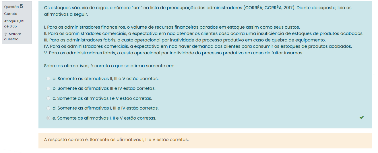 Questão 5 Os estoques são, via de regra, O número "um" na lista de preocupação dos administradores (CORRÊA; CORRÊA, 2017). Diante do exposto, leia as Correto afirmativas a seguir. Atingiu 0,05 de 0,05 I. Para administradores financeiros, O volume de recursos financeiros parados em estoque assim como seus custos. Marcar II. Para administradores comerciais, a expectativa em não atender OS clientes caso ocorra uma insuficiência de estoques de produtos acabados. questão III. Para OS administradores fabris, O custo operacional por inatividade do processo produtivo em caso de quebra de equipamento. IV. Para OS administradores comerciais, a expectativa em não haver demanda dos clientes para consumir OS estoques de produtos acabados. V. Para OS administradores fabris, O custo operacional por inatividade do processo produtivo em caso de faltar insumos. Sobre as afirmativas, é correto O que se afirma somente em: a. Somente as afirmativas II, III e V estão corretas. b. Somente as afirmativas III e IV estão corretas. C. Somente as afirmativas I e V estão corretas. d. Somente as afirmativas I, III e IV estão corretas. e. Somente as afirmativas I, II e V estão corretas. A resposta correta é: Somente as afirmativas II e V estão corretas.