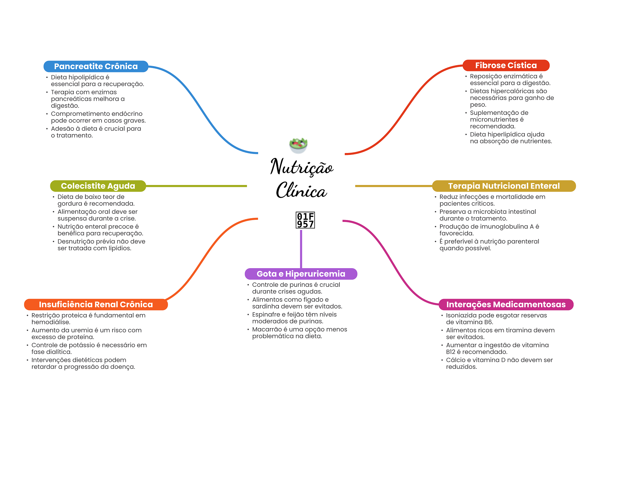 Pancreatite Crônica Fibrose Cística Dieta hipolipídica é Reposição enzimática é essencial para a recuperação. essencial para a digestão. Terapia com enzimas Dietas hipercalóricas são pancreáticas melhora a necessárias para ganho de digestão. peso. Comprometimento endócrino Suplementação de pode ocorrer em casos graves. micronutrientes é Adesão à dieta é crucial para recomendada. tratamento. Dieta hiperlipídica ajuda na absorção de nutrientes. Nutrição Colecistite Aguda Clínica Terapia Nutricional Enteral Dieta de baixo teor de Reduz infecções e mortalidade em gordura é recomendada. pacientes críticos. Alimentação oral deve ser Preserva a microbiota intestinal suspensa durante a crise. 01F durante tratamento. Nutrição enteral precoce é 957 Produção de imunoglobulina A é benéfica para recuperação. favorecida. Desnutrição prévia não deve É preferível à nutrição parenteral ser tratada com lipídios. quando possível. Gota e Hiperuricemia Controle de purinas é crucial durante crises agudas. Alimentos como fígado e Insuficiência Renal Crônica sardinha devem ser evitados. Interações Medicamentosas Restrição proteica é fundamental em Espinafre e feijão têm níveis Isoniazida pode esgotar reservas hemodiálise. moderados de purinas. de vitamina B6. Aumento da uremia é um risco com Macarrão é uma opção menos Alimentos ricos em tiramina devem excesso de proteína. problemática na dieta. ser evitados. Controle de potássio é necessário em Aumentar a ingestão de vitamina fase dialítica. B12 é recomendado. Intervenções dietéticas podem Cálcio e vitamina D não devem ser retardar a progressão da doença. reduzidos.