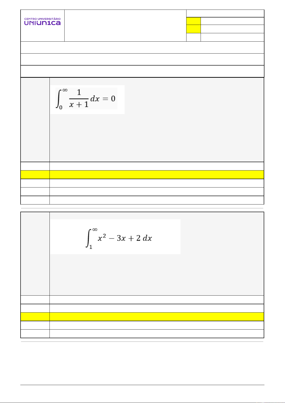 Pincel Atômico - 03/12/2025 10:44:02 1/2 LYDIA ALVES LIMA SANTOS Avaliação Online (SALA EAD) - Capitulos/Referencias 1,2,3 Atividade finalizada em 13/10/2025 21:18:45 (5128737 / 1) LEGENDA Resposta correta na questão # Resposta correta - Questão Anulada X Resposta selecionada pelo Aluno Disciplina: CÁLCULO III [989388] - Avaliação com 5 questões, com o peso total de 15,00 pontos [capítulos - 1,2,3] Turma: Graduação: Engenharia Ambiental e Sanitária - Grupo: FEVEREIRO/2024 - EAS/FEV24 [108371] Aluno(a): 91653424 - LYDIA ALVES LIMA SANTOS - Respondeu 4 questões corretas, obtendo um total de 12,00 pontos como nota [360815_169728] Questão 001 Veja a situação abaixo: Considerando as informações contidas na situação acima, avalie a seguintes asserções e a relação proposta entre elas. I. O resultado dado para a integral imprópria está correto. PORQUE II. A função que está no integrando possui como primitiva um logaritmo e, assim, tenderá a zero conforme os valores da variável x tende ao infinito. A respeito destas asserções, assinale a opção correta. A asserção I é uma proposição falsa e, a II é uma proposição verdadeira. As asserções I e II são proposições falsas. A asserção I é uma proposição verdadeira e, a II é uma proposição falsa. As asserções I e II são proposições verdadeiras, mas a II não é uma justificativa da I. X As asserções I e II são proposições verdadeiras, e a II é uma justificativa da I. [360815_169726] Questão 002 Analise a integral dada abaixo: Diante da integral acima, analise as afirmativas a seguir: I. Trata-se de uma integral de Remann definida num intervalo infinito. II. Seus limites de integração indicam um intervalo que cresce no infinito, caracterizando-a como imprópria. III. Seu resultado converge para 1. Estão corretas apenas as afirmativas: I e III, apenas. II e III, apenas. X I e II, apenas. I, apenas. II, apenas. Pincel Atômico - 03/12/2025 10:44:02 2/2 [360815_169735] Questão 003 Considere a série abaixo: Podemos afirmar que se trata de de uma série semiconvergente. de uma série convergente. X de uma série divergente. de uma série nula em divergência. de uma série semidivergente. [360816_169752] Questão 004 Analise a situação a seguir: De acordo a expressão acima, avalie as afirmativas abaixo: I. A expressão acima representa uma série caracterizada como geométrica. II. A soma da série representada pela expressão será divergente. III. A expressão dada não representa uma série, mas sim uma sequência finita divergente. É correto o que se afirma em: II e III, apenas. X I, apenas. II, apenas. I e III, apenas. III, apenas. [360817_169770] Questão 005 Analise a expressão abaixo: Resolvendo-a, chega-se em: +∞ 0 -1 X -∞ 1