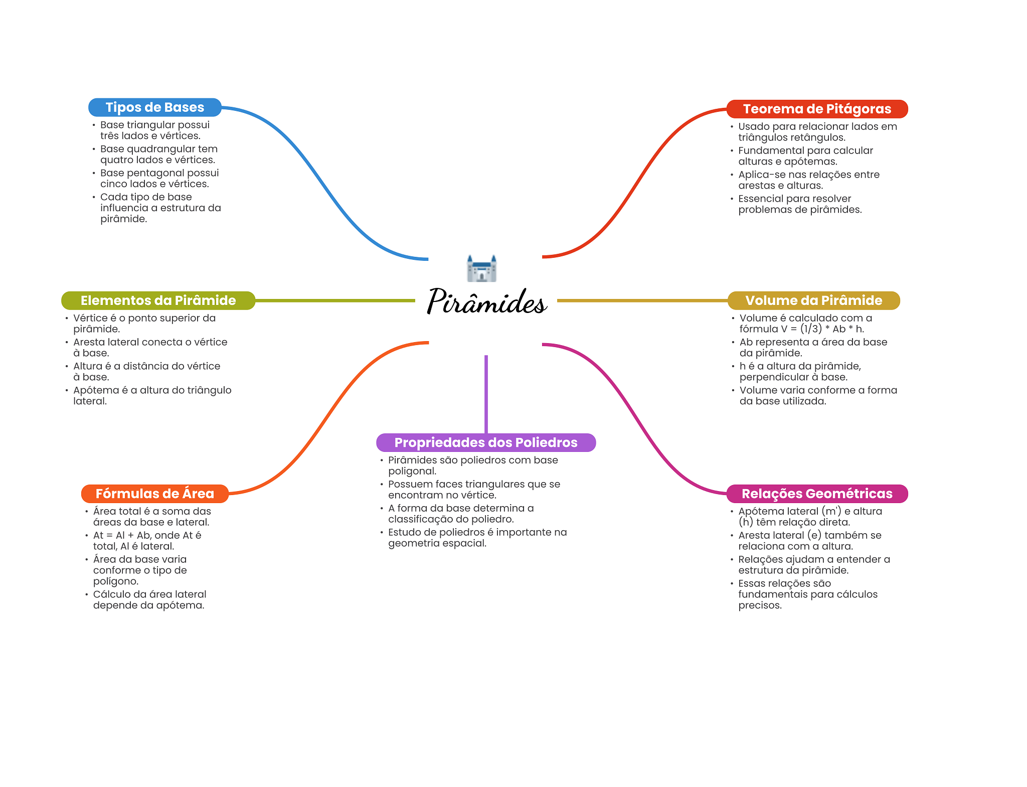 Tipos de Bases Teorema de Pitágoras Base triangular possui Usado para relacionar lados em três lados e vértices. triângulos retângulos. Base quadrangular tem Fundamental para calcular quatro lados e vértices. alturas e apótemas. Base pentagonal possui Aplica-se nas relações entre cinco lados e vértices. arestas e alturas. Cada tipo de base Essencial para resolver influencia a estrutura da problemas de pirâmides. pirâmide. Elementos da Pirâmide Pirâmides Volume da Pirâmide Vértice é ponto superior da Volume é calculado com a pirâmide. fórmula V = (1/3) * Ab h. Aresta lateral conecta vértice Ab representa a área da base à base. da pirâmide. Altura é a distância do vértice h é a altura da pirâmide, à base. perpendicular à base. Apótema é a altura do triângulo Volume varia conforme a forma lateral. da base utilizada. Propriedades dos Poliedros Pirâmides são poliedros com base poligonal. Possuem faces triangulares que se Fórmulas de Área encontram no vértice. Relações Geométricas Área total é a soma das A forma da base determina a Apótema lateral (m') e altura áreas da base e lateral. classificação do poliedro. (h) têm relação direta. At = Al + Ab, onde At é Estudo de poliedros é importante na Aresta lateral (e) também se total, Al é lateral. geometria espacial. relaciona com a altura. Área da base varia Relações ajudam a entender a conforme tipo de estrutura da pirâmide. polígono. Essas relações são Cálculo da área lateral fundamentais para cálculos depende da apótema. precisos.
