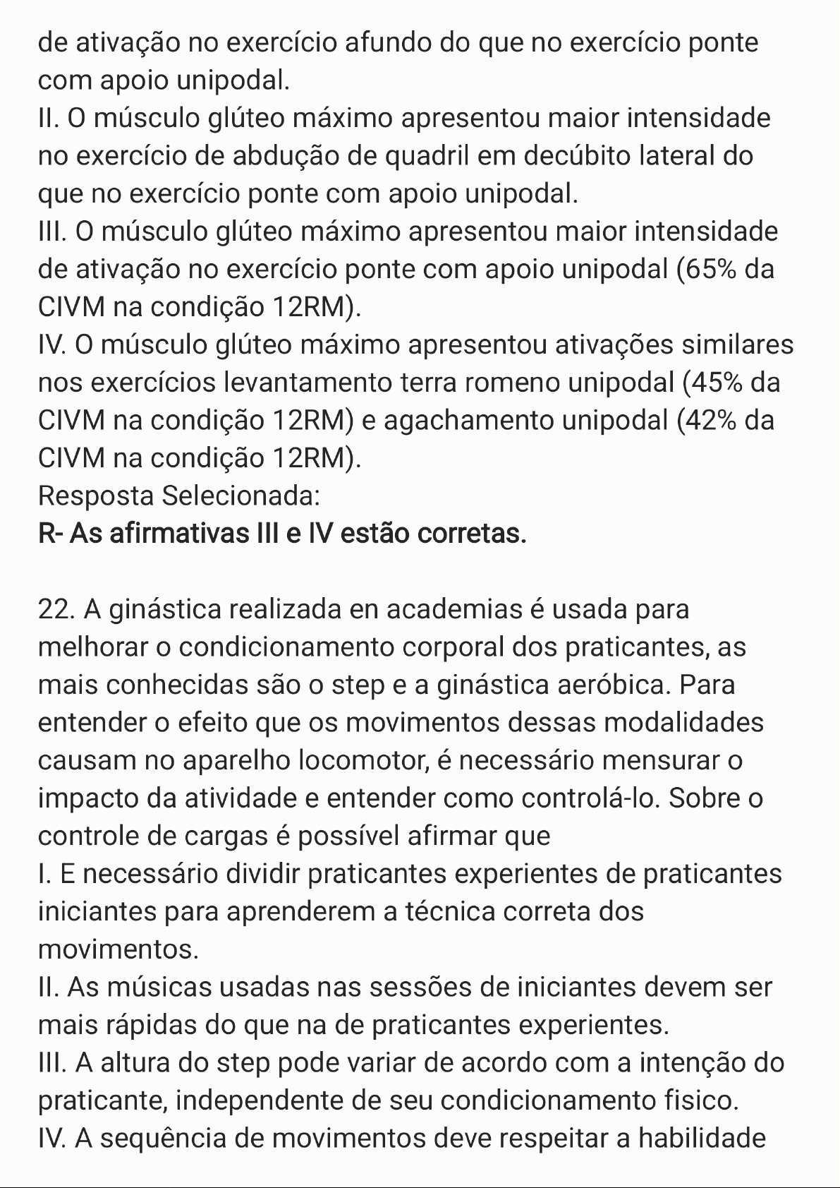 de ativação no exercício afundo do que no exercício ponte com apoio unipodal. II. músculo glúteo máximo apresentou maior intensidade no exercício de abdução de quadril em decúbito lateral do que no exercício ponte com apoio unipodal. III. músculo glúteo máximo apresentou maior intensidade de ativação no exercício ponte com apoio unipodal (65% da CIVM na condição 12RM). IV. músculo glúteo máximo apresentou ativações similares nos exercícios levantamento terra romeno unipodal (45% da CIVM na condição 12RM) e agachamento unipodal (42% da CIVM na condição 12RM). Resposta Selecionada: R- As afirmativas III e IV estão corretas. 22. A ginástica realizada en academias é usada para melhorar condicionamento corporal dos praticantes, as mais conhecidas são step e a ginástica aeróbica. Para entender efeito que os movimentos dessas modalidades causam no aparelho locomotor, é necessário mensurar impacto da atividade e entender como controlá-lo. Sobre controle de cargas é possível afirmar que I. E necessário dividir praticantes experientes de praticantes iniciantes para aprenderem a técnica correta dos movimentos. II. As músicas usadas nas sessões de iniciantes devem ser mais rápidas do que na de praticantes experientes. III. A altura do step pode variar de acordo com a intenção do praticante, independente de seu condicionamento fisico. IV. A sequência de movimentos deve respeitar a habilidadedos praticantes de cada turma: movimentos complexos para turmas mais experientes e movimentos simples para turmas Resposta Selecionada: R- I e IV estão corretas. 23. A participação dos sistemas visual, vestibular e somatossensorial para controle do equilibrio no movimento é de fundamental importância. Sobre esses sistemas é possível afirmar que: I. sistema auditivo, localizado no sisterna vestibular, fornece informações importantes sobre posicionamento e a movimentação da cabeça adotando como referência direção vertical. Assim, os objetos posicionados na vertical em relação ao nosso corpo, como portas e janelas, servem como inputs de informação vestibular para equilibrio. II. sistema visual fornece informações sobre as forças de inércia e gravitacional que interagem com nosso corpo parado e em movimento, III. sistema somatossensorial é formado por células receptoras proprioceptivas, cutâneas e articulares que informam sobre a variação de forças que ocorrem dentro do nosso corpo. Resposta Selecionada: R- III está correta. 24.Borreani et al (2014) verificaram as diferenças na ativação dos músculos tibial anterior, fibular longo e sóleo quando 44 participantes do estudo executaram exercicios proprioceptivos distintos em relação à estabilidade e à intensidade. Três dos movimentos estudados estãoa seguir. Com relação à complexidade do movimento para controle do equilíbrio, é possivel afirmar que: Fonte: BORREANI et al, 2014, 406 I. exercício da figura central é mais estável pelo fato de praticante estar sentado. II. exercicio da figura da esquerda é mais complexo, mais instável, por causa do apolo unipodal e pelo fato de praticante estar em pé e sobre uma superficie instável. III. exercício da figura da direita é mais fácil de ser executado. praticante está com base de apoio dupla e sem nenhum acessório sobre os pés para gerar instabilidade corporal. Mesmo com centro de massa corporal mais afastado verticalmente em relação ao solo, a posição é mais estável em relação às demais. Resposta Selecionada: R- II e III estão corretas. 25.0 centro de massa é ponto de equilibrio do objeto ou segmento corporal. Ao redor desse ponto a distribuição demassa do objeto ou segmento se då de forma homogênea. Alguns fatores no movimento podem influenciar equilibrio do corpo; dentre eles, podemos citar, I. A posição do centro de massa do corpo. Ao erguer os dois braços para cima, centro de massa do corpo se desloca para baixo. II. A quantidade de massa do corpo. Sujeitos mais pesados são mais difíceis de serem tirados com um empurrão da sua base de apoio. III. A base de apoio usada no movimento. Os movimentos com mais pontos de apoio no solo e com maior afastamento entre esses pontos de apoio são mais instáveis. IV. A localização vertical do centro de massa do corpo em relação ao solo. Quanto mais próximo centro de massa do corpo estiver do solo, mais difícil será produzir um torque potente contra esse corpo para tirá-lo do lugar. Resposta Selecionada: R- II e IV estão corretas. 26.0 conjunto de movimentos feitos em determinada sessão de treino caracteriza a "ginástica". Esse tipo de exercicio fisico teve diversos objetivos ao longo de sua história. Atualmente atribui-se à ginástica os seguintes propósitos: I. Condicionar corpo. II. Educar corpo para movimento. III. Corrigir posturas que provocam dores. IV. Desafiar corpo para controle do equilibrio em movimentos complexos, entre outros. Resposta Selecionada: R- I, II, III e IV estão corretas.27. gráfico a seguir ilustra impacto aplicado ao corpo na marcha, na corrida moderada (jogging), na corrida rápida (sprint), na aterrissagem do basquete, no salto em altura e no segundo passo do salto triplo (step). Esses valores foram obtidos com a plataforma de força de reação do solo que registra e quantifica a força externa que corpo recebe no movimento. Quando se comparam esses valores com os valores de impacto da ginástica aeróbica é possivel afirmar que: 21 18 Força vertical máxima (PC) 15 12 9 6 3 0 Marcha Corrida Corrida Aterrissagem Salto em Salto triplo (jogging) (sprint) do basquete altura (step) Fonte: SERRÃO, 2002, p. 271. I. A ginástica aeróbica de alto impacto tem valor similar de impacto ao do salto em altura. II. A ginástica aeróbica de alto impacto tem valor similar de impacto ao da corrida moderada (jogging). III. A ginástica aeróbica de baixo impacto tem valor similar de impacto ao da corrida rápida (sprint). IV. A g