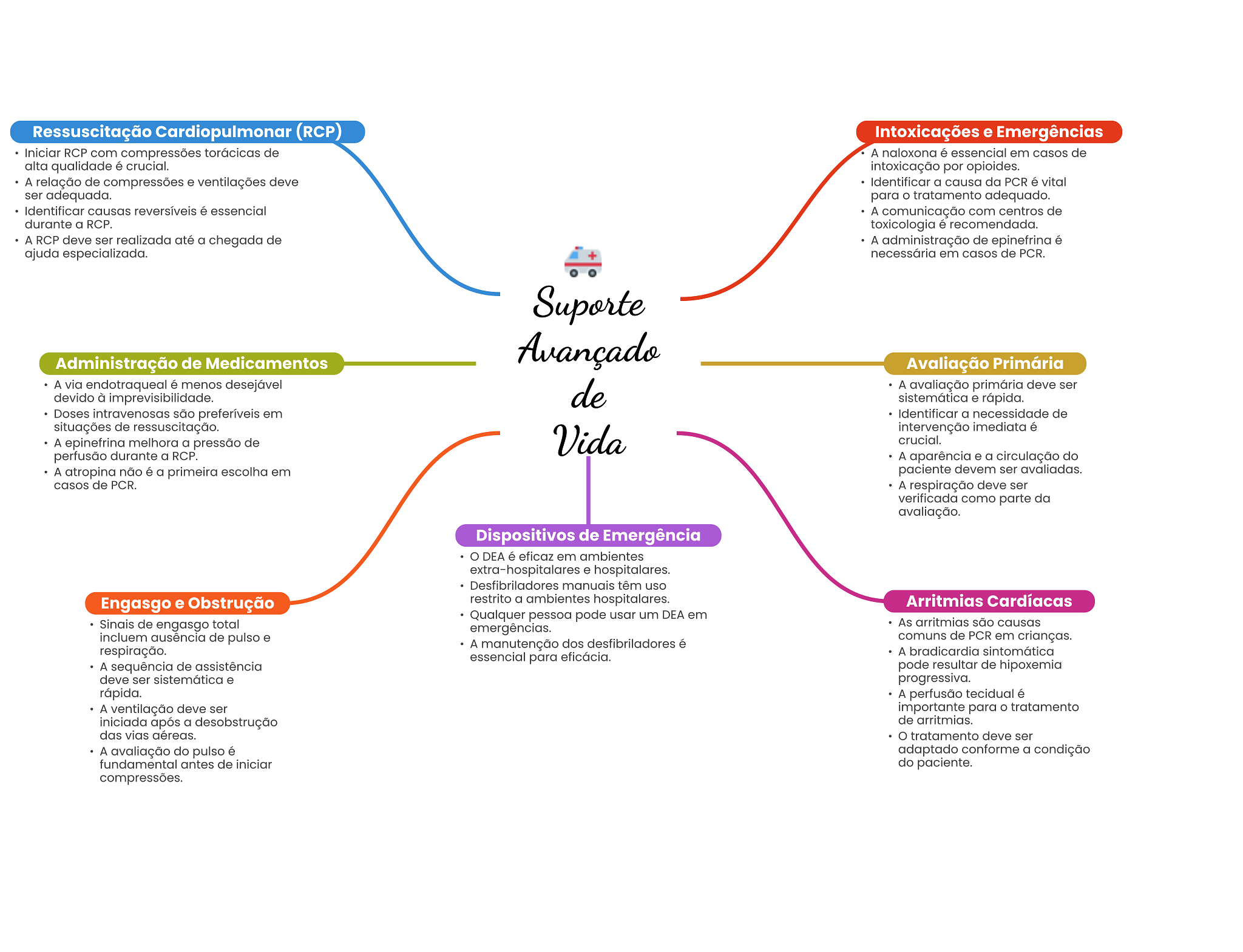 Ressuscitação Cardiopulmonar (RCP) Intoxicações e Emergências Iniciar RCP com compressões torácicas de A naloxona é essencial em casos de alta qualidade é crucial. intoxicação por opioides. A relação de compressões e ventilações deve Identificar a causa da PCR é vital ser adequada. para tratamento adequado. Identificar causas reversíveis é essencial A comunicação com centros de durante a RCP. toxicologia é recomendada. A RCP deve ser realizada até a chegada de A administração de epinefrina é ajuda especializada. necessária em casos de PCR. Suporte Administração de Medicamentos Avançado Avaliação Primária A via endotraqueal é menos desejável de A avaliação primária deve ser devido à imprevisibilidade. sistemática e rápida. Doses intravenosas são preferíveis em Identificar a necessidade de situações de ressuscitação. Vida intervenção imediata é A epinefrina melhora a pressão de crucial. perfusão durante a RCP. A aparência e a circulação do A atropina não é a primeira escolha em paciente devem ser avaliadas. casos de PCR. A respiração deve ser verificada como parte da avaliação. Dispositivos de Emergência DEA é eficaz em ambientes extra-hospitalares e hospitalares. Desfibriladores manuais têm uso Engasgo e Obstrução restrito a ambientes hospitalares. Arritmias Cardíacas Qualquer pessoa pode usar um DEA em Sinais de engasgo total As arritmias são causas emergências. incluem ausência de pulso e comuns de PCR em crianças. A manutenção dos desfibriladores é respiração. A bradicardia sintomática essencial para eficácia. A sequência de assistência pode resultar de hipoxemia deve ser sistemática e progressiva. rápida. A perfusão tecidual é A ventilação deve ser importante para O tratamento iniciada após a desobstrução de arritmias. das vias aéreas. O tratamento deve ser A avaliação do pulso é adaptado conforme a condição fundamental antes de iniciar do paciente. compressões.