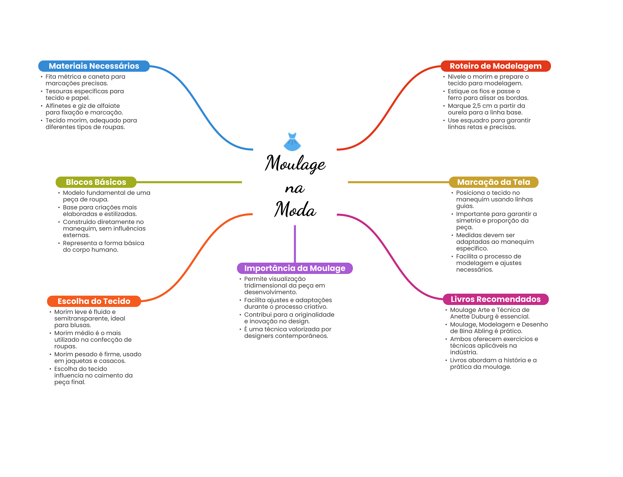 Materiais Necessários Roteiro de Modelagem Fita métrica e caneta para Nivele morim e prepare marcações precisas. tecido para modelagem. Tesouras específicas para Estique fios e passe tecido e papel. ferro para alisar as bordas. Alfinetes e giz de alfaiate Marque 2,5 cm a partir da para fixação e marcação. ourela para a linha base. Tecido morim, adequado para Use esquadro para garantir diferentes tipos de roupas. linhas retas e precisas. Moulage Blocos Básicos Marcação da Tela Modelo fundamental de uma na Posiciona tecido no peça de roupa. manequim usando linhas Base para criações mais elaboradas e estilizadas. Moda guias. Importante para garantir a Construído diretamente no simetria e proporção da manequim, sem influências peça. externas. Medidas devem ser Representa a forma básica adaptadas ao manequim do corpo humano. específico. Facilita processo de modelagem e ajustes Importância da Moulage necessários. Permite visualização tridimensional da peça em desenvolvimento. Escolha do Tecido Facilita ajustes e adaptações Livros Recomendados durante processo criativo. Morim leve é fluido e Moulage Arte e Técnica de Contribui para a originalidade semitransparente, ideal Anette Duburg é essencial. e inovação no design. para blusas. Moulage, Modelagem e Desenho É uma técnica valorizada por Morim médio é mais de Bina Abling é prático. designers contemporâneos. utilizado na confecção de Ambos oferecem exercícios e roupas. técnicas aplicáveis na Morim pesado é firme, usado indústria. em jaquetas e casacos. Livros abordam a história e a Escolha do tecido prática da moulage. influencia no caimento da peça final.