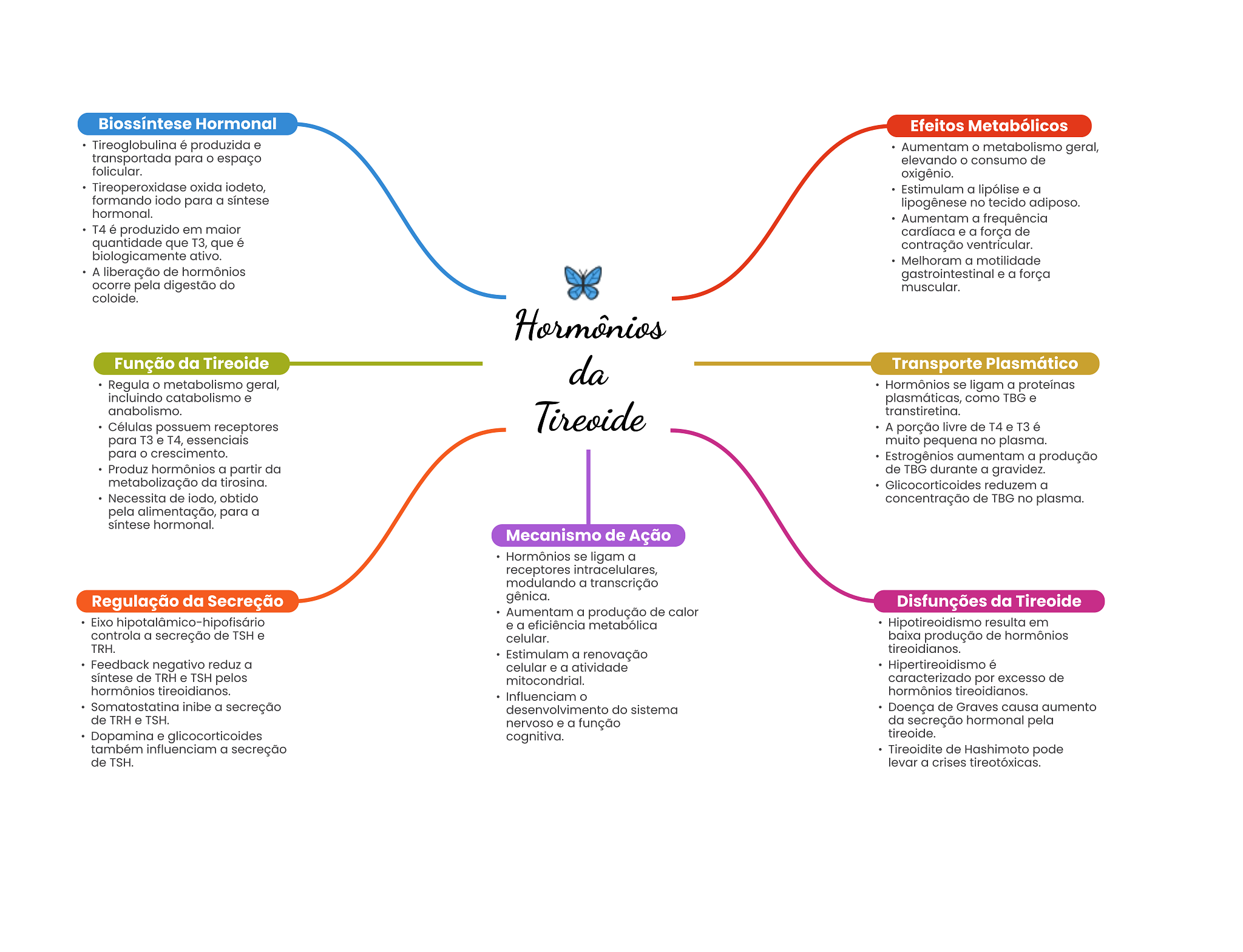 Biossíntese Hormonal Efeitos Metabólicos Tireoglobulina é produzida e Aumentam metabolismo geral, transportada para espaço elevando consumo de folicular. oxigênio. Tireoperoxidase oxida iodeto, Estimulam a lipólise e a formando iodo para a síntese lipogênese no tecido adiposo. hormonal. Aumentam a frequência T4 é produzido em maior cardíaca e a força de quantidade que T3, que é contração ventricular. biologicamente ativo. Melhoram a motilidade A liberação de hormônios gastrointestinal e a força ocorre pela digestão do muscular. coloide. Hormônios Função da Tireoide da Transporte Plasmático Regula metabolismo geral, Hormônios se ligam a proteínas incluindo catabolismo e plasmáticas, como TBG e anabolismo. Tireoide transtiretina. Células possuem receptores A porção livre de T4 e T3 é para e T4, essenciais muito pequena no plasma. para crescimento. Estrogênios aumentam a produção Produz hormônios a partir da de TBG durante a gravidez. metabolização da tirosina. Glicocorticoides reduzem a Necessita de iodo, obtido concentração de TBG no plasma. pela alimentação, para a síntese hormonal. Mecanismo de Ação Hormônios se ligam a receptores intracelulares, modulando a transcrição Regulação da Secreção gênica. Disfunções da Tireoide Aumentam a produção de calor Eixo e a eficiência metabólica Hipotireoidismo resulta em controla a secreção de TSH e celular. baixa produção de hormônios TRH. tireoidianos. Estimulam a renovação Feedback negativo reduz a celular e a atividade Hipertireoidismo é síntese de TRH e TSH pelos mitocondrial. caracterizado por excesso de hormônios tireoidianos. Influenciam hormônios tireoidianos. Somatostatina inibe a secreção desenvolvimento do sistema Doença de Graves causa aumento de TRH e TSH. nervoso e a função da secreção hormonal pela Dopamina e glicocorticoides cognitiva. tireoide. também influenciam a secreção Tireoidite de Hashimoto pode de TSH. levar a crises tireotóxicas.