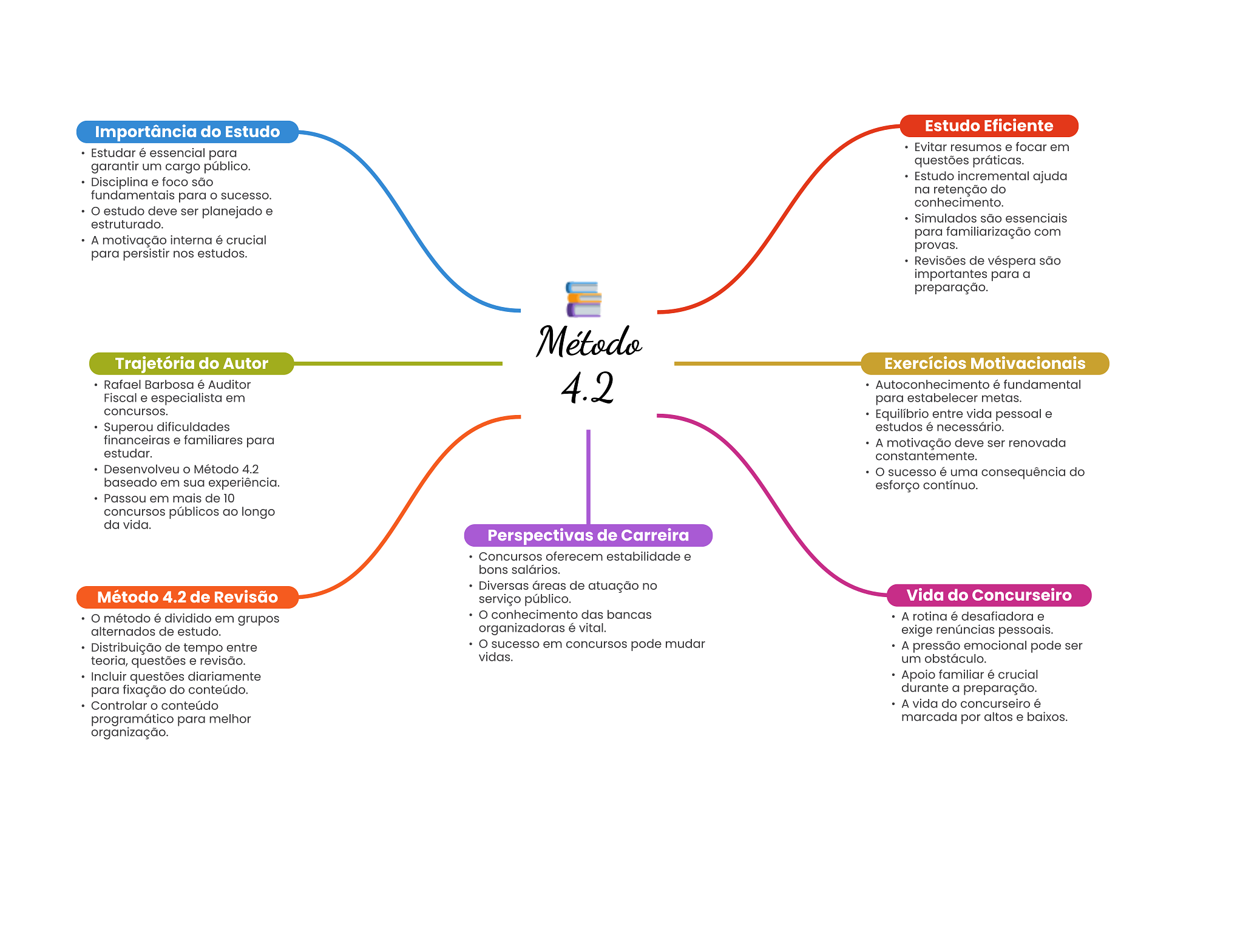 Importância do Estudo Estudo Eficiente Evitar resumos e focar em Estudar é essencial para garantir um cargo público. questões práticas. Disciplina e foco são Estudo incremental ajuda fundamentais para sucesso. na retenção do conhecimento. estudo deve ser planejado e Simulados são essenciais estruturado. para familiarização com A motivação interna é crucial provas. para persistir nos estudos. Revisões de véspera são importantes para a preparação. Método Trajetória do Autor Exercícios Motivacionais Rafael Barbosa é Auditor 4.2 Autoconhecimento é fundamental Fiscal e especialista em para estabelecer metas. concursos. Equilíbrio entre vida pessoal e Superou dificuldades estudos é necessário. financeiras e familiares para A motivação deve ser renovada estudar. constantemente. Desenvolveu Método 4.2 sucesso é uma consequência do baseado em sua experiência. esforço contínuo. Passou em mais de 10 concursos públicos ao longo da vida. Perspectivas de Carreira Concursos oferecem estabilidade e bons salários. Diversas áreas de atuação no Método 4.2 de Revisão serviço público. Vida do Concurseiro O método é dividido em grupos conhecimento das bancas A rotina é desafiadora e alternados de estudo. organizadoras é vital. exige renúncias pessoais. Distribuição de tempo entre sucesso em concursos pode mudar A pressão emocional pode ser teoria, questões e revisão. vidas. um obstáculo. Incluir questões diariamente Apoio familiar é crucial para fixação do conteúdo. durante a preparação. Controlar conteúdo A vida do concurseiro é programático para melhor marcada por altos e baixos. organização.