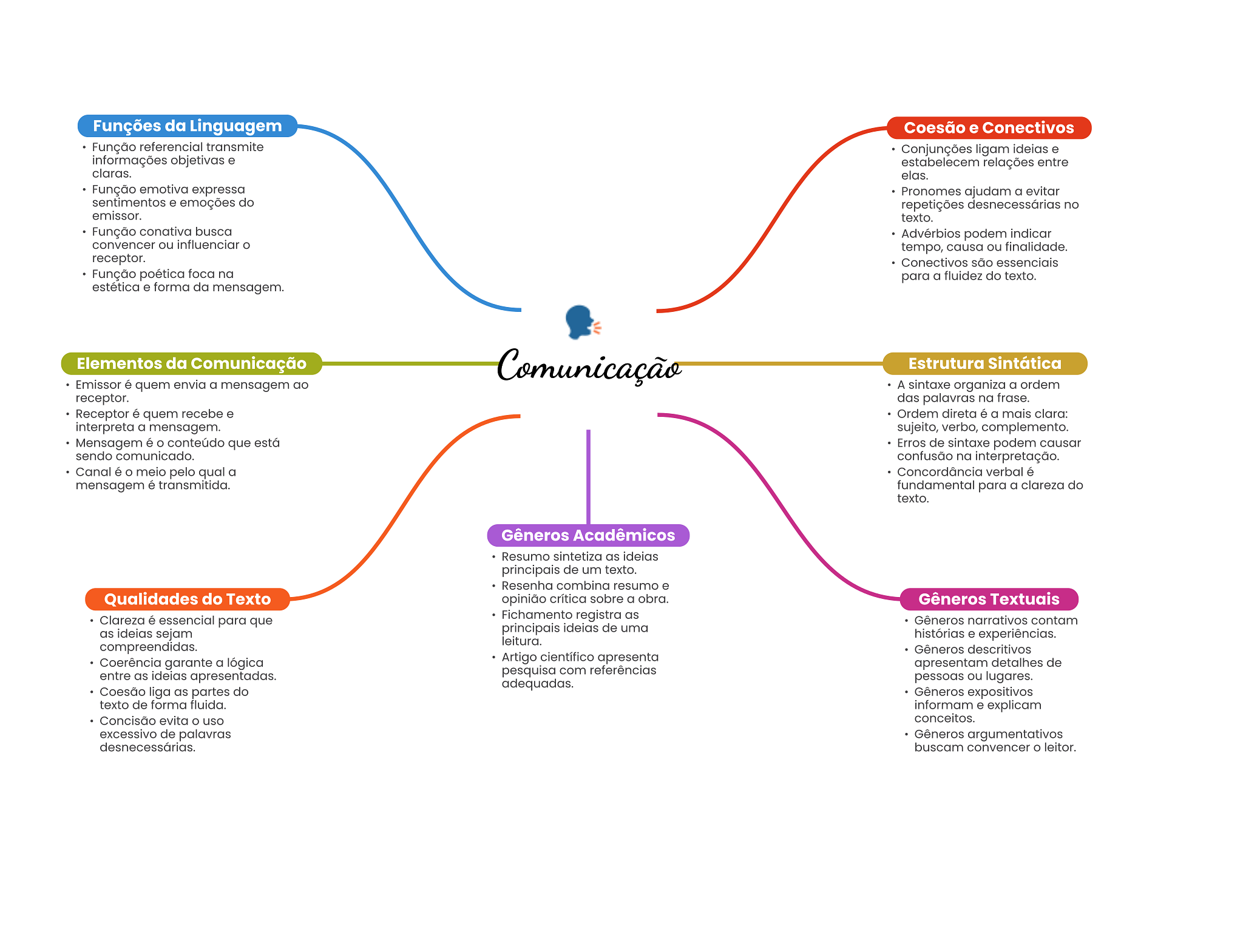 Funções da Linguagem Coesão e Conectivos Função referencial transmite Conjunções ligam ideias e informações objetivas e estabelecem relações entre claras. elas. Função emotiva expressa Pronomes ajudam a evitar sentimentos e emoções do repetições desnecessárias no emissor. texto. Função conativa busca Advérbios podem indicar convencer ou influenciar tempo, causa ou finalidade. receptor. Conectivos são essenciais Função poética foca na para a fluidez do texto. estética e forma da mensagem. Elementos da Comunicação Comunicação Estrutura Sintática Emissor é quem envia a mensagem ao A sintaxe organiza a ordem receptor. das palavras na frase. Receptor é quem recebe e Ordem direta é a mais clara: interpreta a mensagem. sujeito, verbo, complemento. Mensagem é O conteúdo que está Erros de sintaxe podem causar sendo comunicado. confusão na interpretação. Canal é O meio pelo qual a Concordância verbal é mensagem é transmitida. fundamental para a clareza do texto. Gêneros Acadêmicos Resumo sintetiza as ideias principais de um texto. Resenha combina resumo e Qualidades do Texto opinião crítica sobre a obra. Gêneros Textuais Clareza é essencial para que Fichamento registra as Gêneros narrativos contam as ideias sejam principais ideias de uma leitura. histórias e experiências. compreendidas. Gêneros descritivos Coerência garante a lógica Artigo científico apresenta apresentam detalhes de entre as ideias apresentadas. pesquisa com referências pessoas ou lugares. adequadas. Coesão liga as partes do Gêneros expositivos texto de forma fluida. informam e explicam Concisão evita uso conceitos. excessivo de palavras Gêneros argumentativos desnecessárias. buscam convencer leitor.