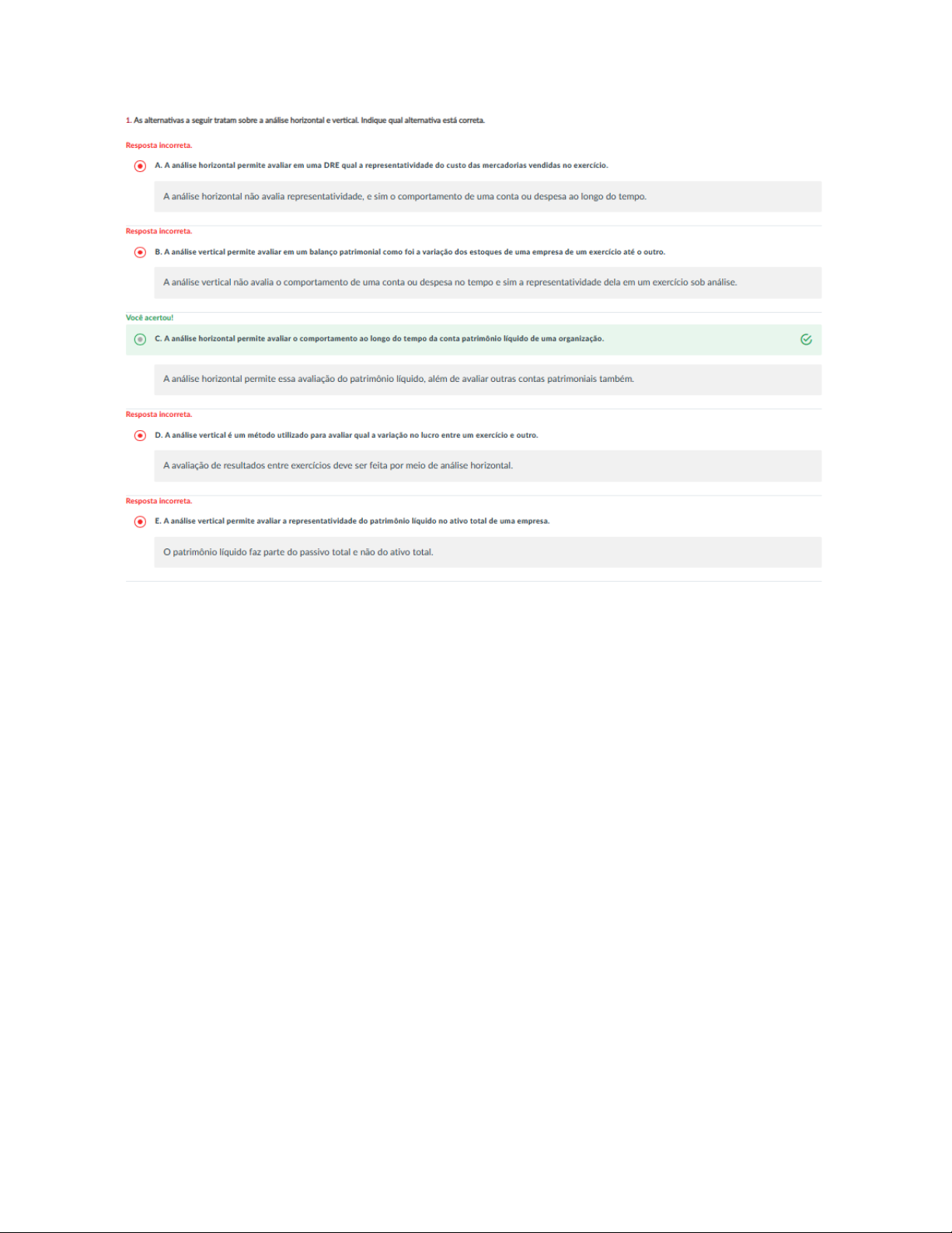 1. As alternativas a seguir tratam sobre a análise horizontal e vertical. Indique qual alternativa está correta. Resposta incorreta. A.A análise horizontal permite avaliar em uma DRE qual a representatividade do custo das mercadorias vendidas no exercício. A análise horizontal não avalia representatividade, e sim comportamento de uma conta ou despesa ao longo do tempo. Resposta incorreta. B.A análise vertical permite avaliar em um balanço patrimonial como foi a variação dos estoques de uma empresa de um exercício até outro. A análise vertical não avalia comportamento de uma conta ou despesa no tempo e sim a representatividade dela em um exercício sob análise. Você acertou! C.A análise horizontal permite avaliar comportamento ao longo do tempo da conta patrimônio líquido de uma organização. A análise horizontal permite essa avaliação do patrimônio líquido, além de avaliar outras contas patrimoniais também. Resposta incorreta. D. A análise vertical é um método utilizado para avaliar qual a variação no lucro entre um exercício e outro. A avaliação de resultados entre exercícios deve ser feita por meio de análise horizontal. Resposta incorreta. E. A análise vertical permite avaliar a representatividade do patrimônio líquido no ativo total de uma empresa. patrimônio líquido faz parte do passivo total e não do ativo total.2. Observe a DRE abaixo, nela ano 1 deve ser considerado como ano base para a análise dos dados do ano 2: Realizado Ano 2 Ano 1 Receita líquida de vendas 200.000 300.000 Custo das Mercadorias Vendidas 146.000 210.000 Lucro Bruto 54.000 90.000 Despesas Comerciais 26.000 35.000 Despesas administrativas 9.300 15.000 Outras despesas operacionais 5.100 9.800 Lucro Operacional 13.600 30.200 Despesas financeiras 1.000 6.200 Receitas Financeiras Lucro antes dos Impostos 12.600 24.000 Provisão para imposto de renda 1.890 3.600 Contribuição social sobre 0 lucro 1.010 1.920 Lucro Líquido 9.700 18.480 Qual das alternativas está correta com relação a análise horizontal desse demonstrativo? Resposta incorreta. A.A receita líquida de vendas diminui 67% no ano 2. A receita líquida de vendas do ano 2 representa 67% da receita do ano 1. logo a receita diminui 33% Resposta B.O lucro bruto aumentou 60% no ano 2. lucro bruto do ano 2 representa 60% do lucro bruto do ano 1. logo houve queda de 40%. Resposta incorreta. C. lucro operacional reduziu 45% no ano 2. lucro operacional do ano 2 representa 45% do lucro operacional do ano logo a queda foi de Você acertou! D. As despesas financeiras 84% no ano 2. As despesas financeiras do ano 2 representam 16% das despesas financeiras do ano 1, logo a queda foi de 84%. Resposta incorreta. E.O lucro líquido diminuiu 52% no ano 2. lucro líquido do ano 2 representa 52% do lucro líquido do ano logo, a queda foi de 48%.3. Observe a DRE a seguir: Realizado Ano 2 Receita de vendas 200.000 Custo das vendidas 146.000 Lucro Bruto 54.000 Despesas comercials 26.000 Despesas administrativas 9.300 Outras despesas operacionais 5.100 Lucro Operacional 13.600 Despesas financeiras 1.000 financeiras Lucro antes dos 12.600 Provisão para imposto de renda 1.890 Contribuição social sobre lucro 1.010 Lucro líquido 9.700 Qual das alternativas está correta com relação a análise vertical deste demonstrativo? Resposta incorreta. A.O custo das mercadorias vendidas representa 27% da receita líquida. A representatividade do custo das mercadorias vendidas é calculada dividindo-se o valor de 146.000 por 200.000 e resulta em 73%. Resposta incorreta. B.O lucro bruto representa 37% da receita líquida. A representatividade do lucro bruto é calculada dividindo-se valor de 54.000 por 200.000 e resulta em Você acertou! C.O lucro operacional representa 6,8% da receita líquida. A representatividade do lucro operacional é calculada dividindo-se valor de 13.600 por 200.000 e resulta em Resposta incorreta. D.O lucro antes dos impostos representa 7% da receita líquida. A representatividade do lucro antes dos impostos é calculada dividindo-se valor de 12.600 por 200.000 e resulta em 6,3%. Resposta incorreta. E.O lucro líquido representa 3% da receita líquida. A representatividade do lucro líquido é calculada dividindo-se valor de 9.700 por 200.000 e resulta em4.0 balanço patrimonial a seguir pertence a um dos maiores fabricantes de aço do país e está disponível no site da empresa na seção "relação com investidores". o ano apresentado nessa demonstração contábil foi um ano de recessão comparado ao ano Realize uma análise horizontal no balanço e marque a alternativa que apresenta a conta com maior variação positiva, ou aumento de valor, no ativo circulante de 2016. BALANÇO PATRIMONIAL (Valores expressos em milhares de ATIVO PASSIVO Nota 31/12/2016 31/12/2015 Nota 31/12/2016 31/12/2015 ATIVO CIRCULANTE PASSIVO CIRCULANTE Caixa e equivalentes de 4 Fornecedores 2.743.818 3.629.788 Aplicações financeiras Empréstimos e financiamentos 13 2.387237 para negociação 4 1.270.760 Impostos e contribuições a 16 341.190 349.674 Contas a receber de clientes 5 4.587426 de renda/contribuição social a 140.449 Estoques 6 Salários pagar 464.494 480.430 Créditos tributários 7 504.429 673.155 Beneficios a empregados 19 409 18.535 Imposto de renda/contribuição social a recuperar 623.636 724.843 Provisão para passivos ambientais 20 17737 27736 Dividendos a receber Perdas não realizadas com instrumentos financeiros 15 6.584 Ganhos não realizados com Outros passivos circulantes 829.182 instrumentos financeiros 15 2.557 37981 Outros ativos circulantes PASSIVO NÃO-CIRCULANTE 17796.740 Empréstimos financiamentos 13 23.826.758 14 165.423 246.862 Partes relacionadas 18 896 ATIVO NÃO-CIRCULANTE de renda 0 contribuição social diferidos 8 914.475 Créditos tributários 7 56.703 Provisão para passivos e trabalhistas 17 1.904.730 Imposto de renda/contribuição social diferidos 8 3.407230 Provisão para passivos ambienta