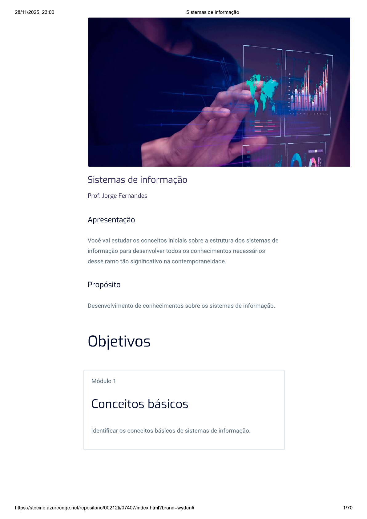 28/11/2025, 23:00 Sistemas de informação Sistemas de informação Prof. Jorge Fernandes Apresentação Você vai estudar os conceitos iniciais sobre a estrutura dos sistemas de informação para desenvolver todos os conhecimentos necessários desse ramo tão significativo na contemporaneidade. Propósito Desenvolvimento de conhecimentos sobre os sistemas de informação. Objetivos Módulo 1 Conceitos básicos Identificar os conceitos básicos de sistemas de informação. 1/7028/11/2025, 23:00 Sistemas de informação Módulo 2 Sistemas de informação e competitividade Identificar os sistemas de informação e competitividade. Módulo 3 Infraestrutura para sistemas de informação Identificar a infraestrutura para sistemas de informação. Módulo 4 Principais tipos de sistemas de informação Identificar os principais tipos de sistemas de informação. Introdução Quase todos os programas de negócios possuem uma disciplina chamada Sistemas de Informação. As empresas dependem de informações baseadas em dados para prosperar e ter sucesso. Os sistemas de informação fornecem os meios e meio para coletar, armazenar, proteger, recuperar, compartilhar, analisar e apresentar os dados; logo, os sistemas de informação desempenham um papel importante em nosso mundo moderno. 2/7028/11/2025, 23:00 Sistemas de informação Quase todos os serviços, desde serviços bancários a viagens, até aplicações complexas de assistência médica, exploram sistemas de informação para manipulação de dados. Os conceitos centrais de qualquer sistema de informação, ou seja, pessoas, processos e tecnologia, serão discutidos aqui. Apresentaremos uma visão geral dos conceitos fundamentais de sistemas de informação, definição de termos-chave e tendências atuais, o papel e a importância da informação e sistemas de informação para negócios e gestão e suas implicações. Neste vídeo, conheça os conceitos fundamentais dos sistemas de informação, incluindo pessoas, processos e tecnologia. Você entenderá a importância desses sistemas para negócios e gestão, destacando como são utilizados em serviços bancários, viagens e assistência médica. Também conhecerá definições de termos-chave e tendências atuais na área. Para assistir a um vídeo sobre assunto, acesse a versão online deste conteúdo. Material para download Clique no botão abaixo para fazer o download do conteúdo completo em formato PDF. Download material 3/7028/11/2025, 23:00 Sistemas de informação 1 - - Conceitos básicos Ao final deste módulo, você será capaz de identificar conceitos básicos de sistemas de informação. Sistema de informação no mundo real Trata os dados fundamentais para a tomada de decisões em negócios e gestão, permitindo que estes sejam: Coletados Armazenados Protegidos Recuperados Compartilhados Analisados Apresentados Desde suas origens até as inovações atuais, esses sistemas evoluíram significativamente, impactando diversas áreas, como serviços bancários, viagens e assistência médica. Os sistemas de informação são fundamentais para o funcionamento eficiente das organizações modernas, integrando software, hardware e 4/7028/11/2025, 23:00 Sistemas de informação redes de telecomunicações para coletar, manipular e armazenar dados, além de disseminar informações úteis. Originalmente estruturados em torno do diamante de Leavitt, composto por tarefa, pessoa, estrutura e tecnologia, esses sistemas evoluíram e se tornaram a base de empresas como eBay, Amazon, Alibaba e Google. Neste vídeo, exploraremos a importância e a evolução dos sistemas de informação, detalhando seus componentes essenciais e como eles transformam operações empresariais para aumentar receitas, reduzir custos e melhorar a competitividade. Confira! Para assistir a um vídeo sobre assunto, acesse a versão online deste conteúdo. Um sistema de informação (SI) é um conjunto de componentes inter- relacionados software, hardware e redes de telecomunicações que coletam, manipulam e armazenam dados; e disseminam informações úteis, especialmente em uma organização para aumentar receitas, reduzir custos, gerenciar suas operações, interagir com seus consumidores e ficar à frente da concorrência. Na década de 1960, os sistemas de informação nas organizações foram estruturados em torno de quatro elementos essenciais: tarefa, pessoa, estrutura e tecnologia. padrão é conhecido como Diamante de Leavitt (1965, p. 1145): Diamante de Leavitt. Tarefa Atividades necessárias para a produção de um bem ou serviço. Essas atividades são apoiadas pelo fluxo de material, informação e conhecimento entre os diferentes participantes. Pessoa componente pessoa de um sistema de informação engloba todas as pessoas diretamente envolvidas no sistema. Essas pessoas incluem os 5/7028/11/2025, 23:00 Sistemas de informação gerentes que os objetivos do sistema, os usuários e os desenvolvedores. Estrutura componente de estrutura organizacional e sistemas de informação refere-se ao relacionamento entre componentes de indivíduos e pessoas. Assim, abrange estruturas hierárquicas, relacionamentos e sistemas de avaliação de pessoas. Tecnologia A TI (Tecnologia da Informação) de um SI compreende hardware, software e equipamentos de telecomunicações utilizados para capturar, processar, armazenar e disseminar informações. Atualmente, a maioria dos SI é baseada em TI porque a TI moderna permite a execução eficiente de operações e o gerenciamento eficaz em todos os tamanhos. Hoje, algumas empresas são totalmente estruturadas a partir de sistemas de informação, como eBay, Amazon, Alibaba e Google, sendo seus quatro componentes principais definidos como: Tecnologia Pode ser pensada como a aplicação do conhecimento científico para fins práticos. Desde a invenção da roda até o aproveitamento da eletricidade para iluminação artificial, a tecnologia tornou-se onipresente na vida cot