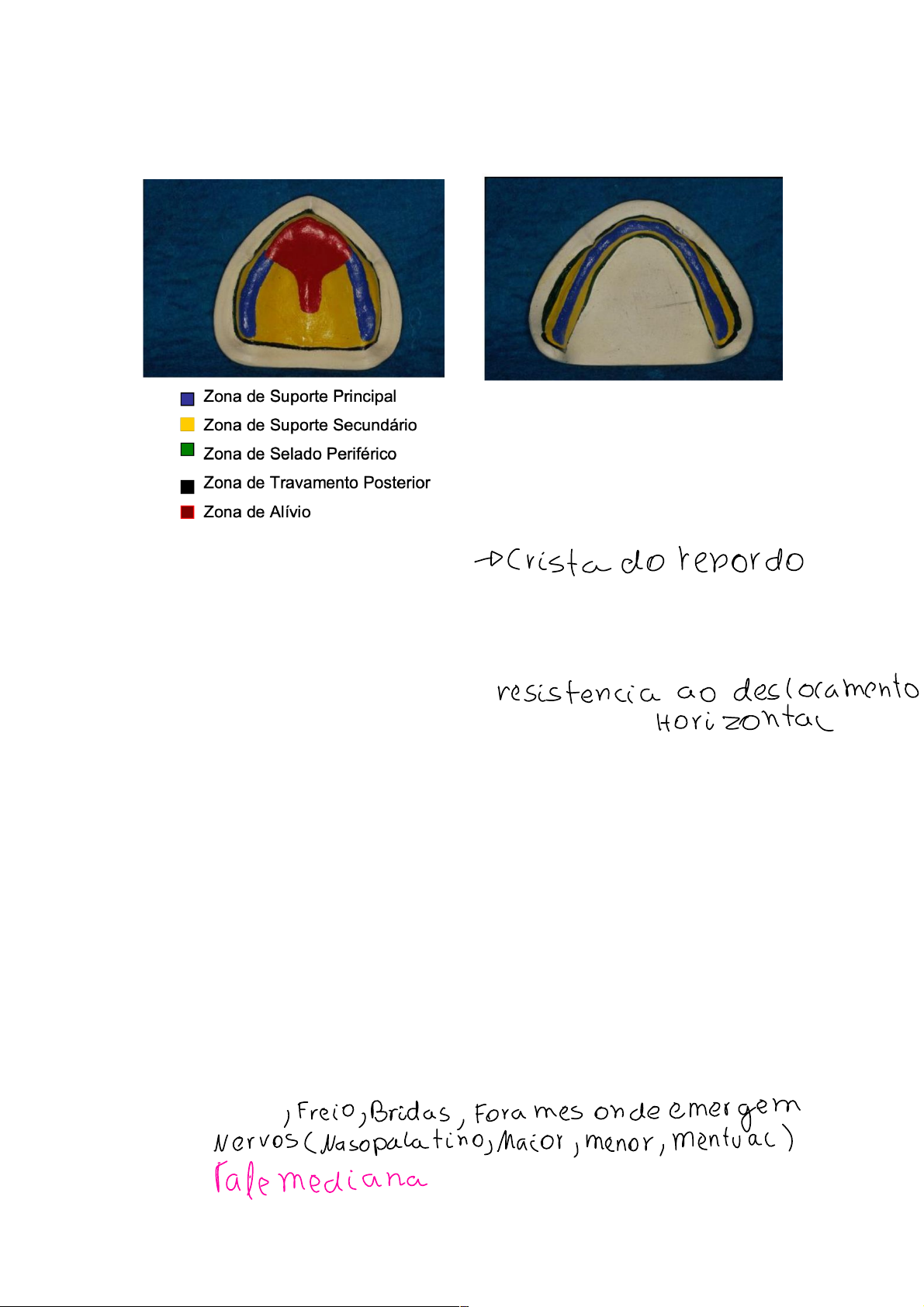 Divisão da área basal ou chapeável (Pendleton, 1928) 1. zona de suporte principal • destina-se a suportar as cargas mastigatórias • local onde foram extraídos os dentes • tem fundamental importância na montagem dos dentes posteriores 2. zona de suporte secundário • ajuda na absorção de cargas mastigatórias • imobilização da PT no sentido horizontal • corresponde as vertentes vestibulares e palatinas dos rebordos 3. zona de selamento periférico • é uma faixa de 2 a 3mm de largura que contorna a área basal, com exceção da porção anterior • sua principal função é manter o selamento periférico 4. zona de selamento posterior • no limite entre palato duro e mole • tem por função selar a porção posterior • corrige a deficiência do material de moldagem na região 5. zona de alívio • região que deve ser aliviada na moldagem para que a mucosa não receba os esforços • exemplos: rafe palatina, espículas ósseas, rebordo em lâmina de faca ->Crista do repordo resistencia ao deslocamento Horizontal , Freio ,Bridas , Fora mes onde emergem Nervos (Nasopalatino,Maior, menor ,mentral) Talemediana