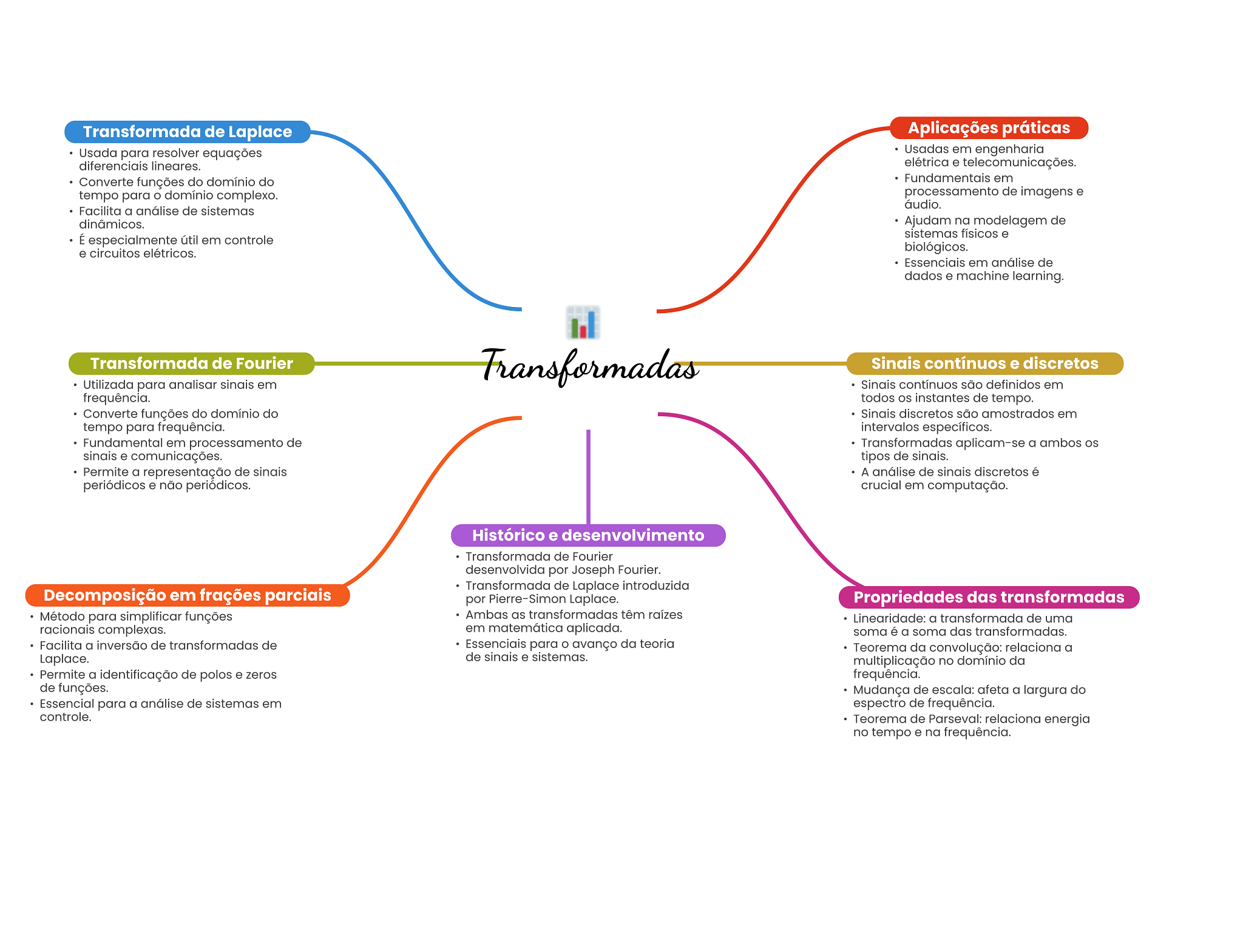 Transformada de Laplace Aplicações práticas Usada para resolver equações Usadas em engenharia diferenciais lineares. elétrica e telecomunicações. Converte funções do domínio do Fundamentais em tempo para domínio complexo. processamento de imagens e áudio. Facilita a análise de sistemas dinâmicos. Ajudam na modelagem de sistemas físicos e É especialmente útil em controle e circuitos elétricos. biológicos. Essenciais em análise de dados e machine learning. Transformada de Fourier Transformadas Sinais contínuos e discretos Utilizada para analisar sinais em Sinais contínuos são definidos em frequência. todos OS instantes de tempo. Converte funções do domínio do Sinais discretos são amostrados em tempo para frequência. intervalos específicos. Fundamental em processamento de Transformadas aplicam-se a ambos sinais e comunicações. tipos de Permite a representação de sinais A análise de sinais discretos é periódicos e não periódicos. crucial em computação. Histórico e desenvolvimento Transformada de Fourier desenvolvida por Joseph Fourier. Transformada de Laplace introduzida Decomposição em frações parciais por Pierre-Simon Laplace. Propriedades das transformadas Método para simplificar funções Ambas as transformadas têm raízes Linearidade: a transformada de uma racionais complexas. em matemática aplicada. soma é a soma das transformadas. Facilita a inversão de transformadas de Essenciais para avanço da teoria Teorema da convolução: relaciona a Laplace. de sinais e sistemas. multiplicação no domínio da Permite a identificação de polos e zeros frequência. de funções. Mudança de escala: afeta a largura do Essencial para a análise de sistemas em espectro de frequência. controle. Teorema de Parseval: relaciona energia no tempo e na frequência.