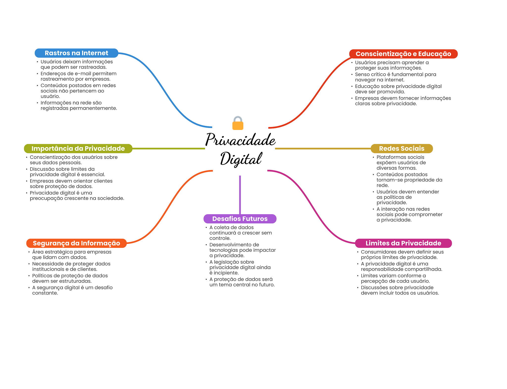 Rastros na Internet Conscientização e Educação Usuários deixam informações Usuários precisam aprender a que podem ser rastreadas. proteger suas informações. Endereços de e-mail permitem Senso crítico é fundamental para rastreamento por empresas. navegar na internet. Conteúdos postados em redes Educação sobre privacidade digital sociais não pertencem ao deve ser promovida. usuário. Empresas devem fornecer informações Informações na rede são claras sobre privacidade. registradas permanentemente. Privacidade Importância da Privacidade Redes Sociais Conscientização dos usuários sobre seus dados pessoais. Digital Plataformas sociais expõem usuários de Discussão sobre limites da diversas formas. privacidade digital é essencial. Conteúdos postados Empresas devem orientar clientes tornam-se propriedade da sobre proteção de dados. rede. Privacidade digital é uma Usuários devem entender preocupação crescente na sociedade. as políticas de privacidade. A interação nas redes sociais pode comprometer Desafios Futuros a privacidade. A coleta de dados continuará a crescer sem controle. Segurança da Informação Desenvolvimento de Limites da Privacidade Área estratégica para empresas tecnologias pode impactar Consumidores devem definir seus que lidam com dados. a privacidade. próprios limites de privacidade. Necessidade de proteger dados A legislação sobre A privacidade digital é uma institucionais e de clientes. privacidade digital ainda responsabilidade compartilhada. é incipiente. Políticas de proteção de dados Limites variam conforme a devem ser estruturadas. A proteção de dados será percepção de cada usuário. um tema central no futuro. A segurança digital é um desafio Discussões sobre privacidade constante. devem incluir todos OS usuários.