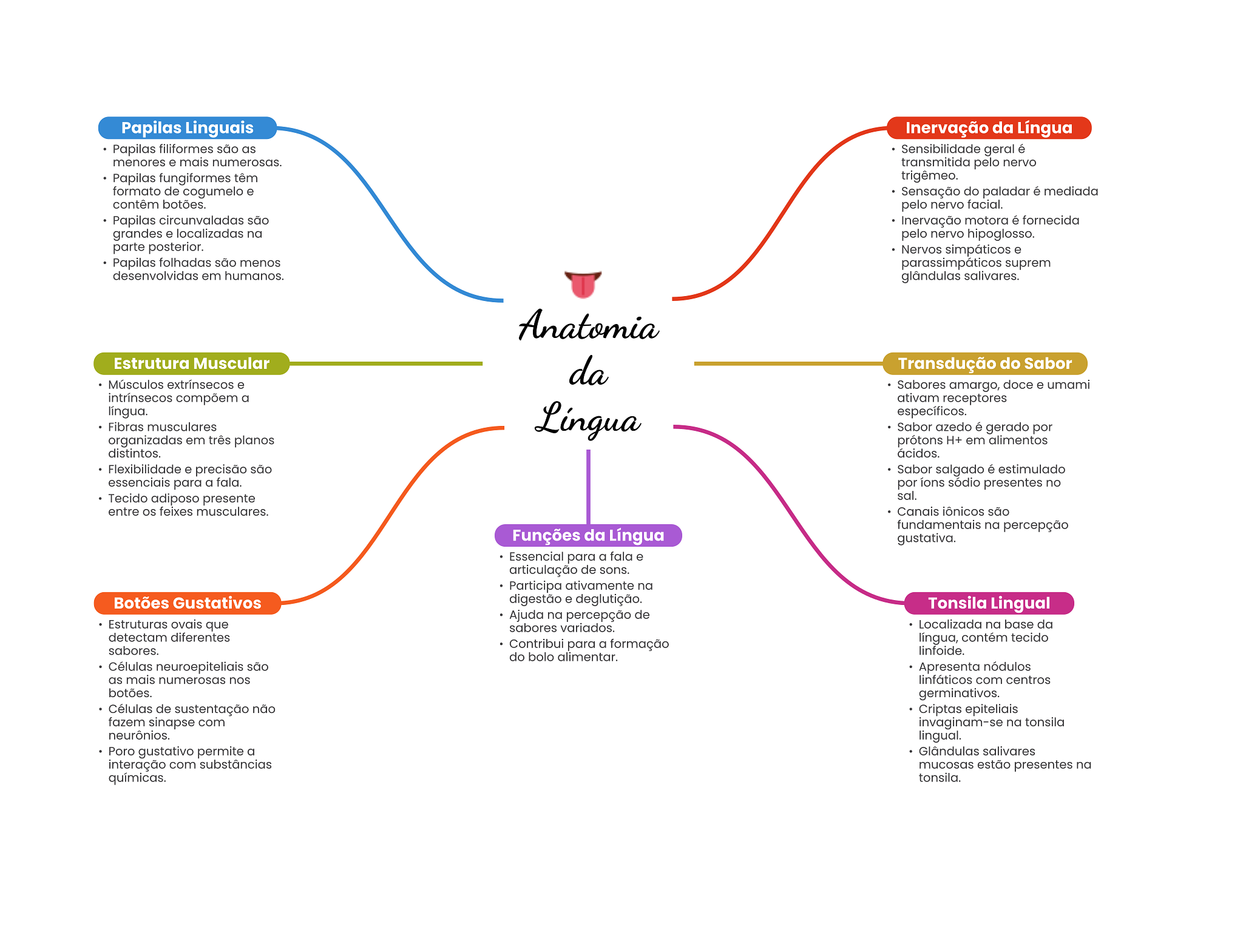 Papilas Linguais Inervação da Língua Papilas filiformes são as Sensibilidade geral é menores e mais numerosas. transmitida pelo nervo Papilas fungiformes têm trigêmeo. formato de cogumelo e Sensação do paladar é mediada contêm botões. pelo nervo facial. Papilas circunvaladas são Inervação motora é fornecida grandes e localizadas na pelo nervo hipoglosso. parte posterior. Nervos simpáticos e Papilas folhadas são menos parassimpáticos suprem desenvolvidas em humanos. glândulas salivares. Anatomia Estrutura Muscular da Transdução do Sabor Músculos extrínsecos e Sabores amargo, doce e umami intrínsecos compõem a ativam receptores língua. Língua específicos. Fibras musculares Sabor azedo é gerado por organizadas em três planos prótons H+ em alimentos distintos. ácidos. Flexibilidade e precisão são Sabor salgado é estimulado essenciais para a fala. por ions sódio presentes no Tecido adiposo presente sal. entre feixes musculares. Canais iônicos são fundamentais na percepção Funções da Língua gustativa. Essencial para a fala e articulação de sons. Participa ativamente na Botões Gustativos digestão e deglutição. Tonsila Lingual Ajuda na percepção de Estruturas ovais que sabores variados. Localizada na base da detectam diferentes Contribui para a formação língua, contém tecido sabores. linfoide. do bolo alimentar. Células neuroepiteliais são Apresenta nódulos as mais numerosas nos linfáticos com centros botões. germinativos. Células de sustentação não Criptas epiteliais fazem sinapse com invaginam-se na tonsila neurônios. lingual. Poro gustativo permite a Glândulas salivares interação com substâncias mucosas estão presentes na químicas. tonsila.