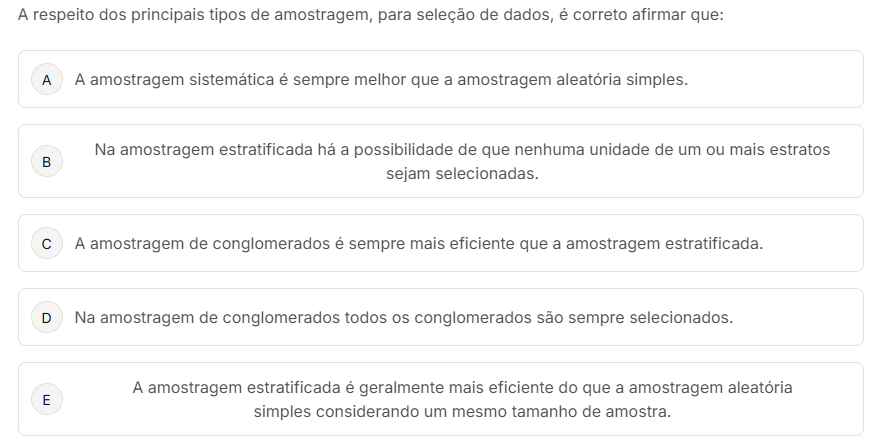 A respeito dos principais tipos de amostragem, para seleção de dados, é correto afirmar que: A A amostragem sistemática é sempre melhor que a amostragem aleatória simples. Na amostragem estratificada a possibilidade de que nenhuma unidade de um ou mais estratos B sejam selecionadas. C A amostragem de conglomerados é sempre mais eficiente que a amostragem estratificada. D Na amostragem de conglomerados todos conglomerados são sempre selecionados. A amostragem estratificada é geralmente mais eficiente do que a amostragem aleatória E simples considerando um mesmo tamanho de amostra.