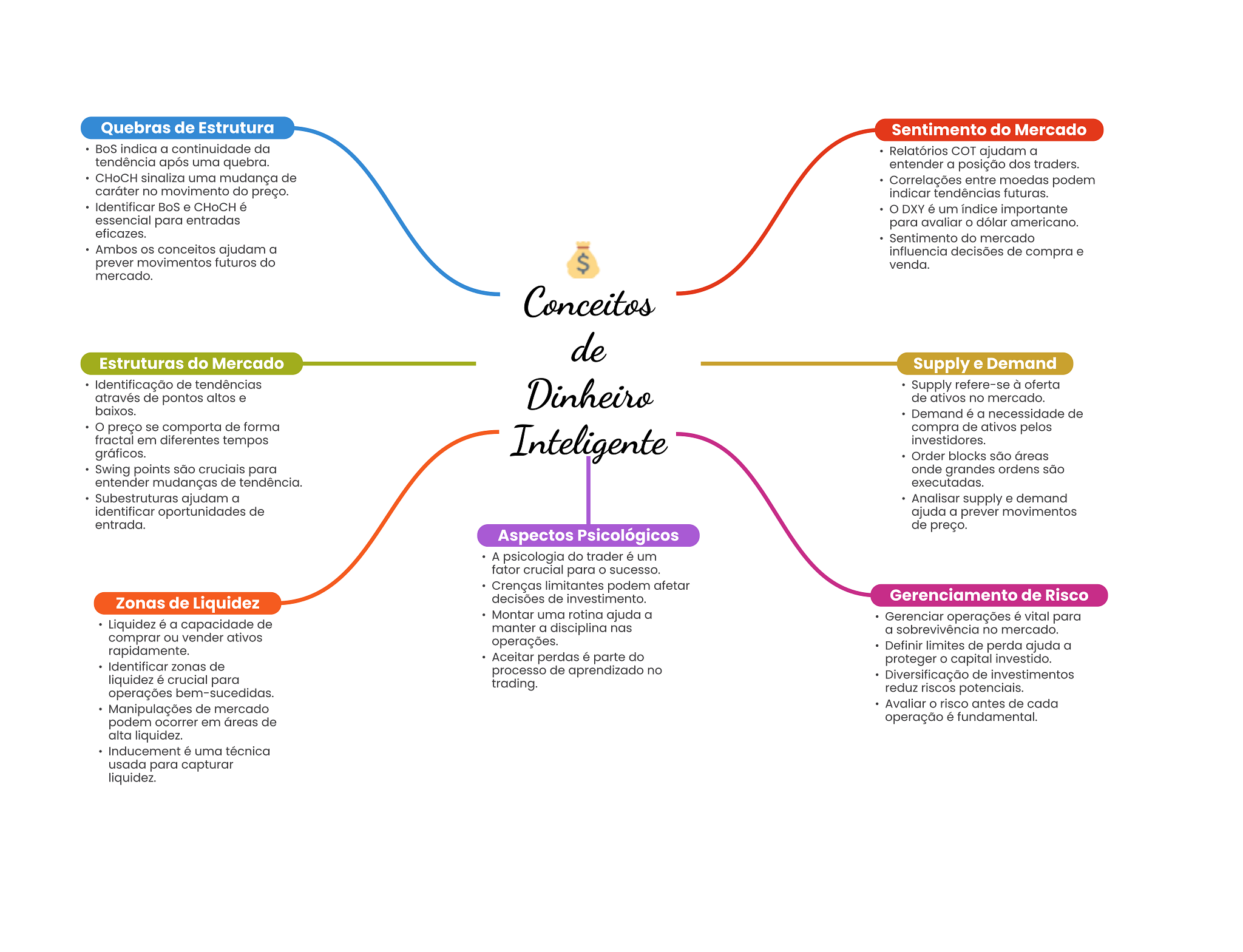 Quebras de Estrutura Sentimento do Mercado BoS indica a continuidade da Relatórios COT ajudam a tendência após uma quebra. entender a posição dos traders. CHoCH sinaliza uma mudança de Correlações entre moedas podem caráter no movimento do preço. indicar tendências futuras. Identificar BoS e CHoCH é DXY é um índice importante essencial para entradas para avaliar O dólar americano. eficazes. Sentimento do mercado Ambos conceitos ajudam a influencia decisões de compra e prever movimentos futuros do $ venda. mercado. Conceitos de Estruturas do Mercado Supply e Demand Identificação de tendências Dinheiro Supply refere-se à oferta através de pontos altos e de ativos no mercado. baixos. Demand é a necessidade de preço se comporta de forma compra de ativos pelos fractal em diferentes tempos gráficos. Inteligente investidores. Order blocks são áreas Swing points são cruciais para onde grandes ordens são entender mudanças de tendência. executadas. Subestruturas ajudam a Analisar supply e demand identificar oportunidades de ajuda a prever movimentos entrada. de preço. Aspectos Psicológicos A psicologia do trader é um fator crucial para sucesso. Crenças limitantes podem afetar decisões de investimento. Gerenciamento de Risco Zonas de Liquidez Montar uma rotina ajuda a Gerenciar operações é vital para Liquidez é a capacidade de manter a disciplina nas a sobrevivência no mercado. comprar ou vender ativos operações. rapidamente. Definir limites de perda ajuda a Aceitar perdas é parte do Identificar zonas de proteger O capital investido. processo de aprendizado no liquidez é crucial para Diversificação de investimentos trading. operações bem-sucedidas. reduz riscos potenciais. Manipulações de mercado Avaliar risco antes de cada podem ocorrer em áreas de operação é fundamental. alta liquidez. Inducement é uma técnica usada para capturar liquidez.