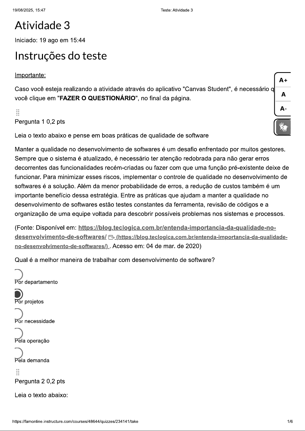 19/08/2025, 15:47 Teste: Atividade 3 Atividade 3 Iniciado: 19 ago em 15:44 Instruções do teste Importante: A+ Caso você esteja realizando a atividade através do aplicativo "Canvas Student", é necessário q A você clique em "FAZER QUESTIONÁRIO", no final da página. A- Pergunta 1 0,2 pts Leia texto abaixo e pense em boas práticas de qualidade de software Manter a qualidade no desenvolvimento de softwares é um desafio enfrentado por muitos gestores. Sempre que sistema é atualizado, é necessário ter atenção redobrada para não gerar erros decorrentes das funcionalidades recém-criadas ou fazer com que uma função pré-existente deixe de funcionar. Para minimizar esses riscos, implementar controle de qualidade no desenvolvimento de softwares é a solução. Além da menor probabilidade de erros, a redução de custos também é um importante benefício dessa estratégia. Entre as práticas que ajudam a manter a qualidade no desenvolvimento de softwares estão testes constantes da ferramenta, revisão de códigos e a organização de uma equipe voltada para descobrir possíveis problemas nos sistemas e processos. (Fonte: Disponível em: desenvolvimento-de-softwares/ (https://blog.teclogica.com.br/entenda-importancia-da-qualidade- no-desenvolvimento-de-softwares/). Acesso em: 04 de mar. de 2020) Qual é a melhor maneira de trabalhar com desenvolvimento de software? Por departamento Por projetos Por necessidade Pela operação Pela demanda Pergunta 2 0,2 pts Leia texto abaixo: https://famonline.instructure.com/courses/48644/quizzes/234141/take 1/619/08/2025, 15:47 Teste: Atividade 3 Métricas para DevOps: por onde começar? Apesar de DevOps não possuir nenhum framework oficial como é comum às metodologias voltadas para desenvolvimento de software existem alguns parâmetros que podem ser utilizados para avaliar eficientemente o desempenho das implementações. De modo geral, as métricas para DevOps lidam com as questões de deployment, operações e suporte, como velocidade do desenvolvimento de aplicações, resposta do consumidor, porcentagens de erros e falhas, volume de pedidos e tempo de reparo, por exemplo. A+ A maioria dessas métricas se divide em três categorias: A Processos A- Aqui se encaixam as métricas voltadas para a análise da velocidade, eficiência, produtividade e segurança dos processos de desenvolvimento de software. Alguns exemplos de Key Indicators (KPIs) utilizados são a frequência e velocidade de deployment, velocidade de verifica do software (QA), Tempo Médio Para Restaurar o Serviço (TMPRS), entre outros. Pessoas A influência das pessoas envolvidas no processo de produção costuma ser um dos aspectos mais difíceis de medir em uma empresa. Métricas voltadas para as pessoas geralmente incluem tempo de resposta, turnover (ou rotatividade de pessoal) e capacidade, por exemplo. Outra possibilidade são os indicadores mais subjetivos e culturais, como grau de autonomia, fluidez no trabalho e compartilhamento de conhecimento das equipes. Tecnologia As métricas de tecnologia avaliam uptime (tempo em atividade) dos sistemas, redes e aplicações, e também as taxas de erros, como, por exemplo, número de incidentes por release de produto ou serviço. (Fonte: Disponível em: https://gaea.com.br/metricas-para-devops-conheca-as-mais- importantes/ em: 04 de mar. de 2020) As métricas e indicadores nos ajudam a entender que: Processos, pessoas e tecnologia são categorias que trabalham independentemente, e indicadores cabem a tecnologia medir num estado geral, de maneira que processos e pessoas, tem indicadores de exceção; Pessoas, processos e tecnologia andam interligados, e em cada categoria dessa é possível criar indicadores e confrontá-los para averiguar andamento de um projeto de software, e com dados reais pode-se diminuir erros Métricas são utilizadas em de desenvolvimento e implementação, mas a gestão olha apenas os indicadores referentes a pessoas, processos e tecnologia tem gestão separadas 2/619/08/2025, 15:47 Teste: Atividade 3 Os indicadores referentes a pessoas, se aplicam a desenvolvimento pessoal refletindo a como as pessoas desempenham suas funções, sem ligação de como efetuam seu trabalho ou como usam a tecnologia Indicadores se aplicam a pessoas e processos, a tecnologia tem outros padrões de medição separados do desenvolvimento de software, as áreas de operação não se misturam com as áreas de tecnologia A+ Pergunta 3 0,2 pts A Leia texto abaixo: A- Uma validação de software é uma atividade que tem como objetivo assegurar que produto fin corresponda aos requisitos do software, comprovando a inexistência de erros ("BUG"). Visando melhorar aprendizado e prática em validação, abaixo segue alguns casos e dicas para melho sua validação: Identificar e detalhar que será validado, isto pode incluir software em si, os requisitos, e outros tipos de documentos, por exemplo: documentação, demonstrações, etc. Definir e implementar uma estratégia de validação, ou seja, definir como será feita e que necessita para ser feita. Definir critérios e procedimentos para a validação, por exemplo, tempo de resposta, tolerância a falhas etc. Garantir a execução das atividades de validação. Por meio das reuniões de revisão, por exemplo. (Fonte: Disponível em: tecnospeed/post/boas-praticas-de-validacao em: 04 de mar. de 2020) Considerando o texto acima, avalie as asserções a seguir e a relação proposta entre elas: I. A validação de software é necessária dentro de um processo de desenvolvimento e qualidade de software. PORQUE II. Só a partir de testes e validação feita por desenvolvedores e usuários é possível evitar os bugs. A respeito das asserções acima, assinale a alternativa correta: As asserções e são proposições verdadeiras, e a é uma justificativa da I. A asserção I é uma proposição verdadeira, e a é uma proposição falsa. As asserções I e são proposições verdadeiras, 