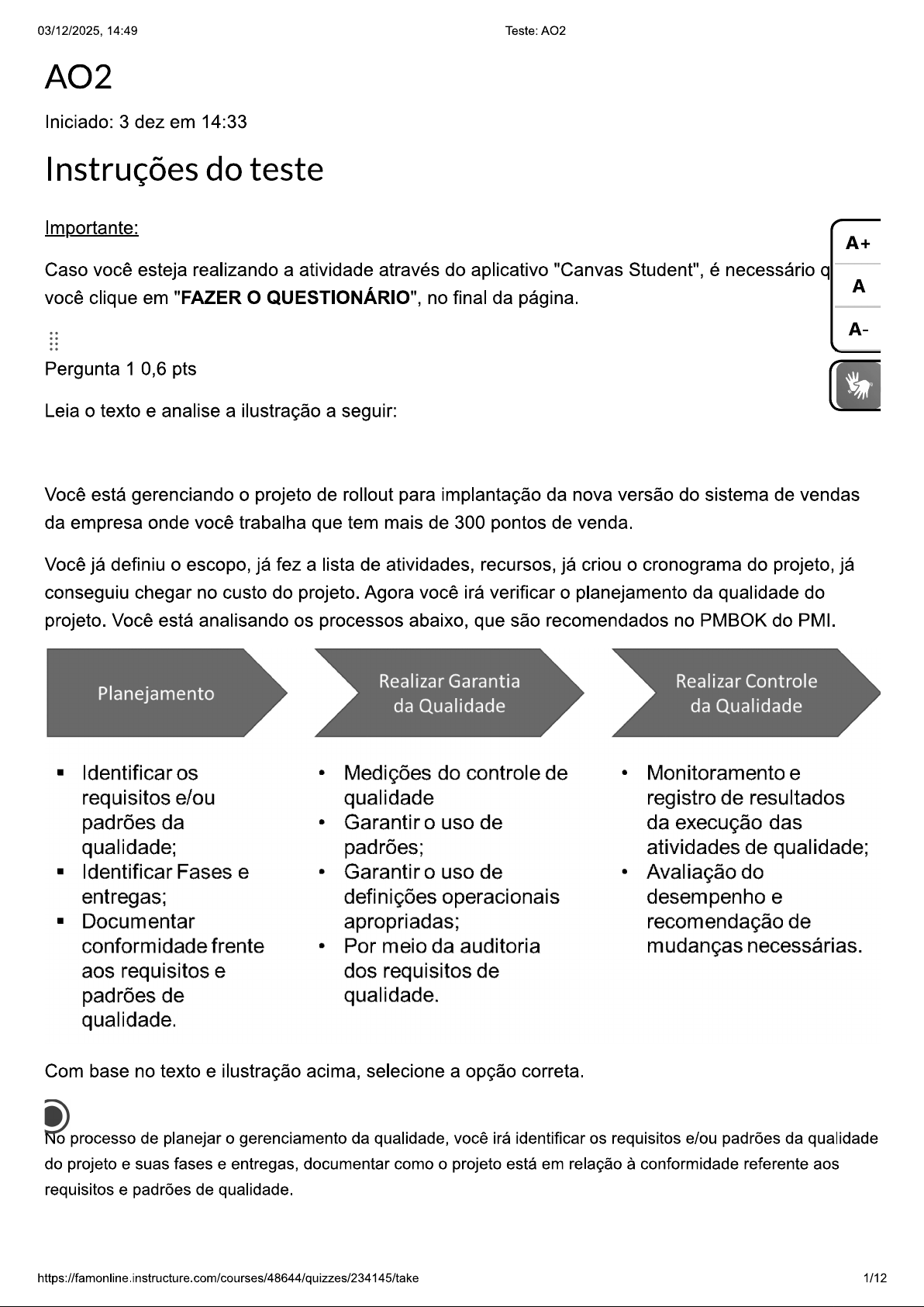 03/12/2025, 14:49 Teste: AO2 AO2 Iniciado: 3 dez em 14:33 Instruções do teste Importante: A+ Caso você esteja realizando a atividade através do aplicativo "Canvas Student", é necessário q A você clique em "FAZER QUESTIONÁRIO", no final da página. A- Pergunta 1 0,6 pts Leia texto e analise a ilustração a seguir: Você está gerenciando projeto de rollout para implantação da nova versão do sistema de vendas da empresa onde você trabalha que tem mais de 300 pontos de venda. Você já definiu escopo, já fez a lista de atividades, recursos, já criou cronograma do projeto, já conseguiu chegar no custo do projeto. Agora você irá verificar planejamento da qualidade do projeto. Você está analisando os processos abaixo, que são recomendados no PMBOK do PMI. Realizar Garantia Realizar Controle Planejamento da Qualidade da Qualidade Identificar os Medições do controle de Monitoramento e requisitos e/ou qualidade registro de resultados padrões da Garantir uso de da execução das qualidade; padrões; atividades de qualidade; Identificar Fases e Garantir o uso de Avaliação do entregas; definições operacionais desempenho e Documentar apropriadas; recomendação de conformidade frente Por meio da auditoria mudanças necessárias. aos requisitos e dos requisitos de padrões de qualidade. qualidade. Com base no texto e ilustração acima, selecione a opção correta. No processo de planejar o gerenciamento da qualidade, você irá identificar os requisitos e/ou padrões da qualidade do projeto e suas fases e entregas, documentar como o projeto está em relação à conformidade referente aos requisitos e padrões de qualidade. 1/1203/12/2025, 14:49 Teste: AO2 No processo de realizar o controle da qualidade, a auditoria dos requisitos de qualidade será o resultado das medições do controle de qualidade que servem para garantir uso dos padrões de qualidade e das definições operacionais apropriadas. No processo de realizar a garantia da qualidade, serão efetuados todos os testes necessários para que o sistema que está sendo desenvolvido tenha a qualidade mínima exigida pelo usuário. A+ No processo de planejar o gerenciamento da qualidade, serão planejados todos os testes necessários para A sistema, que está sendo desenvolvido, tenha a qualidade mínima exigida pelo usuário. A- No processo de realizar a garantia da qualidade, o monitoramento e registro dos resultados da execução atividades de qualidade, servem para avaliar desempenho e recomendar mudanças necessárias. Pergunta 2 0,6 pts Leia texto a seguir: A gestão da qualidade de software consiste em vários conceitos, sendo parte deles, aplicados ao processo de desenvolvimento e teste, gerando uma gama de atividades que em conjunto podem garantir um software com qualidade, essas atividades são realizadas em ciclos, sendo o Processo de Testes X Processo de Desenvolvimento. Roger S. Pressman (2011) afirma que processo de software é dividido em cinco atividades que fazem parte de uma metodologia genérica, são elas Comunicação, Planejamento, Modelagem, Construção e Emprego. Com essas atividades se faz necessário uso de uma metodologia (ágil, adaptável e flexível) de processo, uso da metodologia é uma base para desenvolvimento e teste, aplicando-a corretamente. Atualmente faz-se difícil a aplicação à risca de uma metodologia, é necessário adaptá-la, ser ágil e flexível, para isso, é preciso que os envolvidos colaborem e tenham em mente lucro intelectual que a equipe vai ter ao final do ciclo. De onde tudo começa e quando termina? Bem, em poucas palavras, desenvolver um software consiste em um problema e uma solução. Durante toda nossa vida, nos deparamos com problemas e mais problemas em nosso dia, seja no problema na sua cozinha, onde sua geladeira que antes não tinha sensor para avisar quando faltar gelo, sensor para avisar que a porta estava aberta a um problema em um equipamento que faz cirurgias remotamente, onde um sensor especifico traz um resultado inesperado/inconsistente, até nos Smartphones, quando deixamos de ouvir ele tocar, por conta de um problema no software ou hardware. Referencia : de-software-processo-helder/ 2/1203/12/2025, 14:49 Teste: AO2 Segundo o texto lido avalie a asserções abaixo: I. Desenvolver um software é um processo relativamente semelhante ao nosso processo de existência. A+ Porque A A- II. Consiste basicamente em problemas e soluções que quando mapeados a tempo nos dão condições de uma melhor resolução. A partir das asserções assinale a alternativa: As asserções I e são proposições falsas. As asserções I e são proposições verdadeiras, e a é uma justificativa da I. A asserção I é uma proposição falsa, e a é uma proposição verdadeira. A asserção I é uma proposição verdadeira, e a é uma proposição falsa. As asserções I e são proposições verdadeiras, mas a não é uma justificativa da I. Pergunta 3 0,6 pts Leia o texto a seguir: De quem é a culpa da má qualidade dos softwares? Acho que todos já ouvimos falar sobre modelos de maturidade como CMMI ou MPS.BR e processos como o RUP, Scrum ou Quase sempre isso vem acompanhado de comentários críticos e pessimistas de como a nossa empresa está longe de ser madura e prover produtos de qualidade. Por outro lado, mesmo empresas que investem em maturidade do processo muitas vezes esquecem que ele não é uma bala de prata. Não existe processo ótimo sem ótimas pessoas. É um mito industrial a possibilidade de criar um processo perfeito que seja independentemente do nível e da maturidade dos indivíduos envolvidos. Isso pode ser bem observado na literatura sobre processos. Processos "pesados" ou rígidos são recomendados quando há equipes imaturas, sem experiência e disciplina adequadas. Já com equipes experientes, maduras e disciplinadas quase não existe necessidade de processo. 3/1203/12/2025, 14:49 Teste: AO2 Por isso é que os processos ágeis, por exemplo