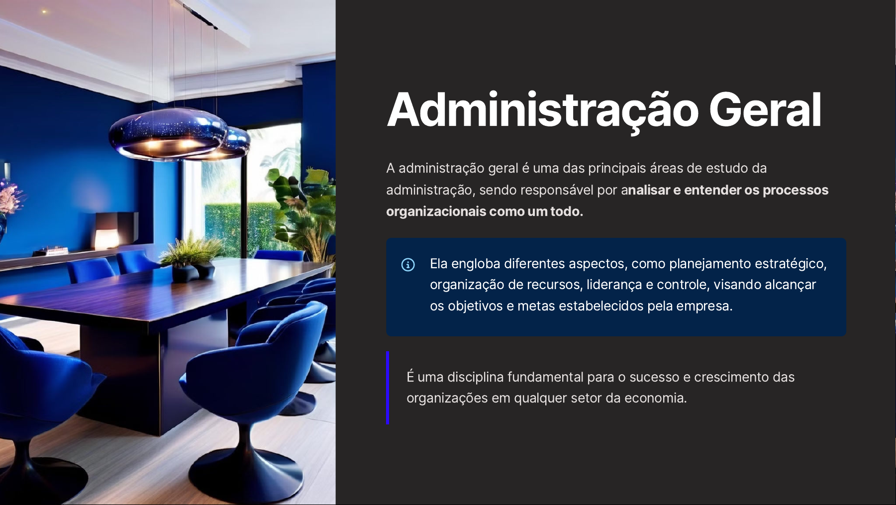 Administração Geral A administração geral é uma das principais áreas de estudo da administração, sendo responsável por analisar e entender os processos organizacionais como um todo. Ela engloba diferentes aspectos, como planejamento estratégico, organização de recursos, liderança e controle, visando alcançar os objetivos e metas estabelecidos pela empresa. É uma disciplina fundamental para o sucesso e crescimento das organizações em qualquer setor da economia. Teorias da Administração e das Organizações 1Modelo Clássico Ênfase na tarefa e na tecnologia Fundamentado na estrutura organizacional. Busca eficiência por meio da racionalização. Preocupação com o conteúdo do cargo. Baseado em ordens e imposições. Trabalhador obedece e executa. Conceito de Homo economicus. Recompensas salariais e materiais. 2 Modelo Humanístico Ênfase na pessoa e no grupo social Fundamentado na interação e na dinâmica de grupo. Busca eficiência via satisfação e interação entre pessoas. Preocupação com o contexto do cargo (entorno social). Baseado em comunicações. Trabalhador participa das decisões. Conceito de Homo social. Recompensas sociais e simbólicas.3Teoria Científica Expoente: Taylor Homem Econômico. Ênfase nas Tarefas. Palavras-chave: Estudo de tempos e movimentos; Especialização e divisão do trabalho; Padronização; Remuneração por Produtividade; Visão microscópica / mecanicista do homem. 4 Teoria Burocrática Expoente: Max Weber Homem Organizacional. Ênfase na Estrutura. Características: Impessoalidade; Profissionalização; Procedimentalização; Formalização; Previsibilidade; Meritocracia. Críticas: Rigidez; Lentidão; Falta de incentivo à inovação; Foco nos processos e não nos resultados. 5Teoria Comportamental Expoente: Simon McGregor Homem Administrativo. Ênfase nas Pessoas e no Ambiente. Características: O homem é um ser social dotado de necessidades; Nascimento das Teorias de Motivação e Liderança. Processo Organizacional / Processo Administrativo (Funções Administrativas) Características básicas do processo organizacional (Chiavenato): 1Cíclico e repetitivo: Permanente e contínuo. Em cada ciclo, o processo tende a melhorar. 2 É sistêmico: Deve ser analisado como um todo, e não cada função isoladamente. 3É interativo: Cada função interage com as demais. É um processo sequencial, embora não rigidamente seguido, sujeito a melhorias e correções. Exemplo: O gestor deve: Planejar (planejamento). Organizar os recursos para alcance da estratégia organizacional (organização). Dirigir a implementação dos planos (direção). Certificar-se de que a organização está seguindo o rumo de seus objetivos (controle). Fayol - Funções Administrativas 1Planejamento Objetivos claros: Missão definida. Programação de atividades. Recursos dimensionados. Acompanhamento definido. 2 Organização Distribuição de tarefas: Atividades designadas. Recursos alocados. Responsabilidades atribuídas. 3Direção Coordenação: Pessoal designado. Comunicação, liderança, motivação e orientação. Condução e coordenação das tarefas. 4 Controle e Avaliação Gestão de desvios: Padrões definidos. Monitoramento e avaliação. Planejamento 1Definição de Planejamento Definição de Djalma de Oliveira: Processo desenvolvido para o alcance de uma situação futura desejada, de um modo mais eficiente, eficaz e efetivo, com a melhor concentração de esforços e recursos pela empresa. 2 Componentes do Planejamento Estabelecer objetivos/resultados a serem alcançados. Determinar como/maneira pela qual esses objetivos devem ser alcançados. Definir parâmetros de controle. 3Fases do Planejamento Não há consenso sobre as fases do planejamento. Chiavenato: Planejamento se inicia na definição dos objetivos. Djalma Oliveira: Planejamento se inicia no diagnóstico estratégico. 4 Níveis de Planejamento Estratégico:1. Pensa em toda a organização. Foco no longo prazo (2-5 anos). Objetivos gerais e abrangentes. Contém conteúdo genérico e sintético. Execução e avaliação e controle de todo o processo. Indicador: Parâmetro selecionado e considerado isoladamente ou em combinação com outro. Índice: Valor numérico que representa a correta interpretação da realidade. Tático:2. Pensa no departamento, visando o médio prazo. Abrange os objetivos de forma mais detalhada (ex: Departamento de Marketing). Trata da alocação de recursos. Operacional:3. Preocupa-se com a execução (atividade ou tarefa). Visão de curto prazo. Conteúdo bem detalhado e analítico. Define atividades, formas de controle e recursos necessários para a execução dos cursos de ação. 1Missão Missão: Razão de ser da organização (por que ela existe?). Define as necessidades a serem atendidas pela organização. 2 Visão Visão: Descreve onde a empresa quer chegar no futuro (daqui vários anos). 3Negócio Negócio: Relacionado com as atividades principais da organização naquele momento. 4 Valores Valores: Exemplificando, segue os valores da RFB: "Respeito ao cidadão, Integridade, Lealdade com a instituição, etc." Objetivos, Metas e Planos 1 Objetivos Objetivos: Abrangentes ou específicos, sem definir quando ou quanto. São elementos qualitativos, como "ficar magro". 2 Metas Metas: Especificam quando e quanto queremos atingir determinado objetivo. Por exemplo, "perder 5,0 kg". As metas são estabelecidas nos respectivos planos (estratégico, tático e operacional). 3 Planos Planos: Descrevem as ações e passos necessários para que os objetivos sejam atingidos. É a descrição de como o planejamento deve ser executado. 1Matriz SWOT Internos (Controláveis): Weakness (Fraquezas) Strengths (Forças) Externos (Incontroláveis): Threats (Ameaças) 2 Estratégias de Sobrevivência Redução de custos Desinvestimento 3Estratégias de Manutenção Estabilidade Especialização Nicho 4 Estratégias de Crescimento Inovação Internacionalização 