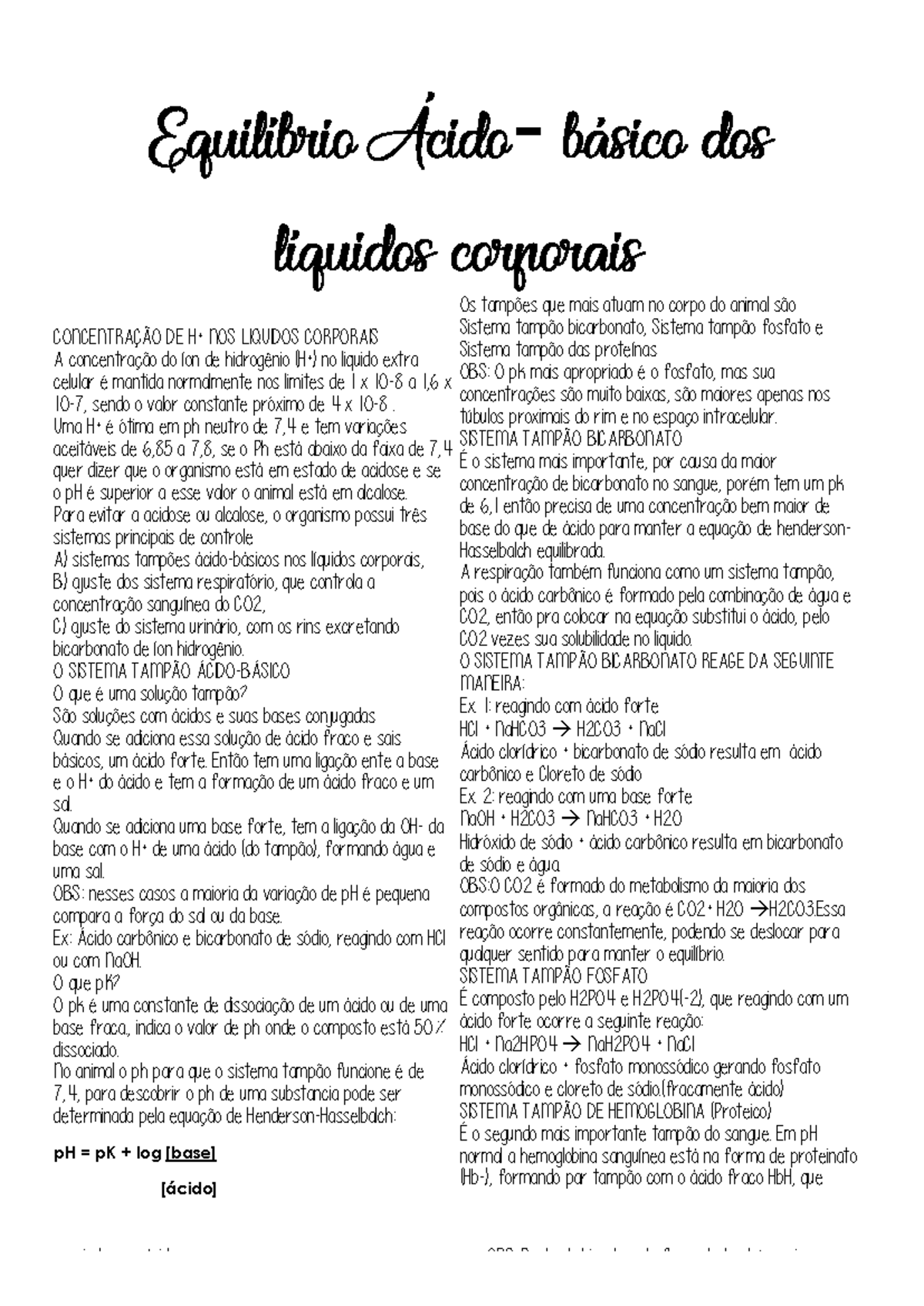 Equilibrio Ácido- básico dos liquidos corporais Os tampões que mais atuam no corpo do animal CONCENTRAÇÃO DE H+ nos LIQUDOS CORPORAIS Sistema tampão bicarbonato, Sistema tampão fosfato e A concentração do de hidrogênio no liquido extra Sistema tampão das celular é mantida nos limites de X 10-8 1,6 X OBS: 0 pk mais apropriado é 0 fosfato, mas sua 10-7, sendo 0 constante próximo de 4 X 10-8 concentrações muito baixas, apenas nos Uma H+ é ótima em ph neutro de 7,4 e tem variações túbulos proximais do rim e no espaço SISTEMA TAMPÃO BC ARBONATO aceitáveis de 6,85 7,8, se 0 Ph está abaixo de 7, 4 quer dizer que 0 ganismo em estado de acidose e se É 0 sistema mais importante, por causa maior 0 pH é superior esse vdor 0 animal em concentração de bicarbonato no sangue, porém tem um pk Para evitor acidose alcalose, 0 organismo possui três de 6, então precisa de uma concentração bem maior de sistemas principais de controle base do que de ácido para manter equação de henderson- A) sistemas tampões ácido-básicos nos líquidos Hasselbalch B) ajuste dos sistema respiratório, que controla A respiração também funciona como um sistema tampão, concentração do pois 0 ácido carbônico é formado pela combinação de água e C) ajuste do sistema urinário, com OS rins excretando então pra cobcar equação substitui 0 ácido, pelo bicarbonato de hidrogênio. vezes solubilidade no 0 SISTEMA TAMPÃO ÁCDO-BÁSICO 0 SISTEMA AMP ÃO BC ARBONATO REAGE DA SEGUINTE 0 que é uma solução tampão? São soluções com ácidos e suas bases conjugadas Ex reagindo com ácido forte Quando se essa solução de ácido fraco e sais HCI H2C03 básicos, um ácido forte Então tem uma ligação ente base Ácido bicarbonato de resulta em ácido e 0 H+ do ácido e tem formação de um ácido fraco e um carbônico e Cloreto de sd. Ex 2: com uma base forte Quando se uma base forte, tem ligação OH- naOH H2C03 H20 base com 0 H+ de uma ácido (do tampão), formando àgua e Hidróxido de ácido carbônico resulta em bicarbonato uma sal. de sódio e água OBS: nesses casos maioria variação de pH é pequena é formado do metabolismo da maioria dos compara força do sd da base compostos orgânicas, reação é H20 Ex: Ácido carbônico e bicarbonato de sódio, reagindo com HCI reação ocorre constantemente, podendo se deslocar para ou com qudquer sentido para manter 0 0 que pk? SISTEMA TAMPÃO FOSF ATO 0 pk é uma constante de dissociação de um ácido de uma É composto pelo e que reagindo com um base indica 0 valor de ph onde 0 composto 50% ácido forte ocorre seguinte reação: HCI no animal 0 ph para que 0 sistema tampão funcione é de Ácido clorídrico fosfato monossódico gerando fosfato 7,4, para descobrir 0 ph de uma substancia pode ser e cloreto de ácido) determinada pela equação de SISTEMA TAMPÃO DE HEMOGLOBINA (Proteico) É 0 segundo importante tampão do sangue Em pH pH = + log [base] 0 hemoglobina sanguínea na forma de proteinato formando par tampão com 0 ácido HbH, que [ácido]