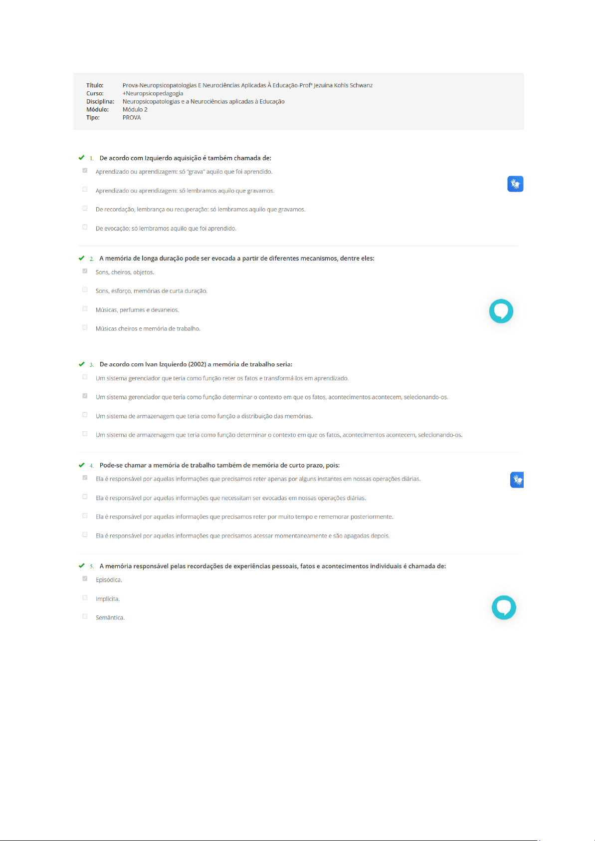 Título: Prova-Neuropsicopatologias E Neurociências Aplicadas À Jezuina Kohls Schwanz Curso: +Neuropsicopedagogia Disciplina: Neuropsicopatologias e a Neurociências aplicadas à Educação Módulo: Módulo 2 Tipo: PROVA 1. De acordo com Izquierdo aquisição é também chamada de: Aprendizado ou aprendizagem: só "grava" aquilo que foi aprendido. Aprendizado ou aprendizagem: só lembramos aquilo que gravamos. De recordação, lembrança ou recuperação: só lembramos aquilo que gravamos. De evocação: só lembramos aquilo que foi aprendido. 2. A memória de longa duração pode ser evocada a partir de diferentes mecanismos, dentre eles: Sons, cheiros, objetos. Sons, esforço, memórias de curta duração. Músicas, perfumes e devaneios. Músicas cheiros e memória de trabalho. 3. De acordo com Ivan Izquierdo (2002) a memória de trabalho seria: Um sistema gerenciador que teria como função reter os fatos e transformá-los em aprendizado. Um sistema gerenciador que teria como função determinar contexto em que os fatos, acontecimentos acontecem, selecionando-os. Um sistema de armazenagem que teria como função a distribuição das memórias. Um sistema de armazenagem que teria como função determinar contexto em que os fatos, acontecimentos acontecem, selecionando-os. 4. Pode-se chamar a memória de trabalho também de memória de curto prazo, pois: Ela é responsável por aquelas informações que precisamos reter apenas por alguns instantes em nossas operações diárias. Ela é responsável por aquelas informações que necessitam ser evocadas em nossas operações diárias. Ela é responsável por aquelas informações que precisamos reter por muito tempo e rememorar posteriormente. Ela é responsável por aquelas informações que precisamos acessar momentaneamente e são apagadas depois. 5. A memória responsável pelas recordações de experiências pessoais, fatos e acontecimentos individuais é chamada de: Episódica. Implícita. Semântica.6. A memória implícita, também chamada de memória de procedimento (não declarativa) é responsável por: Armazenar dados relacionados com a aquisição de habilidades mediante repetição. Selecionar os dados que serão posteriormente passados para a memória de longo prazo. Selecionar os dados que contribuirão para a aprendizagem de novas habilidades. Armazenar dados relacionados com a distribuição de informações mediante repetição. 7. Por que a memória de longo prazo é assim chamada? Pela sua capacidade de armazenar informações durante longos períodos de tempo. Pela sua capacidade de armazenar informações durante pequenos períodos de tempo. Pela capacidade de armazenagem de um grande número de informações. Pela capacidade de armazenagem de um grande número de informações por longos períodos de tempo. 8. Em que consiste a memória sensorial-motora? Consiste em um depósito com capacidade ilimitada que armazena a saída do sistema sensorial. Consiste em um depósito com capacidade limitada que armazena a saída do sistema sensorial. Consiste em um sistema de memória responsável pelas sensações. 9. Os processos de aquisição da leitura ocorrem gradativamente a partir do momento em que entramos em contato com: Os sinais gráficos, isso pode ocorrer durante processo de escolarização ou mesmo antes. Os sons, isso pode ocorrer durante processo de escolarização ou mesmo antes. Os sinais gráficos, isso necessariamente ocorre logo depois do ingresso a educação formal. Os livros, isso pode ocorrer durante o processo de escolarização ou mesmo antes. 10. De que podemos chamar evocação? Recordação, lembrança ou rememoração. Recordação, lembrança ou recuperação. Recordação, assimilação ou lembrança. Recordação, rememoração ou recuperação.