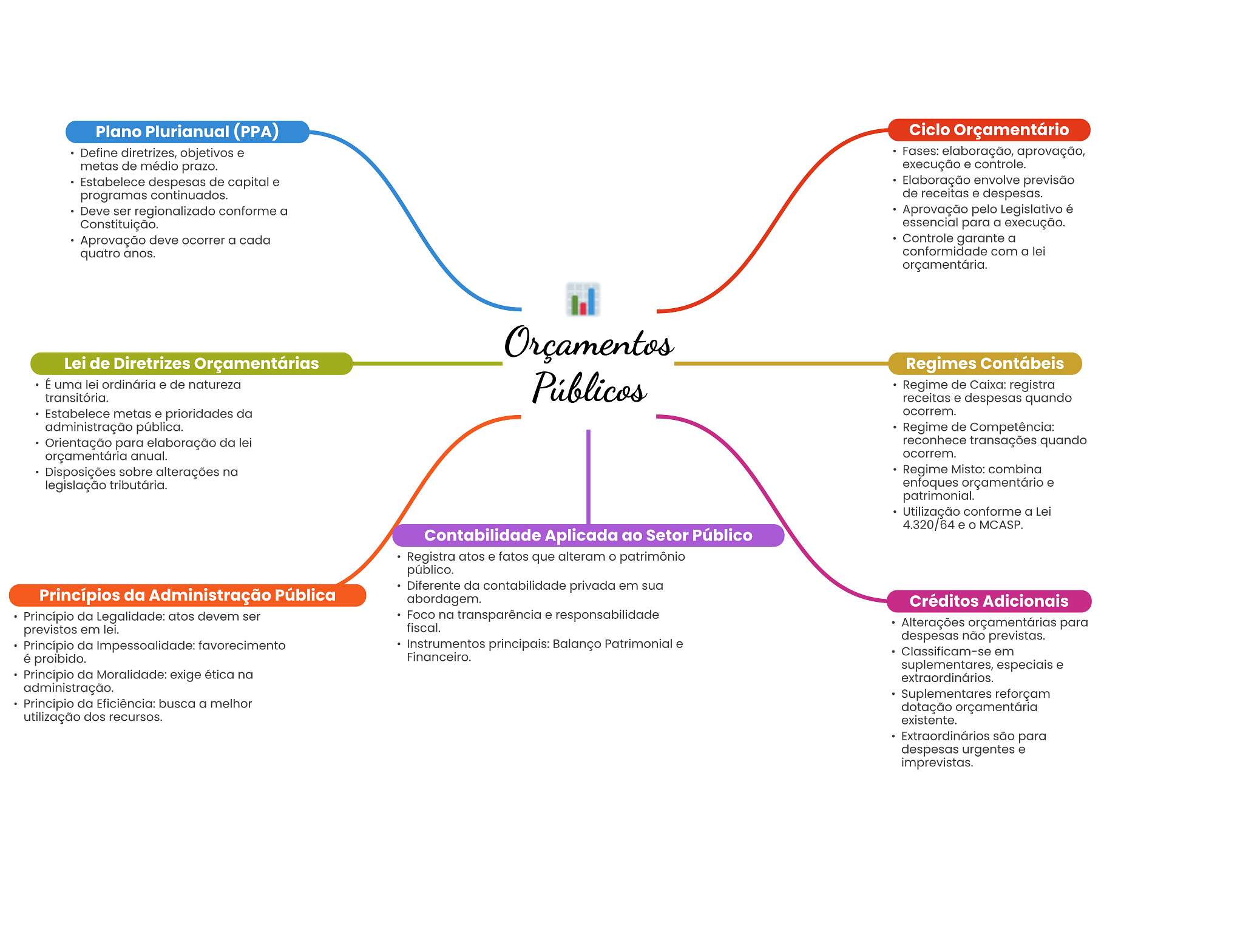 Plano Plurianual (PPA) Ciclo Orçamentário Define diretrizes, objetivos e Fases: elaboração, aprovação, metas de médio prazo. execução e controle. Estabelece despesas de capital e Elaboração envolve previsão programas continuados. de receitas e despesas. Deve ser regionalizado conforme a Aprovação pelo Legislativo é Constituição. essencial para a execução. Aprovação deve ocorrer a cada Controle garante a quatro anos. conformidade com a lei orçamentária. Orçamentos Lei de Diretrizes Orçamentárias Regimes Contábeis É uma lei ordinária e de natureza Públicos Regime de Caixa: registra transitória. receitas e despesas quando Estabelece metas e prioridades da ocorrem. administração pública. Regime de Competência: Orientação para elaboração da lei reconhece transações quando orçamentária anual. ocorrem. Disposições sobre alterações na Regime Misto: combina legislação tributária. enfoques orçamentário e patrimonial. Utilização conforme a Lei 4.320/64 e MCASP. Contabilidade Aplicada ao Setor Público Registra atos e fatos que alteram patrimônio público. Diferente da contabilidade privada em sua Princípios da Administração Pública abordagem. Créditos Adicionais Princípio da Legalidade: atos devem ser Foco na transparência e responsabilidade previstos em lei. fiscal. Alterações orçamentárias para despesas não previstas. Princípio da Impessoalidade: favorecimento Instrumentos principais: Balanço Patrimonial e Financeiro. Classificam-se em é proibido. suplementares, especiais e Princípio da Moralidade: exige ética na extraordinários. administração. Suplementares reforçam Princípio da Eficiência: busca a melhor dotação orçamentária utilização dos recursos. existente. Extraordinários são para despesas urgentes e imprevistas.