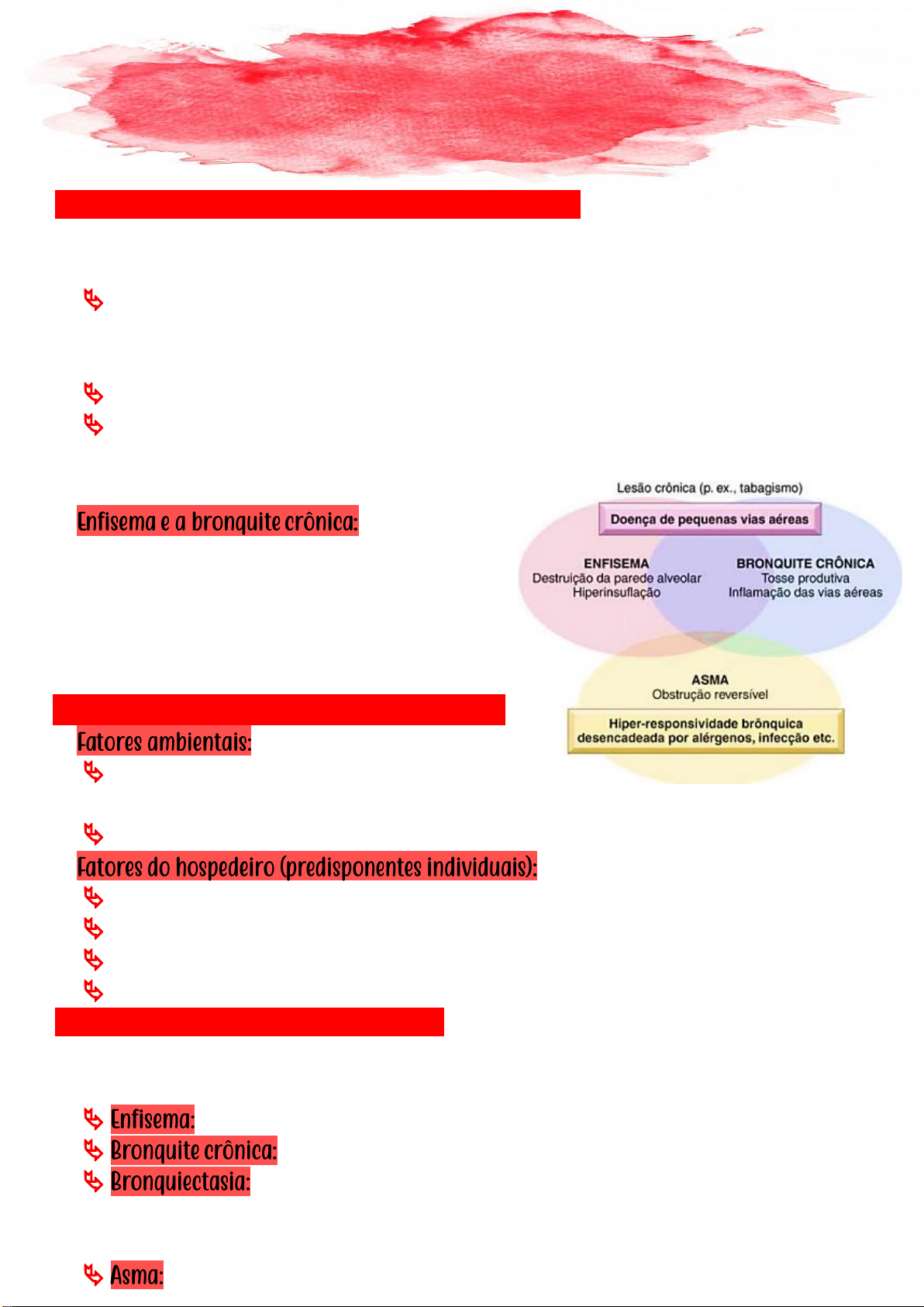 DPOC e ASMA Doença pulmonar obstrutiva crônica (DPOC): ocorre a partir de uma resposta inflamatória crônica frente a partículas nocivas e gases nos pulmões. • É caracterizada por limitação do fluxo de ar persistente e progressiva Tabaco ✓ Tabagista susceptível (fatores genéticos, infecções, alteração na imunorregulação). Combustível de biomassa Exposição ocupacional • Ocorre obstrução parcial ou total da traqueia e brônquios maiores podendo chegar aos bronquíolos terminais e respiratórios. • geralmente são considerados em conjunto e referidos como doença pulmonar obstrutiva crônica (DPOC) e comumente compartilham um agente agressor principal, o tabagismo e a dispneia como característica clínica. Fatores ambientais x hospedeiro: • Tabagismo (cigarro, charuto, cachimbo, maconha) – varia com a intensidade e o tempo do hábito. Exposição à poeira ocupacional, irritantes químicos e à poluição extra e intradomiciliar. • Alterações genéticas (deficiência de alfa1-antitripsina) Hiperresponsividade brônquica Redução do crescimento pulmonar Baixo nível socioeconômico Doenças pulmonares obstrutivas: • Apresentam limitação no fluxo de ar, por conta de obstrução completa ou incompleta. • Apresentam caráter difuso. São elas: perda da capacidade de recolhimento (pulmão hiperinsuflado) produção excessiva de muco dilatação permanente dos brônquios e bronquíolos causada pela destruição do músculo e tecido elástico de suporte, associada a infecções necrosantes crônicas ou resultante delas. estreitamento anatômico das vias aéreas. • Apresentam volume expiratório forçado no primeiro segundo (VEF1) diminuído. DPOC – diagnóstico: • Realização da anamnese e exame físico (DPOC deve ser considerada em qualquer paciente com dispneia, tosse crônica, produção de escarro, história de infecções recorrentes do trato respiratório e/ou história de exposição a fatores de risco para a doença). • Radiografia de tórax • Oximetria • Espirometria: padrão ouro para o diagnóstico e avaliação da DPOC – avaliar a limitação do fluxo aéreo. Bronquite crônica: • A causa mais comum da bronquite crônica é o tabagismo. • É definida a partir de características clinicas como tosse produtiva persistente durante 3 meses por 2 anos consecutivos, sem limitação do fluxo de ar. • Envolve principalmente as vias aéreas maiores. • Em casos mais severos, observa-se a bronquiolite (que envolve as vias aéreas menores). • Ocorre ativação da resposta imune inata frente partículas e gases inalados. • A grande característica da bronquite crônica é a hipersecreção de muco. • A resposta inflamatória se dá no epitélio das vias aéreas centrais e nas glândulas produtoras de muco: a inflamação reduz a função mucociliar e reduz a proteção da barreira epitelial nos espaços aéreos. Células do sistema imune inato secretam serino-proteases que estimulam a produção de muco Ocorre ainda a introdução do gene MUC5AC, com aumento da secreção de mucina. Patogênese – bronquite crônica: • Os agentes agressores causam inflamação da mucosa dos brônquios (linfócitos, neutrófilos e macrófagos). • da traqueia e brônquios e causando hipersecreção de muco nas pequenas vias aéreas. • O tabagismo causa lesão das células de revestimento e interfere na ação ciliar do epitélio respiratório. • A bronquite crônica é caracterizada por: tosse crônica (persistente), expectoração espessa e abundante (durante 3 meses ao ano durante 2 anos consecutivos), dispneia aos esforços, hipercapnia, hipoxemia, cianose, etc. • A bronquite crônica grave de longa data geralmente resulta em insuficiência cardíaca e cor pulmonale crônico. Enfisema: é definida a partir de características morfológicas como aumento de volume do espaço aéreo distal (alargamento) próximo aos bronquíolos terminais, por conta da destruição das paredes alveolares. • A causa mais comum de enfisema é o tabagismo. • Envolve os ácinos. • Ocorre redução do fluxo de ar expirado com diminuição da retração elástica do pulmão. • Possui 4 tipos: acomete os bronquíolos proximais afetados e alvéolos preservados. afeta desde os bronquíolos e alvéolos. Pode ocorrer de forma primária por deficiência de alfa-1-antitripsina. acomete a porção proximal normal e distal. Ocorre em áreas de fibrose, podendo apresentar estruturas típicas (bolhas). está associado a reparo por cicatrização em decorrência de doenças inflamatórias, é a forma mais comum dos enfisemas e geralmente é assintomática. • Definição de enfisema é a destruição tecidual sem fibrose. • Fatores genéticos envolvidos: Deficiência de alfa-1-antitripsina Polimorfismos do gene TGF-beta e de genes das metaloproteinases MMP-9 e MMP-12. Sinais e sintomas clínicos – enfisema: • Iniciam quando 1/3 do parênquima pulmonar estiver lesado. • A dispneia começa insidiosamente e é progressiva e gradual • Pode haver ou não tosse e sibilos (em alguns pacientes está é a queixa principal). • Ausculta pulmonar diminuída • Emagrecimento • perda de peso, tórax em barril, dispneia em repouso com prolongamento de expiração, o paciente senta-se inclinado para frente em posição encurvada e respira por lábios franzidos. • O desenvolvimento de insuficiência cardíaca congestiva e cor pulmonale está relacionada a hipertensão pulmonar secundária e é um prognóstico desfavorável. Asma: • É uma doença heterogênea, geralmente caracterizada por inflamação crônica das vias aéreas. É definida pela história de sintomas respiratórios, sibilos, falta de ar, opressão torácica e tosse, que variam ao longo do tempo e em intensidade, juntamente com uma limitação variável ao fluxo expiratório. • A hiperresponsividade brônquica (broncoespasmo) que limita o fluxo aéreo é parcialmente reversível (seja espon