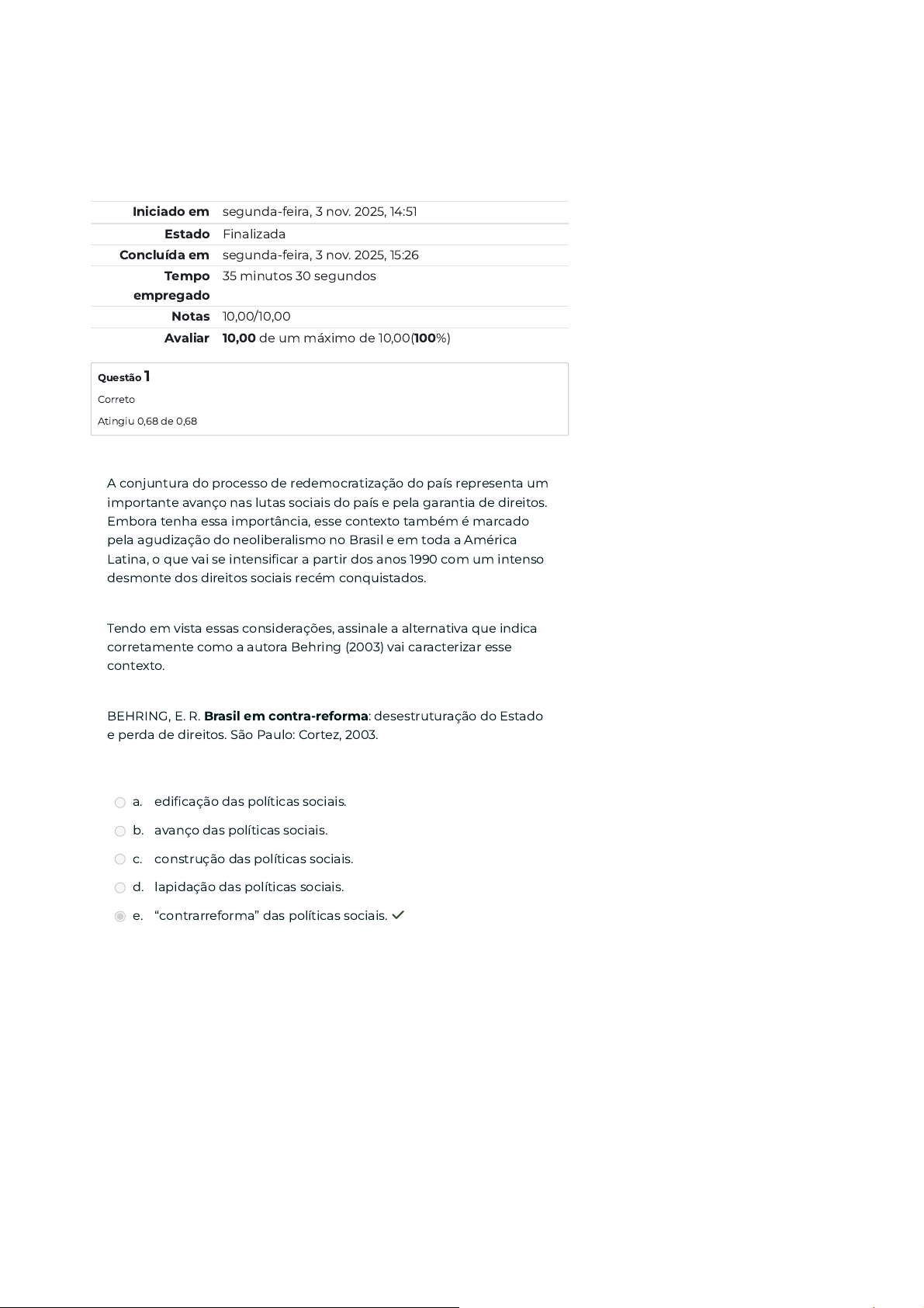 Iniciado em segunda-feira, 3 nov. 2025, 14:51 Estado Finalizada Concluída em segunda-feira, 3 nov. 2025, 15:26 Tempo empregado 35 minutos 30 segundos Notas 10,00/10,00 Avaliar 10,00 de um máximo de 10,00(100%) Questão 1 Correto Atingiu 0,68 de 0,68 A conjuntura do processo de redemocratização do país representa um importante avanço nas lutas sociais do país e pela garantia de direitos. Embora tenha essa importância, esse contexto também é marcado pela agudização do neoliberalismo no Brasil e em toda a América Latina, o que vai se intensificar a partir dos anos 1990 com um intenso desmonte dos direitos sociais recém conquistados. Tendo em vista essas considerações, assinale a alternativa que indica corretamente como a autora Behring (2003) vai caracterizar esse contexto. BEHRING, E. R. Brasil em contra-reforma: desestruturação do Estado e perda de direitos. São Paulo: Cortez, 2003. a. edificação das políticas sociais. b. avanço das políticas sociais. c. construção das políticas sociais. d. lapidação das políticas sociais. e. “contrarreforma” das políticas sociais. ✓ Questão 2 Correto Atingiu 0,67 de 0,67 Leia o excerto a seguir: “Em vista da complexidade do conceito de Estado, torna‐se absolutamente necessário evitar tratá‐lo parcialmente ou com estereótipos, como o que sugere que ele sempre está voltado para o bem comum ou que existe para servir a uma única classe (a burguesia, por exemplo); ou ainda que ele é o mais frio de todos os monstros, como dizia Nietzsche.” PEREIRA, P. A. P. Estado, sociedade e esfera pública. In: CFESS- Conselho Federal de Serviço Social. ABEPSS-Associação Brasileira de Ensino e Pesquisa em Serviço Social (Orgs.). Serviço Social: direitos sociais e competências profissionais, 2009. Disponível em:http://www.cressrn.org.br/files/arquivos/8jWy8e5p39eA46R2v6H9.pdf. Acesso em: 13 ago. 2019. A respeito das teorizações que advogam ser extremamente difícil definir o Estado a partir de características comuns, analise as afirmativas a seguir e assinale V para a(s) Verdadeira(s) e F para a(s) Falsa(s): ( ) O Estado pode ser entendido como sinônimo de governo. ( ) O Estado é historicamente constituído e social determinado. ( ) Os Estados feudal e burguês são formas históricas de Estado. ( ) Basicamente existem duas possibilidades de se entender o Estado: o Estado de Direito e o Estado Liberal. Assinale a alternativa correta: a. F, V, V, F. ✓ b. F, V, F, V. c. F, F, F, F. d. V, V, V, V. e. V, V, F, F. Questão 3 Correto Atingiu 0,67 de 0,67 O contexto no qual se localiza Maquiavel é um momento de grandes transformações sociais, operadas, principalmente, pelo surgimento de um novo sistema econômico, o capitalismo, em substituição, a partir de um longo processo social, ao sistema feudal. Tendo em vista as considerações acima, assinale a alternativa que indique corretamente, em linhas gerais, algumas das características desses sistemas econômicos: a. O sistema feudal se organiza pela oposição entre senhor e servo, já o capitalismo, se organiza pela oposição entre burguesia e classe trabalhadora. ✓ b. O sistema feudal se caracteriza pelo trabalho livre, enquanto o capitalismo se apoia na noção de igualdade. c. O feudalismo se apoia nas noções de “livre-arbítrio” e na ética religiosa, já o sistema capitalista é marcado pela desigualdade baseada na origem e nascimento. d. O sistema feudal se organiza por um modelo flexível e hierarquizado, enquanto o capitalismo se organiza de modo estamentário com posições fixas. e. O feudalismo é marcado pela relação senhor/servo, já o sistema capitalista é marcado pela relação burguesia/servo. Questão 4 Correto Atingiu 0,67 de 0,67 Conforme aponta Borges (2008, p. 67), Aristóteles, em sua obra clássica, “A Política”, “contribui com o primeiro tratado sobre a natureza, funções e divisões do Estado e suas formas de governo”. Conhecer o seu pensamento é de suma importância para a compreensão da política no mundo contemporâneo. BORGES, P. P. O homem como ser político: ensaio. Multitemas, Campo Grande-MS, n. 36, p. 63-90, jun. 2008. Disponível em: https://www.multitemas.ucdb.br/multitemas/article/download/671/695/. Acesso em: 17 ago. 2021. Considerando o pensamento do filósofo grego, analise as afirmativas a seguir: I. Para Aristóteles, para que haja a formação da cidade, é preciso que todos os seus habitantes sejam amigos. II. Para Aristóteles a cidade foi formada a partir da “evolução da família”. III. Aristóteles acentua que a cidade é formada por um grupo de pessoas que brigam entre si. IV. Aristóteles considerava que cabia ao Estado a proteção aos integrantes da cidade. a. I e III, apenas. b. I, II e IV, apenas. c. II e IV, apenas. ✓ d. II e III, apenas. e. I e II, apenas. Questão 5 Correto Atingiu 0,67 de 0,67 Locke, assim como Hobbes e Rousseau, também parte da explicação sobre o Estado de natureza e a existência de um contrato social que funda o Estado. Para ele, “no estado de natureza, o homem desfruta da liberdade, da igualdade, das posses e da razão para sua autopreservação”, ou seja, de uma existência harmoniosa. Locke, no entanto, introduz uma nova concepção no que se refere ao “estado de natureza”. Assinale a alternativa que indique corretamente qual é essa nova concepção trazida por Locke: a. Locke instaura a ideia de “propriedade limitada”. b. Locke instaura a ideia de “propriedade popular”. c. Locke introduz a noção de “propriedade privada”. ✓ d. Locke traz a noção de “Estado civil”. e. Locke introduz a ideia de “direito civil”. Questão 6 Correto Atingiu 0,67 de 0,67 Leia o excerto a seguir: “Os indivíduos aceitam perder a liberdade natural pela liberdade civil; aceitam perder o direito à posse natural de bens, para ganhar a individualidade civil, isto é, a cidadania e, com ela, o direito civil à propriedade de bens. Enquanto