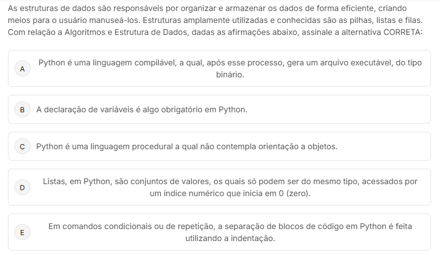 As estruturas de dados são responsáveis por organizar e armazenar OS dados de forma eficiente, criando meios para usuário manuseá-los. Estruturas amplamente utilizadas e conhecidas são as pilhas, listas e filas. Com relação a Algoritmos e Estrutura de Dados, dadas as afirmações abaixo, assinale a alternativa CORRETA: Python é uma linguagem compilável, a qual, após esse processo, gera um arquivo executável, do tipo A binário. B A declaração de variáveis é algo obrigatório em Python. C Python é uma linguagem procedural a qual não contempla orientação a objetos. Listas, em Python, são conjuntos de valores, quais podem ser do mesmo tipo, acessados por D um indice numérico que inicia em 0 (zero). Em comandos condicionais ou de repetição, a separação de blocos de código em Python é feita E utilizando a indentação.