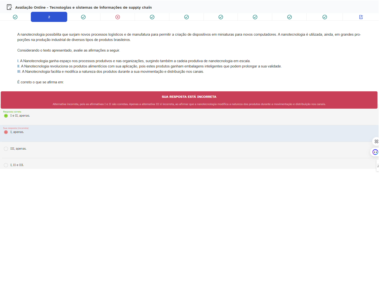 Avaliação Online Tecnologias e sistemas de informações de supply chain 2 A nanotecnologia possibilita que surjam novos processos logísticos e de manufatura para permitir a criação de dispositivos em miniaturas para novos computadores. A nanotecnologia é utilizada, ainda, em grandes pro- porções na produção industrial de diversos tipos de produtos brasileiros. Considerando texto apresentado, avalie as afirmações a seguir. I. A Nanotecnologia ganha espaço nos processos produtivos e nas organizações, surgindo também a cadeia produtiva de nanotecnologia em escala. II. A Nanotecnologia revoluciona os produtos alimentícios com sua aplicação, pois estes produtos ganham embalagens inteligentes que podem prolongar a sua validade. III. A Nanotecnologia facilita e modifica a natureza dos produtos durante a sua movimentação e distribuição nos canais. É correto que se afirma em: SUA RESPOSTA ESTÁ INCORRETA Alternativa incorreta, pois as afirmativas Ie II são corretas. Apenas a alternativa III é incorreta, ao afirmar que a nanotecnologia modifica a natureza dos produtos durante a movimentação e distribuição nos canais. Resposta correta I e II, apenas. Sua resposta (incorreta) I, apenas. III, apenas. I, II e III.