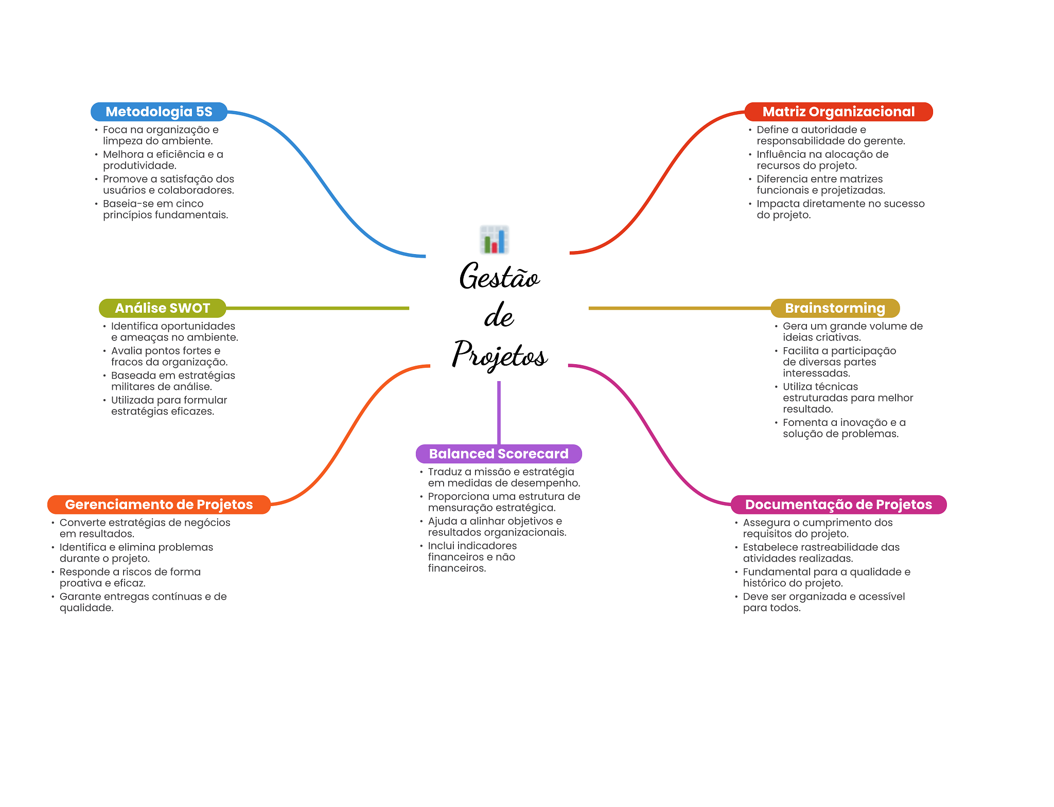 Metodologia 5S Matriz Organizacional Foca na organização e Define a autoridade e limpeza do ambiente. responsabilidade do gerente. Melhora a eficiência e a Influência na alocação de produtividade. recursos do projeto. Promove a satisfação dos Diferencia entre matrizes usuários e colaboradores. funcionais e projetizadas. Baseia-se em cinco Impacta diretamente no sucesso princípios fundamentais. do projeto. Gestão Análise SWOT de Brainstorming Identifica oportunidades Gera um grande volume de e ameaças no ambiente. ideias criativas. Avalia pontos fortes e Projetos Facilita a participação fracos da organização. de diversas partes Baseada em estratégias interessadas. militares de análise. Utiliza técnicas Utilizada para formular estruturadas para melhor estratégias eficazes. resultado. Fomenta a inovação e a solução de problemas. Balanced Scorecard Traduz a missão e estratégia em medidas de desempenho. Proporciona uma estrutura de Gerenciamento de Projetos mensuração estratégica. Documentação de Projetos Converte estratégias de negócios Ajuda a alinhar objetivos e Assegura O cumprimento dos em resultados. resultados organizacionais. requisitos do projeto. Identifica e elimina problemas Inclui indicadores Estabelece rastreabilidade das durante projeto. financeiros e não atividades realizadas. Responde a riscos de forma financeiros. Fundamental para a qualidade e proativa e eficaz. histórico do projeto. Garante entregas contínuas e de Deve ser organizada e acessível qualidade. para todos.