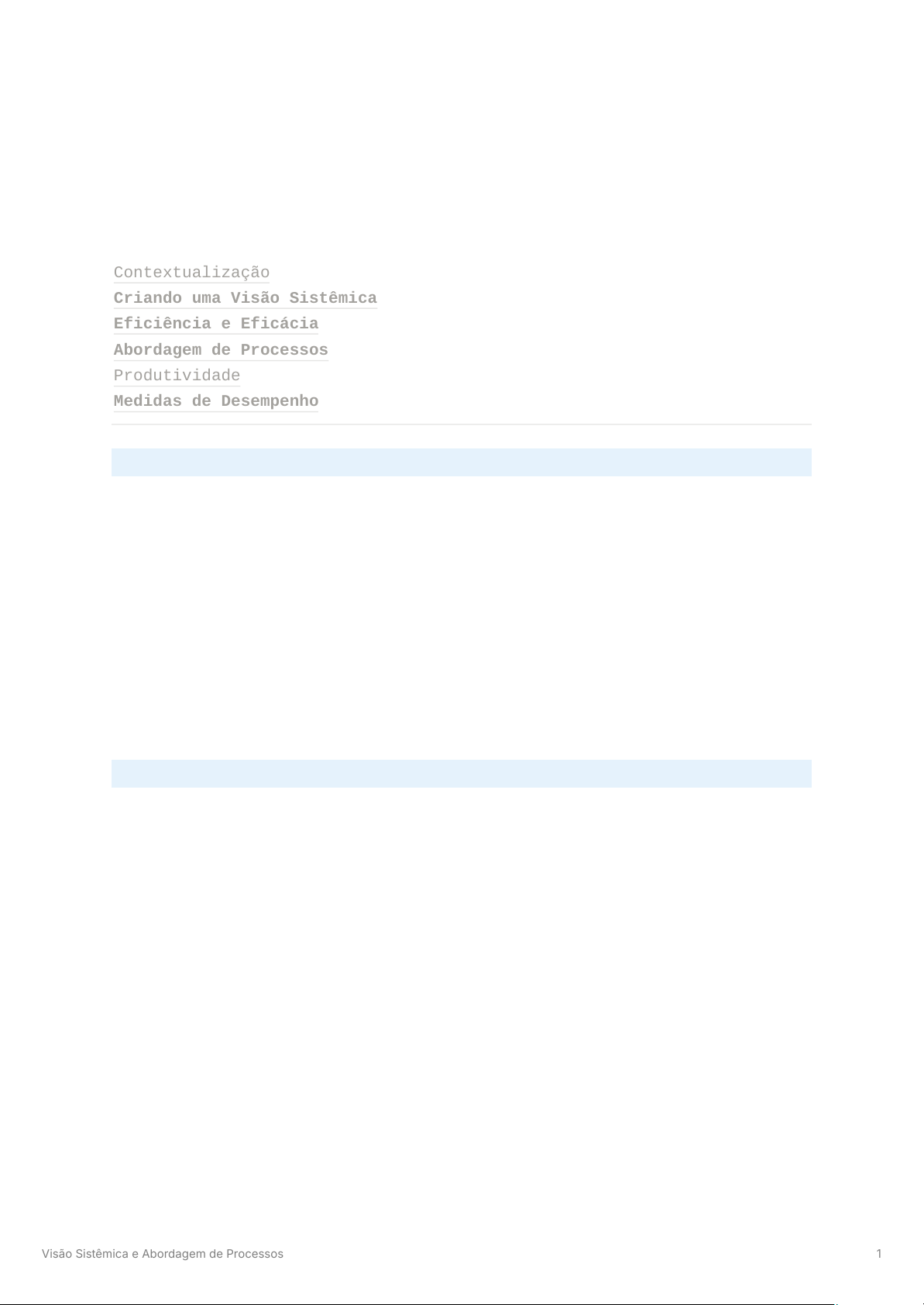 Visão Sistêmica e Abordagem de Processos Contextualização A visão sistêmica é fundamental para alcançar resultados superiores, com qualidade, e garantir vantagem em um mercado altamente competitivo. Abordaremos a influência da produtividade na busca pela competitividade, compreendendo os conceitos de eficiência e eficácia. No contexto empresarial, é essencial dispor de informações cada vez mais precisas sobre qualidade. Por fim, veremos como representar os processos em números, entendendo o que são os indicadores de desempenho e sua relevância para a produtividade. Criando uma Visão Sistêmica Um sistema pode ser compreendido como um conjunto de atividades integradas que criam valor e riqueza. Trata-se de um conjunto de partes interdependentes e dinamicamente relacionadas, que desempenham funções específicas com o propósito de alcançar objetivos comuns. Em sua essência, o sistema forma um todo único, no qual os elementos interagem de maneira sinérgica para cumprir determinada função. Contextualização Criando uma Visão Sistêmica Eficiência e Eficácia Abordagem de Processos Produtividade Medidas de Desempenho Visão Sistêmica e Abordagem de Processos 1 A visão sistêmica baseia-se em três elementos: entradas (inputs), processo de transformação e saídas (outputs), todos relacionados à fronteira do sistema. Essa fronteira delimita a empresa e o ambiente externo, estabelecendo as relações entre ambos. Os inputs são os recursos utilizados na produção de bens ou serviços, podendo ser diretos (incorporados ao produto final) ou indiretos (máquinas, equipamentos, energia). A função de transformação consiste no conjunto de atividades que convertem esses recursos em bens ou serviços de maior utilidade, os quais retornam ao ambiente. Este, por sua vez, corresponde a tudo o que envolve externamente a organização, além de suas fronteiras. Os outputs são os produtos, serviços ou informações gerados pelo sistema e devolvidos ao ambiente. Os sistemas podem ser formados por subsistemas interligados e integrados. Em qualquer operação, produtos ou serviços são gerados por meio da transformação de entradas em saídas. A visão sistêmica é essencial para o sistema da qualidade, um sistema dinâmico voltado à melhoria contínua. Seus princípios fundamentais são: foco no cliente e na qualidade; melhoria contínua de produtos e processos; e envolvimento e desenvolvimento dos recursos humanos. Visão Sistêmica e Abordagem de Processos 2 Eficiência e Eficácia Uma dúvida comum na área de negócios é a diferença entre eficiência e eficácia. Segundo Peter Drucker, eficiência é ‘fazer certo as coisas’, geralmente no nível operacional, buscando usar menos recursos como tempo, orçamento, pessoas ou matéria-prima. Eficácia é ‘fazer as coisas certas’, normalmente relacionada ao nível gerencial, focando nos objetivos corretos a serem alcançados. As medidas de eficiência incluem custo do trabalho, utilização de equipamentos, manutenção de máquinas e retorno do capital investido. A eficácia, por sua vez, refere-se a atingir os objetivos e resultados, estando relacionada aos fins e propósitos da organização. A eficácia mede o quão próximos estamos dos objetivos estabelecidos, enquanto a eficiência indica a relação entre saídas (outputs) e entradas (inputs). Abordagem de Processos Processo é o arranjo de recursos utilizado para produzir produtos e serviços. Os processos estão diretamente Visão Sistêmica e Abordagem de Processos 3 relacionados aos fluxos de objetos nas organizações. Todo trabalho realizado faz parte de um processo. Exemplo: Operação: Linha Aérea Inputs (recursos utilizados) Avião Pilotos Passageiros Equipe de Terra Processos (atividades realizadas) Check-in Transporte de passageiros Transporte de cargas Atendimento aos passageiros Outputs (resultados produzidos) Passageiros transportados Cargas transportadas Na abordagem por processos, o foco é a visualização estruturada do trabalho organizacional. Seus principais benefícios incluem: Desenvolvimento de novas habilidades, maior autonomia e compartilhamento de responsabilidades; Sistema gerencial descentralizado, estimulando cooperação e comunicação direta; Valorização do trabalho em equipe, avaliando resultados coletivos; Tomada de decisões orientada às necessidades dos clientes; Visão Sistêmica e Abordagem de Processos 4 Substituição da visão funcional pela visão do todo organizacional. A norma ISO 9001:2008 incentiva a abordagem por processos para desenvolver, implementar e melhorar a eficácia do sistema de gestão da qualidade, visando aumentar a satisfação do cliente ao atender seus requisitos. Segundo a ISO 9001:2008, a abordagem por processos permite o controle contínuo das interações entre os processos individuais e sua integração em todo o sistema. O gerenciamento de processos deve ocorrer em todos os departamentos, garantindo a satisfação de clientes internos e externos e permitindo ações corretivas sempre que necessário. Visão Sistêmica e Abordagem de Processos 5 Produtividade O termo passou a significar a relação entre o que é produzido (output) e os recursos utilizados na produção (input). Produtividade é o quociente obtido pela divisão do produzido por um dos fatores de produção. Busca contínua por melhores métodos de trabalho e produção para aumentar a produtividade ao menor custo possível. Produtividade é a medida da eficiência com que os recursos de entrada de um sistema são transformados em saídas. A produtividade é essencial para a sobrevivência das empresas, representando a relação entre os recursos utilizados e o produto final, refletindo a capacidade de produção. Exemplo prático: Qual a eficiência econômica de uma empresa que teve custos de materiais e processos de R$ 75.000,00 para gerar uma receita de R$ 90.000,00? Visão Sistêmica e Abordagem de Processos 6