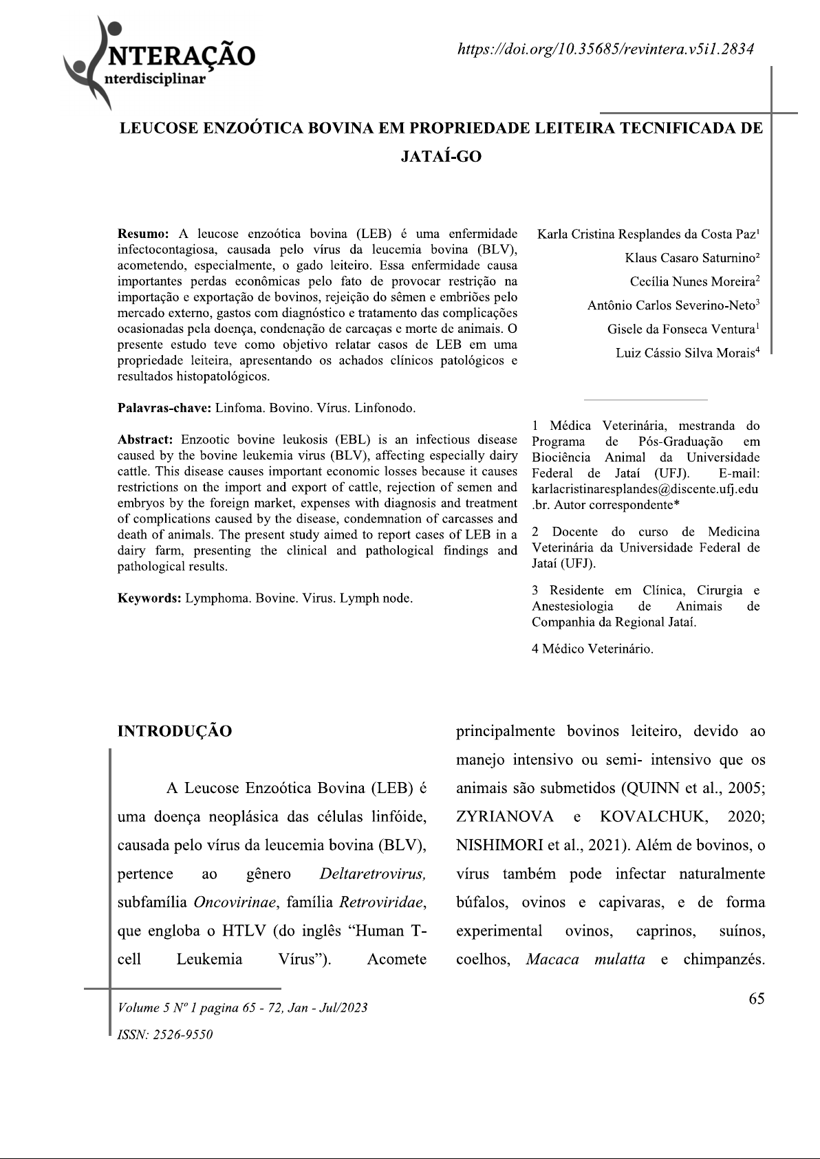 NTERAÇÃO nterdisciplinar LEUCOSE ENZOÓTICA BOVINA EM PROPRIEDADE LEITEIRA TECNIFICADA DE JATAÍ-GO Resumo: A leucose enzoótica bovina (LEB) é uma enfermidade Karla Cristina Resplandes da Costa Paz¹ infectocontagiosa, causada pelo vírus da leucemia bovina (BLV), Klaus Casaro Saturnino² acometendo, especialmente, o gado leiteiro. Essa enfermidade causa importantes perdas econômicas pelo fato de provocar restrição na Cecília Nunes Moreira² importação e exportação de bovinos, rejeição do sêmen e embriões pelo Antônio Carlos Severino-Neto³ mercado externo, gastos com diagnóstico e tratamento das complicações ocasionadas pela doença, condenação de carcaças e morte de animais. O Gisele da Fonseca Ventura¹ presente estudo teve como objetivo relatar casos de LEB em uma Luiz Cássio Silva Morais⁴ propriedade leiteira, apresentando os achados clínicos patológicos e resultados histopatológicos. Palavras-chave: Linfoma. Bovino. Vírus. Linfonodo. 1 Médica Veterinária, mestranda do Abstract: Enzootic bovine leukosis (EBL) is an infectious disease Programa de Pós-Graduação em caused by the bovine leukemia virus (BLV), affecting especially dairy Biociência Animal da Universidade cattle. This disease causes important economic losses because it causes Federal de Jataí (UFJ). E-mail: restrictions on the import and export of cattle, rejection of semen and karlacristinaresplandes@discente.ufj.edu embryos by the foreign market, expenses with diagnosis and treatment .br. Autor correspondente* of complications caused by the disease, condemnation of carcasses and death of animals. The present study aimed to report cases of LEB in a 2 Docente do curso de Medicina dairy farm, presenting the clinical and pathological findings and Veterinária da Universidade Federal de pathological results. Jataí (UFJ). 3 Residente em Clínica, Cirurgia e Keywords: Lymphoma. Bovine. Virus. Lymph node. Anestesiologia de Animais de Companhia da Regional Jataí. 4 Médico Veterinário. INTRODUÇÃO principalmente bovinos leiteiro, devido ao manejo intensivo ou semi- intensivo que os A Leucose Enzoótica Bovina (LEB) é animais são submetidos (QUINN et al., 2005; uma doença neoplásica das células linfóide, ZYRIANOVA e KOVALCHUK, 2020; causada pelo vírus da leucemia bovina (BLV), NISHIMORI et al., 2021). Além de bovinos, o pertence ao gênero Deltaretrovirus, vírus também pode infectar naturalmente subfamília Oncovirinae, família Retroviridae, búfalos, ovinos e capivaras, e de forma que engloba o HTLV (do inglês "Human T- experimental ovinos, caprinos, suínos, cell Leukemia Vírus"). Acomete coelhos, Macaca mulatta e chimpanzés. 65 Volume 5 1 pagina 65 72, Jan Jul/2023 ISSN: 2526-9550NTERAÇÃO nterdisciplinar Costa Paz et al., 2023 (MEIRELLES-BARTOLI et al., 2013). Esse Objetivou-se com o presente estudo, vírus infecta, além de células B, as células T, relatar casos de LEB em uma propriedade rural monócitos e granulócitos (BRAGA e LAAN, produtora de leite, localizada no município de 2001). A enfermidade não é considerada Jataí-GO, relacionando achados zoonose, porém as investigações científicas epidemiológicos clínicos e patológicos sobre BLV continuam (HIRSCH e LEITE, encontrados nos animais infectados em outros 2015). estudos. No Brasil, foram realizados vários levantamentos epidemiológicos sobre BLV, METODOLOGIA com auxílio dos testes sorológicos nos rebanhos, onde foi constatada elevada O estudo foi realizado em uma prevalência de BLV no rebanho. No entanto, propriedade leiteira tecnificada, localizada no apenas 5% dos animais soropositivos município de Jataí-Go, com animais das raças desenvolveram linfossarcoma. Esses animais holandesa e girolanda. A perspectiva deste apresentaram sinais clínicos e tinham no estudo ocorreu em virtude de relatos clínicos mínimo dois anos de idade. Apesar disso, o que coincidia com Leucose Enzoótica Bovina pico máximo para aparecimento dos sinais (LEB), apesar que sinais clínicos em questão característicos da doença está entre cinco a não seja patognomônico para essa sete anos (FIGHERA e GRAÇA, 2016). enfermidade. De acordo com o médico A LEB gera grandes perdas veterinário que atende a propriedade, a econômicas, visto que causa a redução da fazenda teve aumento no número de decarte produção deleite, condenação de carcaças em de animais de forma precoce, nos quais os abatedouros, gastos com medicamentos, mesmos foram encaminhados para abate. diagnóstico e mão de obra especializada, Porém, ao ser abatidos no frigorífico, os perdas reprodutivas, perdas na exportação, animais apresentaram abscessos purulentos rejeição do sêmen e embriões, imunossupressão em várias regiões da carcarça, o que levou a no organismo do animal, deixando o animal condenção de carcarça, e também a suspeita propício à infecções secundárias e morte de brucelose, que foi descartada após exames (SANTOS et al., 2013; HERNANDEZ et laboratoriais negativos. al.,2018). Assim, os animais mortos na 66 Volume 5 1 pagina 65 72, Jan Jul/2023 ISSN: 2526-9550NTERAÇÃO nterdisciplinar Costa Paz et al., 2023 propriedade foram necropsiados pelo médico substituído por álcool 70% até o momento do veterinário responsável e amostras teciduais processamento de rotina. foram encaminhadas ao Laboratório de Depois foram clivadas, desidratadas Patologia e Parasitologia Veterinária (LPPV) em álcool crescente, diafanizadas em xilol e da Universidade Federal de Jataí (UFJ). Os incluídas na parafina. Na sequência foram animais eram todas fêmeas, com idades seccionadas em micrótomo em cinco micras e variando entre dois a sete ano, que segundo as lâminas coradas pela técnica de relatos do proprietário, apresentaram queda de hematoxilina e eosina, para análise e registro produção de leite, emagrecimento em microscopia de campo claro com câmera progressivo, apatia, diarreia, dificuldade de digital Moticam 3.0 A