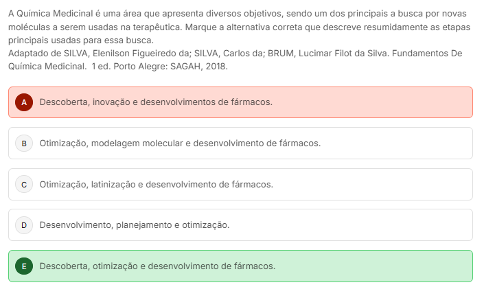 A Química Medicinal é uma que apresenta diversos objetivos, sendo um dos principais a busca por novas moléculas a serem usadas na terapêutica. Marque a alternativa correta que descreve resumidamente as etapas principais usadas para essa busca. Adaptado de SILVA, Elenilson Figueiredo da; SILVA, Carlos da; BRUM, Lucimar Filot da Silva. Fundamentos De Química Medicinal. 1 ed. Porto Alegre: SAGAH, 2018. A Descoberta, inovação e desenvolvimentos de fármacos. B Otimização, modelagem molecular e desenvolvimento de C Otimização, latinização e desenvolvimento de D Desenvolvimento, planejamento e otimização. E Descoberta, otimização e desenvolvimento de fármacos.