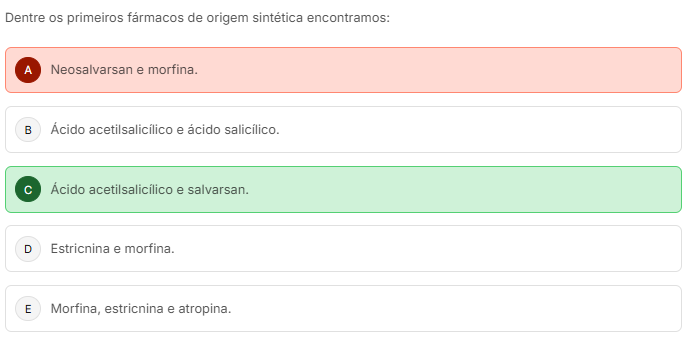 Dentre primeiros de origem sintética encontramos: A Neosalvarsan e morfina. B Ácido acetilsalicilico e ácido C Ácido e salvarsan. D Estricnina e morfina. E Morfina, estricnina e atropina.