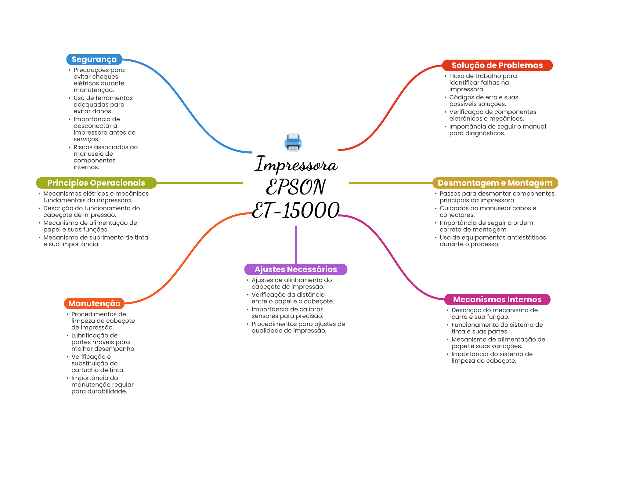 Segurança Solução de Problemas Precauções para evitar choques Fluxo de trabalho para elétricos durante identificar falhas na manutenção. impressora. Uso de ferramentas Códigos de erro e suas adequadas para possíveis soluções. evitar danos. Verificação de componentes Importância de eletrônicos e mecânicos. desconectar a Importância de seguir manual impressora antes de para diagnósticos. serviços. Riscos associados ao manuseio de componentes internos. Impressora Princípios Operacionais EPSON Desmontagem e Montagem Mecanismos elétricos e mecânicos Passos para desmontar componentes fundamentais da impressora. principais da impressora. Descrição do funcionamento do cabeçote de impressão. Cuidados ao manusear cabos e conectores. Mecanismo de alimentação de Importância de seguir a ordem papel e suas funções. correta de montagem. Mecanismo de suprimento de tinta Uso de equipamentos antiestáticos e sua importância. durante O processo. Ajustes Necessários Ajustes de alinhamento do cabeçote de impressão. Verificação da distância entre papel e cabeçote. Mecanismos Internos Manutenção Importância de calibrar Descrição do mecanismo de Procedimentos de sensores para precisão. carro e sua função. limpeza do cabeçote de impressão. Procedimentos para ajustes de Funcionamento do sistema de qualidade de impressão. tinta e suas partes. Lubrificação de partes móveis para Mecanismo de alimentação de melhor desempenho. papel e suas variações. Verificação e Importância do sistema de substituição do limpeza do cabeçote. cartucho de tinta. Importância da manutenção regular para durabilidade.