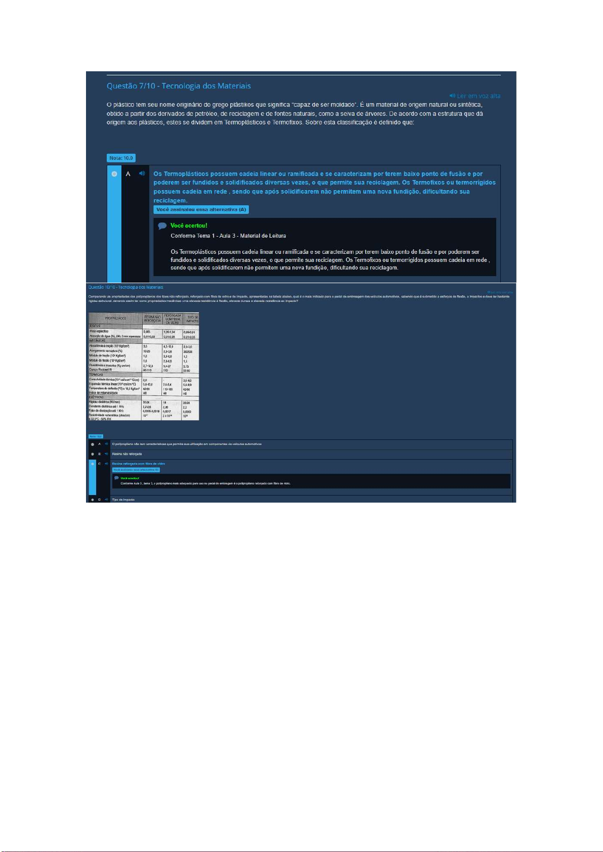 Questão 7/10 Tecnologia dos Materiais Ler em voz alta plástico tem seu nome originário do grego plástikos que significa "capaz de ser moldado". É um material de origem natural ou sintética, obtido a partir dos derivados de petróleo, de reciclagem e de fontes naturais, como a seiva de árvores. De acordo com a estrutura que dá origem aos plásticos, estes se dividem em Termoplásticos e Termofixos. Sobre esta classificação é definido que: Nota: 10.0 A Os Termoplásticos possuem cadeia linear ou ramificada e se caracterizam por terem baixo ponto de fusão e por poderem ser fundidos e solidificados diversas vezes, que permite sua reciclagem. Os Termofixos ou termorrigidos possuem cadeia em rede sendo que após solidificarem não permitem uma nova fundição, dificultando sua reciclagem. Você assinalou essa alternativa (A) Você acertou! Conforme Tema 1 Aula 3 Material de Leitura Os Termoplásticos possuem cadeia linear ou ramificada e se caracterizam por terem baixo ponto de fusão e por poderem ser fundidos e solidificados diversas vezes, que permite sua reciclagem. Os Termofixos ou termorrígidos possuem cadeia em rede sendo que após solidificarem não permitem uma nova fundição, dificultando sua reciclagem. Questão 10/10 Tecnologia dos Comparando as propriedades dos dos tipos não reforçado, reforçado com fibra vidro de impacto, apresentadas na tabela qual mais pedal do embreagem dos automotivos, sabendo que de impactos # dave for bastante rigidez estrutural, devendo assim for como propriedades mecânicas uma resistência a elevada dureza resistência impacto? PROPRIEDADES RESINA NÃO COMFIBRA DE REFORÇADA DE VIDRO IMPACTO FISICAS Peso 0,905 1,06-1,24 0,89-0,91 de 24h, 3 nn espessure 0,01-0,03 MECÁNICAS tração 3,5 Alongamento na (%) 10-20 300500 de tração 12 3,0-6,0 1,5 impactos 2,7-12,0 5,4-27 5,75 Rockwell R 80-110 110 50-85 TERMICAS Condutividade 2,8 5,6-10,0 5,6-8,9 Temperatura de 42-60 110-165 42-60 Indice do inflamabilidade HB HB HB ELETRICAS 18 Constante 1 KHz 2,3 Fator de 1 KHz 0,0005-0,0018 0,0017 0,0003 Resistividade A D não que permita componentes de automotivos Resina não reforçada de vidro - no de de D Tipo de Impacto