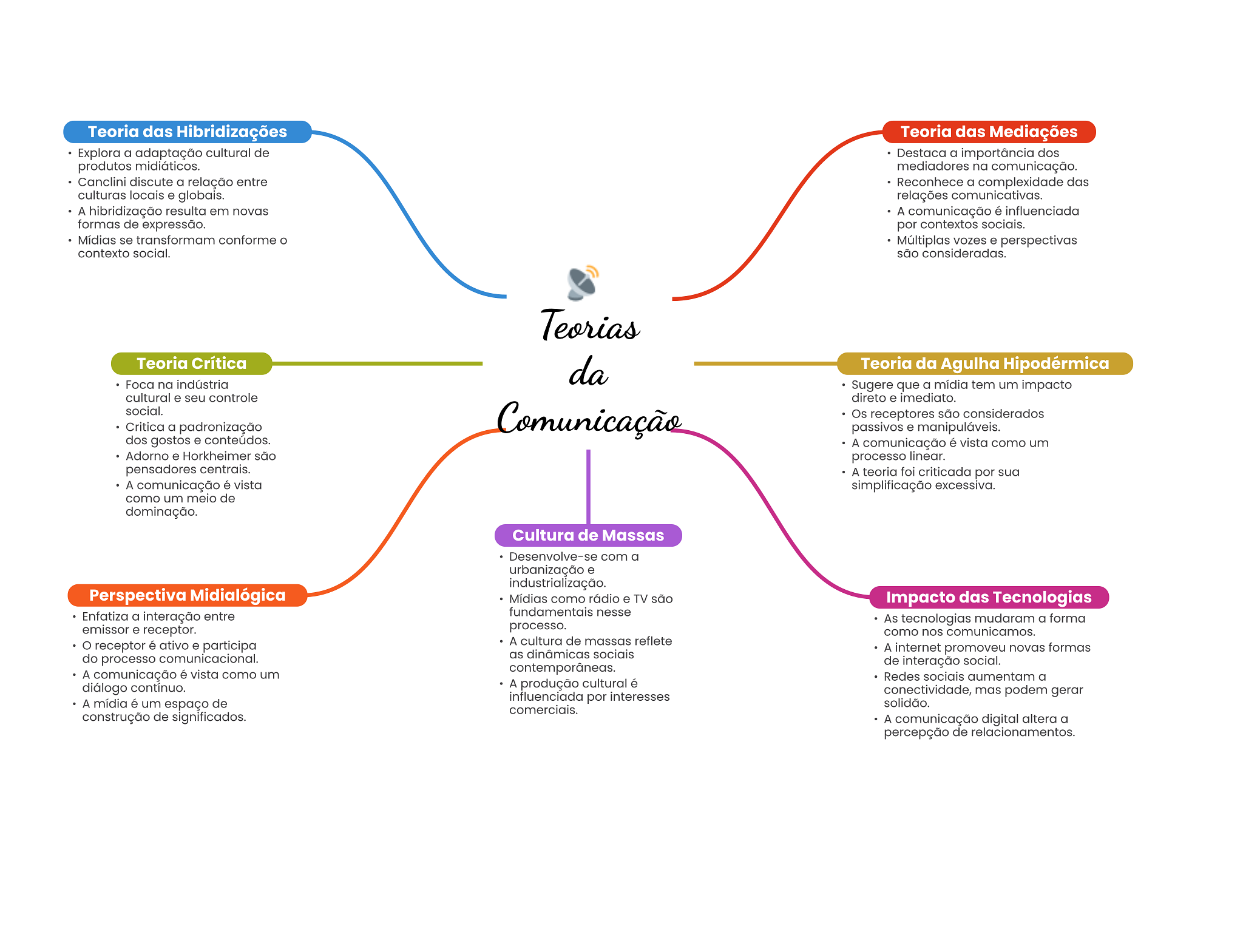 Teoria das Hibridizações Teoria das Mediações Explora a adaptação cultural de Destaca a importância dos produtos midiáticos. mediadores na comunicação. Canclini discute a relação entre Reconhece a complexidade das culturas locais e globais. relações comunicativas. A hibridização resulta em novas A comunicação é influenciada formas de expressão. por contextos sociais. Mídias se transformam conforme Múltiplas vozes e perspectivas contexto social. são consideradas. Teorias Teoria Crítica da Teoria da Agulha Hipodérmica Foca na indústria Sugere que a mídia tem um impacto cultural e seu controle direto e imediato. social. Comunicação Os receptores são considerados Critica a padronização passivos e manipuláveis. dos gostos e conteúdos. A comunicação é vista como um Adorno e Horkheimer são processo linear. pensadores centrais. A teoria foi criticada por sua A comunicação é vista simplificação excessiva. como um meio de dominação. Cultura de Massas Desenvolve-se com a urbanização e industrialização. Perspectiva Midialógica Mídias como rádio e TV são Impacto das Tecnologias Enfatiza a interação entre fundamentais nesse As tecnologias mudaram a forma emissor e receptor. processo. como nos comunicamos. receptor é ativo e participa A cultura de massas reflete do processo comunicacional. as dinâmicas sociais A internet promoveu novas formas contemporâneas. de interação social. A comunicação é vista como um Redes sociais aumentam a diálogo contínuo. A produção cultural é influenciada por interesses conectividade, mas podem gerar A mídia é um espaço de solidão. comerciais. construção de significados. A comunicação digital altera a percepção de