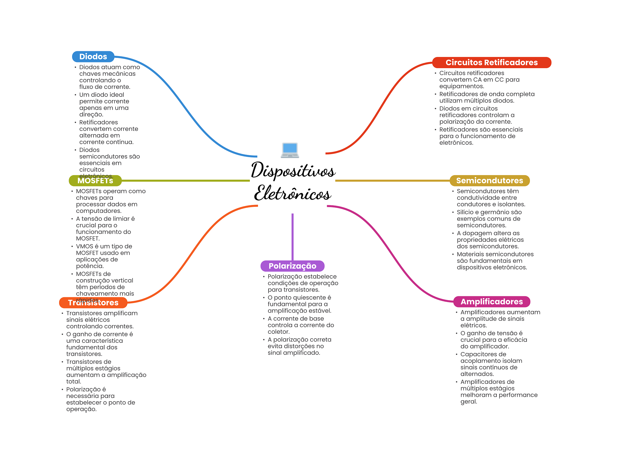 Diodos Circuitos Retificadores Diodos atuam como chaves mecânicas Circuitos retificadores controlando convertem CA em CC para fluxo de corrente. equipamentos. Um diodo ideal Retificadores de onda completa permite corrente utilizam múltiplos diodos. apenas em uma Diodos em circuitos direção. retificadores controlam a Retificadores polarização da corrente. convertem corrente Retificadores são essenciais alternada em para funcionamento de corrente contínua. eletrônicos. Diodos semicondutores são essenciais em circuitos eletrônicos Dispositivos Semicondutores MOSFETs operam como Eletrônicos Semicondutores têm chaves para condutividade entre processar dados em condutores e isolantes. computadores. Silício e germânio são A tensão de limiar é exemplos comuns de crucial para semicondutores. funcionamento do A dopagem altera as MOSFET. propriedades elétricas VMOS é um tipo de dos semicondutores. MOSFET usado em Materiais semicondutores aplicações de são fundamentais em potência. Polarização dispositivos eletrônicos. MOSFETs de Polarização estabelece construção vertical condições de operação têm períodos de para transistores. chaveamento mais ponto quiescente é fundamental para a Amplificadores Transistores amplificam amplificação estável. Amplificadores aumentam sinais elétricos A corrente de base a amplitude de sinais controlando correntes. controla a corrente do elétricos. ganho de corrente é coletor. ganho de tensão é uma característica A polarização correta crucial para a eficácia fundamental dos evita distorções no do amplificador. transistores. sinal amplificado. Capacitores de Transistores de acoplamento isolam múltiplos estágios sinais contínuos de aumentam a amplificação alternados. total. Amplificadores de Polarização é múltiplos estágios necessária para melhoram a performance estabelecer ponto de geral. operação.