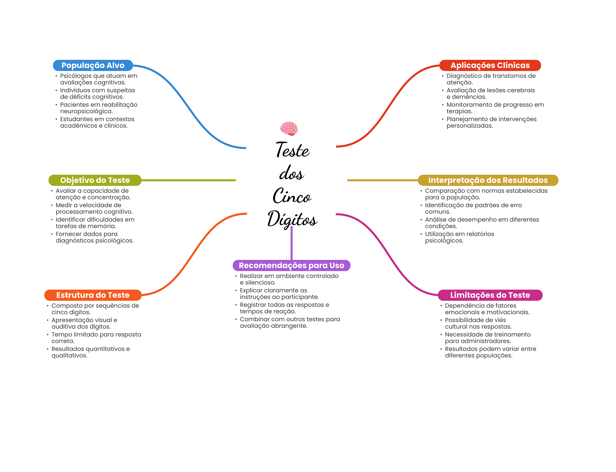 População Alvo Aplicações Clínicas Psicólogos que atuam em Diagnóstico de transtornos de avaliações cognitivas. atenção. Indivíduos com suspeitas Avaliação de lesões cerebrais de déficits cognitivos. e demências. Pacientes em reabilitação Monitoramento de progresso em neuropsicológica. terapias. Estudantes em contextos Planejamento de intervenções acadêmicos e clínicos. personalizadas. Teste dos Objetivo do Teste Interpretação dos Resultados Avaliar a capacidade de atenção e concentração. Cinco Comparação com normas estabelecidas para a população. Medir a velocidade de Identificação de padrões de erro processamento cognitivo. comuns. Identificar dificuldades em Análise de desempenho em diferentes tarefas de memória. condições. Fornecer dados para Utilização em relatórios diagnósticos psicológicos. psicológicos. Recomendações para Uso Realizar em ambiente controlado e silencioso. Explicar claramente as Estrutura do Teste instruções ao participante. Limitações do Teste Composto por sequências de Registrar todas as respostas e Dependência de fatores cinco dígitos. tempos de reação. emocionais e motivacionais. Apresentação visual e Combinar com outros testes para Possibilidade de viés auditiva dos dígitos. avaliação abrangente. cultural nas respostas. Tempo limitado para resposta Necessidade de treinamento correta. para administradores. Resultados quantitativos e Resultados podem variar entre qualitativos. diferentes populações.