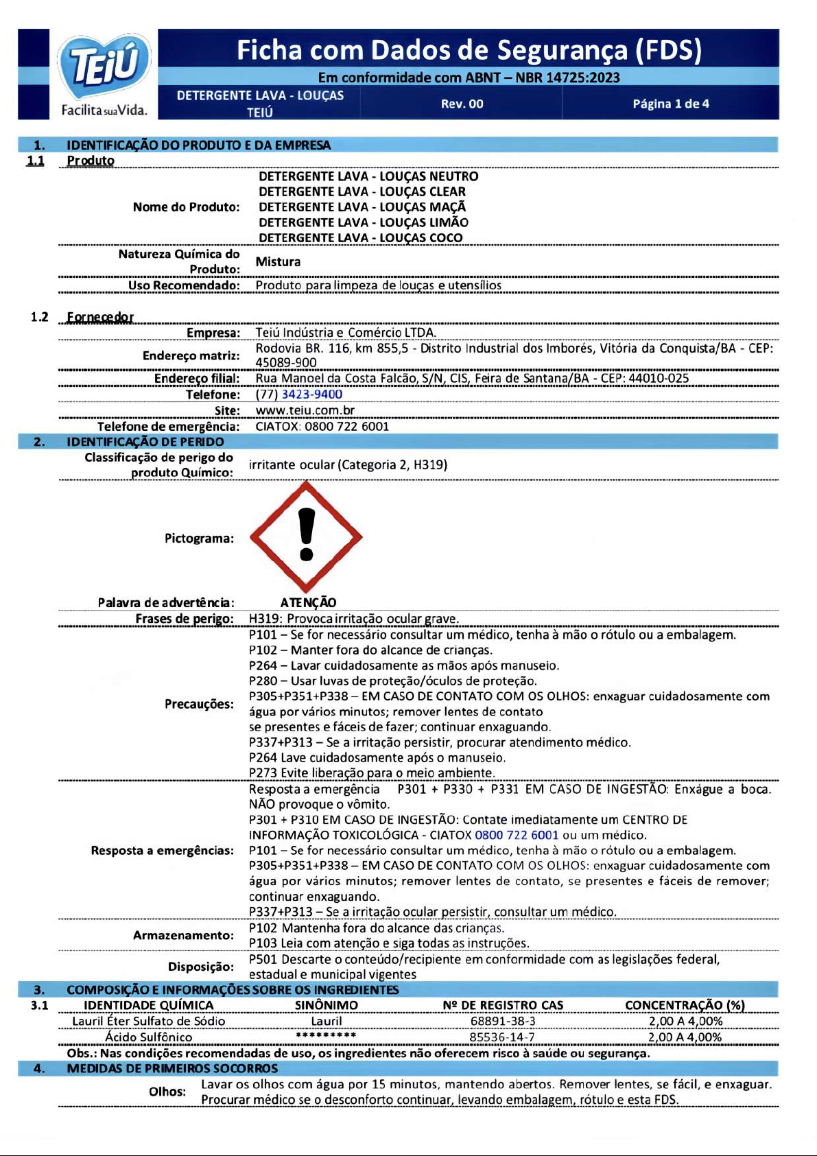 TEiÚ Ficha com Dados de Segurança (FDS) Em conformidade com ABNT NBR 14725:2023 DETERGENTE LAVA LOUÇAS Facilita sua Vida. Rev. 00 TEIÚ Página 1 de 4 1. IDENTIFICAÇÃO DO PRODUTO E DA EMPRESA 1.1 Produto DETERGENTE LAVA LOUÇAS NEUTRO DETERGENTE LAVA LOUÇAS CLEAR Nome do Produto: DETERGENTE LAVA LOUÇAS MAÇÃ DETERGENTE LAVA LOUÇAS LIMÃO DETERGENTE LAVA LOUÇAS Natureza Química do Mistura Produto: Uso Recomendado: Produto para limpeza de louças e utensílios 1.2 Fornecedor Empresa: Teiú Indústria e Comércio LTDA. Rodovia BR. 116, km 855,5 Distrito Industrial dos Imborés, Vitória da Conquista/BA - CEP: Endereço matriz: 45089-900 Endereço filial: Rua Manoel da Costa Falcão, S/N, CIS, Feira de Santana/BA CEP: 44010-025 Telefone: Site: www.teiu.com.br Telefone de emergência: CIATOX: 0800 722 6001 2. IDENTIFICAÇÃO DE PERIDO Classificação de perigo do irritante ocular (Categoria 2, H319) produto Químico: Pictograma: Palavra de advertência: ATENÇÃO Frases de perigo: H319: Provoca irritação ocular grave. P101 Se for necessário consultar um médico, tenha à mão o rótulo ou a embalagem. P102 Manter fora do alcance de crianças. P264 Lavar cuidadosamente as mãos após manuseio. P280 Usar luvas de proteção/óculos de proteção. P305+P351+P338 EM CASO DE CONTATO COM OLHOS: enxaguar cuidadosamente com Precauções: água por vários minutos; remover lentes de contato se presentes e fáceis de fazer; continuar enxaguando. P337+P313 Se a irritação persistir, procurar atendimento médico. P264 Lave cuidadosamente após o manuseio. P273 Evite liberação para o meio ambiente. Resposta a emergência P301 + P330 + P331 EM CASO DE INGESTÃO: Enxágue a boca. NÃO provoque o vômito. P301 + P310 EM CASO DE INGESTÃO: Contate imediatamente um CENTRO DE INFORMAÇÃO TOXICOLÓGICA CIATOX 0800 722 6001 ou um médico. Resposta a emergências: P101 Se for necessário consultar um médico, tenha à mão rótulo ou a embalagem. P305+P351+P338 EM CASO DE CONTATO COM os OLHOS: enxaguar cuidadosamente com água por vários minutos; remover lentes de contato, se presentes e fáceis de remover; continuar enxaguando. P337+P313 Se a irritação ocular persistir, consultar um médico. P102 Mantenha fora do alcance das crianças. Armazenamento: P103 Leia com atenção e siga todas as instruções. P501 Descarte o conteúdo/recipiente em conformidade com as legislações federal, Disposição: estadual e municipal vigentes 3. COMPOSIÇÃO E INFORMAÇÕES SOBRE INGREDIENTES 3.1 IDENTIDADE QUÍMICA SINÔNIMO DE REGISTRO CAS CONCENTRAÇÃO (%) Lauril Éter Sulfato de Sódio Lauril 68891-38-3 2,00 A 4,00% Ácido Sulfônico 85536-14-7 2,00 A 4,00% Obs.: Nas condições recomendadas de uso, os ingredientes não oferecem risco à saúde ou segurança. 4. MEDIDAS DE PRIMEIROS SOCORROS Olhos: Lavar os olhos com água por 15 minutos, mantendo abertos. Remover lentes, se fácil, e enxaguar. Procurar médico se o desconforto continuar, levando embalagem, rótulo e esta FDS.TEiÚ Ficha com Dados de Segurança (FDS) Em conformidade com ABNT NBR 14725:2023 DETERGENTE LAVA LOUÇAS Facilita Vida. Rev. 00 TEIÚ Página 2 de 4 Em grandes quantidades, remover roupas e lavar a pele. Se houver sintomas, contate CIATOX 0800 Pele: 6001 ou procure médico com embalagem, rótulo e/ou esta FDS. Inalação: Levar a vitima ao fresco e, em caso de intoxicação, procurar ajuda médica com esta FDS. NÃO INDUZA VÔMITO. Lave a boca com água. Nunca nada por via oral a pessoas inconscientes. Ingestão: Contate CIATOX 0800 ou procure médico com embalagem, rótulo e esta FDS. Nota para médico: Avaliar a composição descrita no também descrita no seção 3. 5. MEDIDAS DE COMBATE A INCÊNDIO Meios de extinção: Água em jato neblina, pó seco, dióxido de carbono ou espuma. Procedimentos de combate ao Resfriar com neblina d'água, os recipientes que estiverem expostos ao fogo. Fogo: Remover os recipientes da área de fogo, se isso puder ser feito sem risco. Perigos especificos referente as Não deve ser aplicado jato de água diretamente sobre fontes energizadas no local (se medidas de combate ao houver). Permanecer no local apenas pessoas essenciais e protegidas Afaste imediatamente todas as pessoas não autorizadas da área e inicie a evacuação. Medidas de proteção da equipe Mantenha a área isolada, especialmente de fontes de ignição. Utilize os Equipamentos de combate a incêndio: de Proteção Individual apropriados, óculos de segurança, luvas, vestimentas de proteção, botas de borracha e máscara de proteção respiratória. 6. MEDIDAS DE CONTROLE DERRAMAMENTO OU VAZAMENTO Para o pessoal que não faz parte Isolar e sinalizar a área. Não tocar no material ou recipientes danificados sem EPI (ver do serviço de emergência: seção 8). Evitar contato com os olhos. Para pessoal de serviço de Usar EPI completo: óculos contra respingos, protetor facial (em casos extremos), luvas emergência: de proteção, avental e vestuário em PVC ou equivalente, botas de borracha ou PVC. Precauções com o meio Evitar que o produto atinja água, esgoto ou vegetação. Notificar autoridades e ambiente: vizinhos, se necessário. Agir conforme legislação local. Procedimentos em caso de Conter o vazamento e isolar a área. Absorver pequenos volumes com areia, argila ou vazamento ou derrame: terra. Armazenar em recipientes adequados para reciclagem ou descarte. Métodos de eliminação dos Para destinação final, proceder conforme a Seção 13 desta FDS residuos: 7. MANUSEIO E ARMAZENAMENTO Prevenção de exposição do Se necessário, tratar com medidas de suporte, incluindo correção hidroeletrolitica, trabalhador: metabólica e assistência respiratória. Medidas de higiene: Não coma, beba ou fume durante o uso. Retire roupas e EPIs contaminados antes de acessar áreas de alimentação e lave-os antes de reutilizar. Precauções e orientações para 0 LEIA ATENTAMENTE o ANTES DE USAR o PRODUTO. Manter distante de 