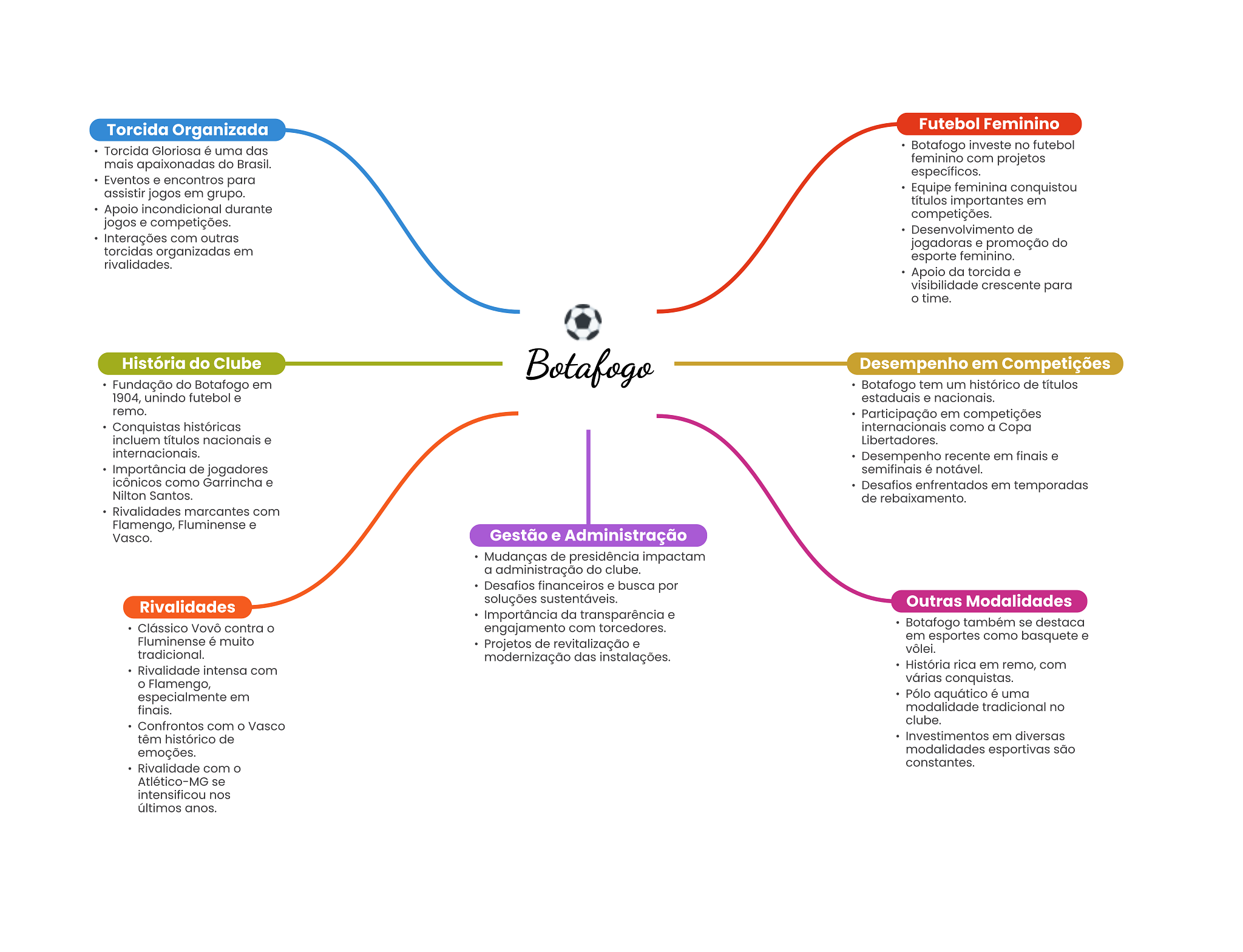 Torcida Organizada Futebol Feminino Torcida Gloriosa é uma das Botafogo investe no futebol mais apaixonadas do Brasil. feminino com projetos específicos. Eventos e encontros para assistir jogos em grupo. Equipe feminina conquistou títulos importantes em Apoio incondicional durante competições. jogos e competições. Desenvolvimento de Interações com outras jogadoras e promoção do torcidas organizadas em esporte feminino. rivalidades. Apoio da torcida e visibilidade crescente para time. História do Clube Botafogo Desempenho em Competições Fundação do Botafogo em Botafogo tem um histórico de títulos 1904, unindo futebol e estaduais e nacionais. remo. Participação em competições Conquistas históricas internacionais como a Copa incluem títulos nacionais e Libertadores. internacionais. Desempenho recente em finais e Importância de jogadores semifinais é notável. icônicos como Garrincha e Desafios enfrentados em temporadas Nilton Santos. de rebaixamento. Rivalidades marcantes com Flamengo, Fluminense e Vasco. Gestão e Administração Mudanças de presidência impactam a administração do clube. Desafios financeiros e busca por Rivalidades soluções sustentáveis. Outras Modalidades Importância da transparência e Clássico Vovô contra engajamento com torcedores. Botafogo também se destaca Fluminense é muito em esportes como basquete e Projetos de revitalização e vôlei. tradicional. modernização das instalações. Rivalidade intensa com História rica em remo, com O Flamengo, várias conquistas. especialmente em Pólo aquático é uma finais. modalidade tradicional no clube. Confrontos com Vasco têm histórico de Investimentos em diversas emoções. modalidades esportivas são Rivalidade com constantes. Atlético-MG se intensificou nos últimos anos.