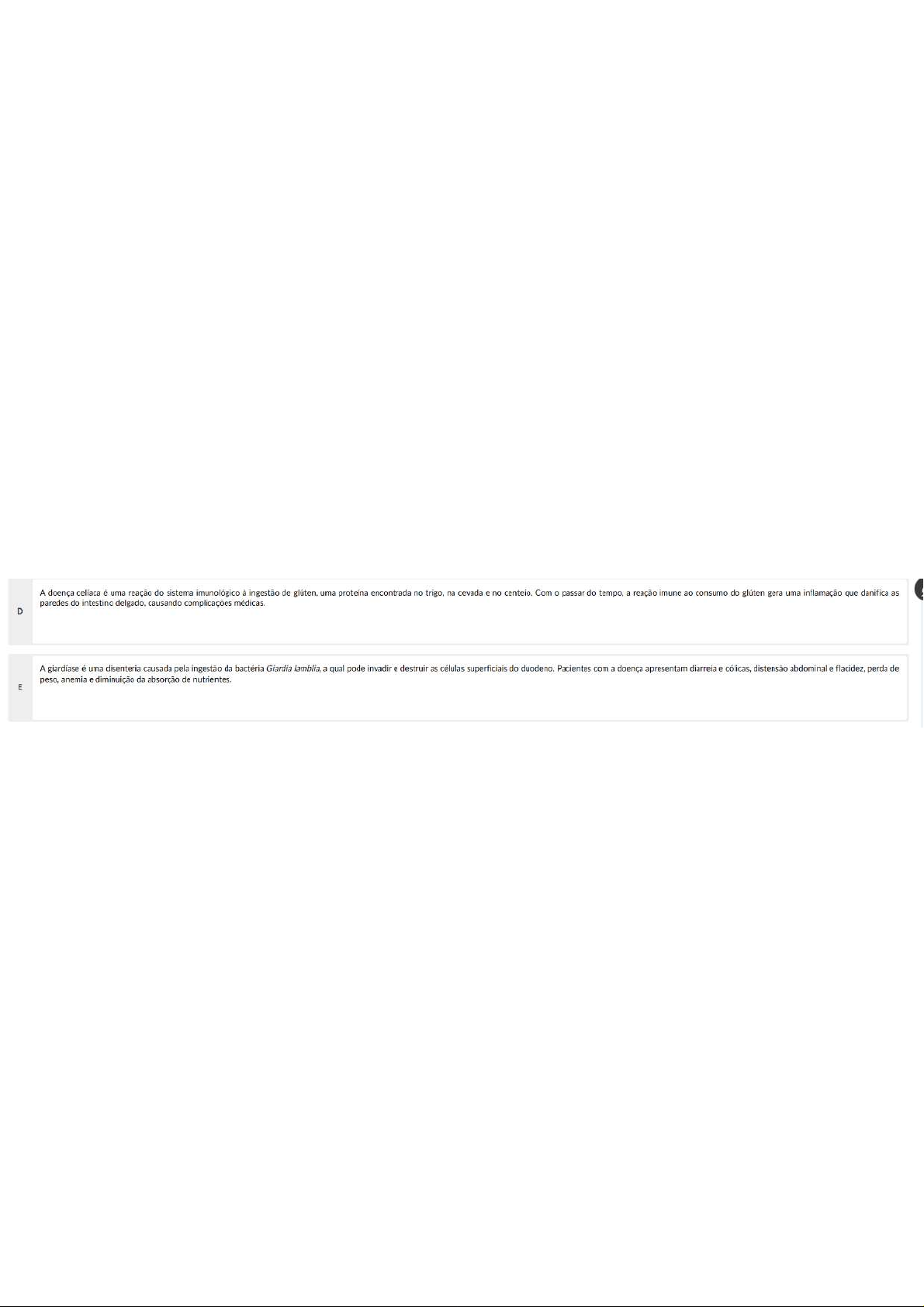 A doença uma reação do sistema imunológico à ingestão de uma proteína encontrada no trigo, na cevada e no centeio. Com passar do tempo, a reação imune ao consumo do glúten gera uma inflamação que danifica as paredes do intestino causando complicações médicas. D A é uma disenteria causada pela ingestão da bactéria Giardia lamblia, a qual pode invadir e destruir as células superficiais do duodeno. Pacientes com a doença apresentam diarreia e cólicas, distensão abdominal e flacidez, perda de peso, anemia e diminuição da absorção de nutrientes. EQuestão 34 da gripe espanhola, causador da pandemia de 1918 que matou milhões de pessoas, foi recentemente recriado em laboratório. foi isolado dos tecidos de uma enterrada em solo gelado e seu genoma foi completamente sequenciado. A partir da sequência obtida, genomas virais foram sintetizados in vitro e vírus ativos foram obtidos por multiplicação em células de rim humano mantidas em cultura. Uma série de desdobramentos pode ser consequência desse conjunto de procedimentos, EXCETO que esses vírus A permitam realizar experimentos com 0 objetivo de identificar exatamente as posições no genoma humano em que se incorporam. B representem perigo para a pois há risco de que as informações agora disponíveis possibilitem seu como arma biológica. permitam que os diferentes genes neles presentes sejam estudados no futuro para se entender grau de virulência de seu ataque. D tragam um grande benefício para a humanidade uma vez que podem ser usados para planejamento de novas drogas e construção de vacinas preventivas. E permitam a identificação de proteínas codificadas pela linhagem de 1918 que estão presentes em linhagens atuais.Questão 33 A giardiase é uma doença parasitária causada pelo protozoário flagelado Giardia lamblia. Ele se apresenta morfologicamente na forma de e sendo primeiro responsável por contaminar hospedeiro, causando os sintomas diagnóstico é feito através do A sequência que completa CORRETAMENTE as lacunas a seguinte: A Cisto, diarreia com esteatorreia, dor abdominal, perda do apetite, exame de fezes. B Tripomastigota, amastigota, calafrios, vômitos, inchaço, exame de sangue. C febre. exame de fezes. D febre, tremor, palidez, exame de sangue. E diarreia sanguinolenta, dor abdominal, perda do apetite, exame de