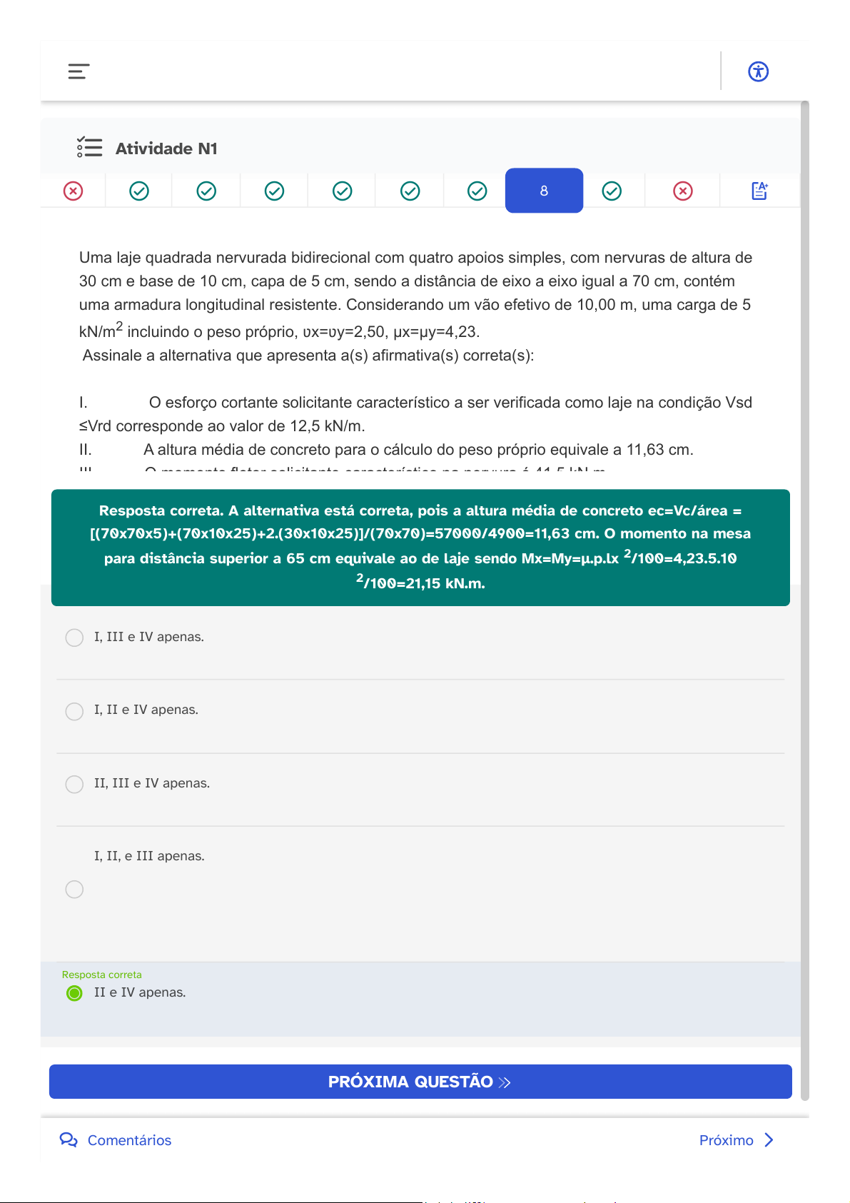 Atividade N1 Uma laje quadrada nervurada bidirecional com quatro apoios simples, com nervuras de altura de 30 cm e base de 10 cm, capa de 5 cm, sendo a distância de eixo a eixo igual a 70 cm, contém uma armadura longitudinal resistente. Considerando um vão efetivo de 10,00 m, uma carga de 5 kN/m2 incluindo o peso próprio, ʋx=ʋy=2,50, μx=μy=4,23. Assinale a alternativa que apresenta a(s) afirmativa(s) correta(s): I. O esforço cortante solicitante característico a ser verificada como laje na condição Vsd ≤Vrd corresponde ao valor de 12,5 kN/m. II. A altura média de concreto para o cálculo do peso próprio equivale a 11,63 cm. III O momento fletor solicitante característico na nervura é 41 5 kN m Resposta correta. A alternativa está correta, pois a altura média de concreto ec=Vc/área = [(70x70x5)+(70x10x25)+2.(30x10x25)]/(70x70)=57000/4900=11,63 cm. O momento na mesa para distância superior a 65 cm equivale ao de laje sendo Mx=My=µ.p.lx 2/100=4,23.5.10 2/100=21,15 kN.m. I, III e IV apenas. I, II e IV apenas. II, III e IV apenas. I, II, e III apenas. II e IV apenas. Resposta correta PRÓXIMA QUESTÃO 8 Próximo Comentários