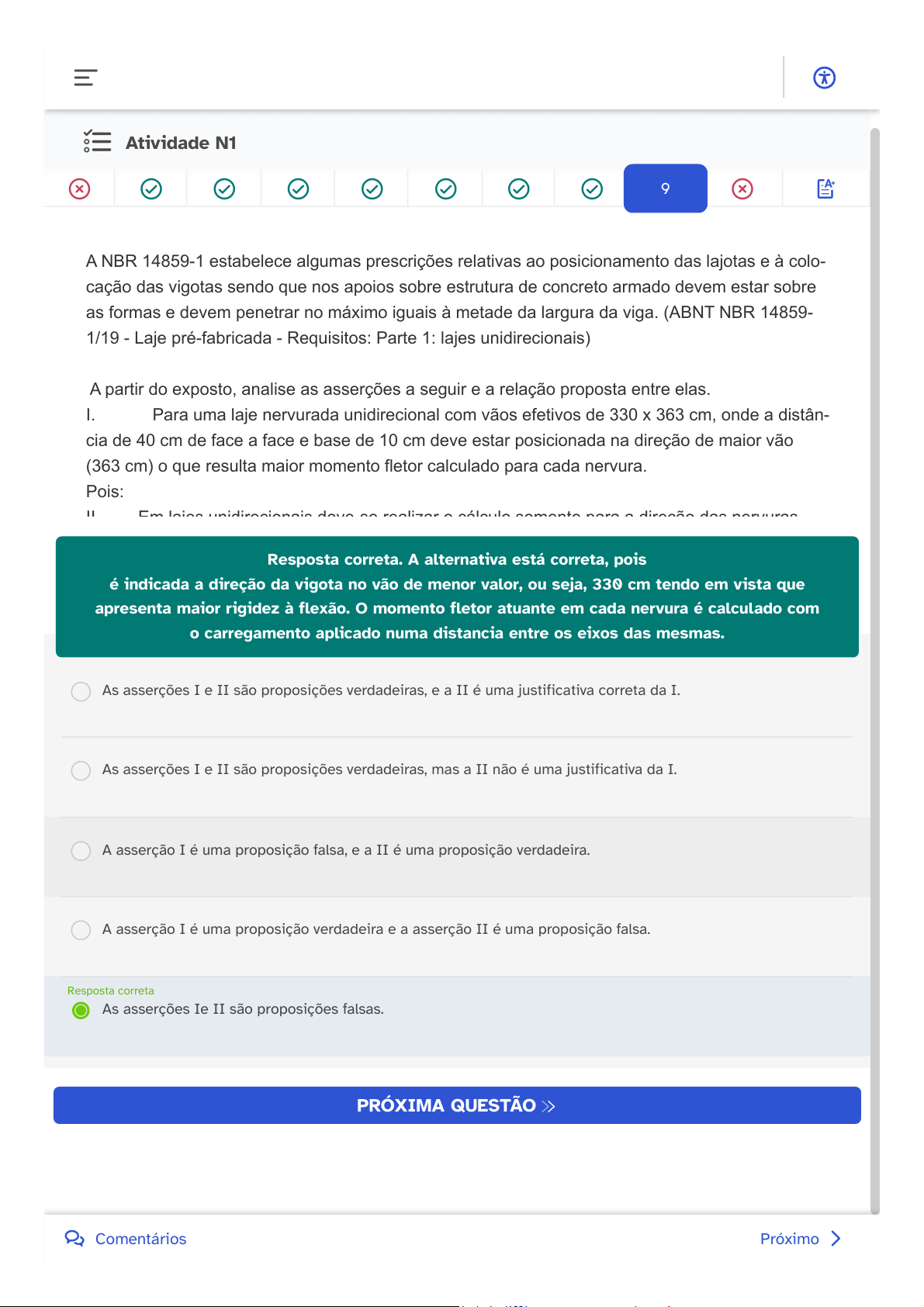 Atividade N1 A NBR 14859-1 estabelece algumas prescrições relativas ao posicionamento das lajotas e à colo- cação das vigotas sendo que nos apoios sobre estrutura de concreto armado devem estar sobre as formas e devem penetrar no máximo iguais à metade da largura da viga. (ABNT NBR 14859- 1/19 - Laje pré-fabricada - Requisitos: Parte 1: lajes unidirecionais) A partir do exposto, analise as asserções a seguir e a relação proposta entre elas. I. Para uma laje nervurada unidirecional com vãos efetivos de 330 x 363 cm, onde a distân- cia de 40 cm de face a face e base de 10 cm deve estar posicionada na direção de maior vão (363 cm) o que resulta maior momento fletor calculado para cada nervura. Pois: II Em lajes unidirecionais deve se realizar o cálculo somente para a direção das nervuras Resposta correta. A alternativa está correta, pois é indicada a direção da vigota no vão de menor valor, ou seja, 330 cm tendo em vista que apresenta maior rigidez à flexão. O momento fletor atuante em cada nervura é calculado com o carregamento aplicado numa distancia entre os eixos das mesmas. As asserções I e II são proposições verdadeiras, e a II é uma justificativa correta da I. As asserções I e II são proposições verdadeiras, mas a II não é uma justificativa da I. A asserção I é uma proposição falsa, e a II é uma proposição verdadeira. A asserção I é uma proposição verdadeira e a asserção II é uma proposição falsa. As asserções Ie II são proposições falsas. Resposta correta PRÓXIMA QUESTÃO 9 Próximo Comentários