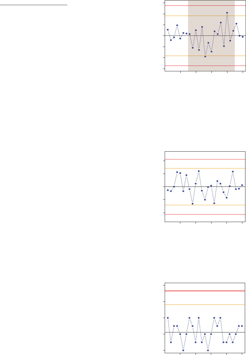 247Chapter 15 Quality Assurance . . R 3 77 10 1 67 2.00 ppm ppm ppm 100 5%#= - = Because this recovery is within the limit of ±10%, the laboratory spike’s recovery is acceptable, suggesting a time-dependent change in the analyte’s concentration. 7. he mean and the standard deviation for the 25 samples are 34.01 ppm and 1.828 ppm, respectively, which gives us the following warn- ing limits and control limits . ( ) ( . ) .UCL 34 01 3 1 828 39 5= + = . ( ) ( . ) .U LW 34 01 1 828 37 72= + = . ( ) ( . ) .LLW 34 01 1 828 30 42= - = . ( ) ( . ) .L LC 34 01 1 8283 28 5= - = Figure SM15.1 shows the property control chart. Note that the high- lighted region contains 14 consecutive cycles (15 samples) in which the results oscillate up and down, indicating that the system is not in a state of statistical control. 8. he mean and the standard deviation for the 25 samples are 99.84% and 14.08%, respectively, which gives us the following warning limits and control limits ( ) ( ). . .UCL 399 84 14 08 142 1= + = . ( ) ( . ) .UWL 99 84 14 082 128 0= + = . ( ) ( . ) .LWL 99 84 14 082 71 7= =- . ( ) ( . ) .LCL 99 84 3 14 08 57 6= - = Figure SM15.2 shows the property control chart, which has no fea- tures to suggest that the system is not in a state of statistical control. 9. he 25 range values are 4, 1, 3, 3, 2, 0, 2, 4, 3, 1, 4, 1, 2, 0, 2, 4, 3, 4, 1, 1, 2, 1, 2, 3, 3, with a mean of 2.24. he control and warning limits, therefore, are ( . ) ( . ) .UCL 3 267 2 24 7 3= = ( ) ( . ). .UWL 2 242 512 5 6= = Figure SM15.2 shows the precision control chart, which has no fea- tures to suggest that the system is not in a state of statistical control. Figure SM15.1 Property control chart for the data in Problem 7. he highlighted re- gion shows 14 consecutive cycles in which the results oscillate up and down, a sign that system is not in a state of statistical control. Figure SM15.2 Property control chart for the data in Problem 8. Figure SM15.3 Precision control chart for the data in Problem 9. 5 10 15 20 25 6 0 8 0 1 0 0 1 2 0 1 4 0 sample number re co v e ry UCL UWL CL LWL LCL 5 10 15 20 25 0 2 4 6 8 sample number ra n g e UCL UWL CL 5 10 15 20 25 2 8 3 0 3 2 3 4 3 6 3 8 4 0 sample number co n ce n tr a ti o n ( p p m ) UCL UWL CL LWL LCL